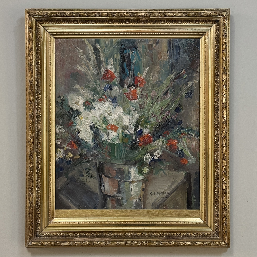 The painting has an immediately striking decorative quality, with a strong sense of composition and a palette that is both vibrant and elegant. The original gilded frame complements it beautifully and adds to its traditional European character. Full of charm and visual interest, this is a handsome and spirited floral still life that would bring warmth, color, and old-world beauty to a bedroom, sitting room, dining room, or layered gallery wall.