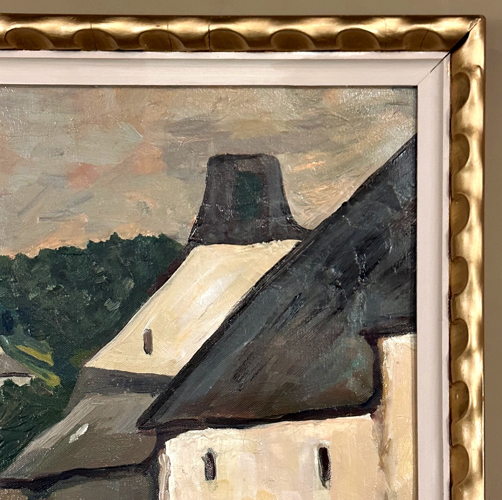 The painting is presented in a complementary carved frame with gilt accents, enhancing its warmth without overpowering the composition. Measuring approximately 24 x 30.5 inches (canvas), it offers a pleasing scale for placement above a commode, console, or mantel.