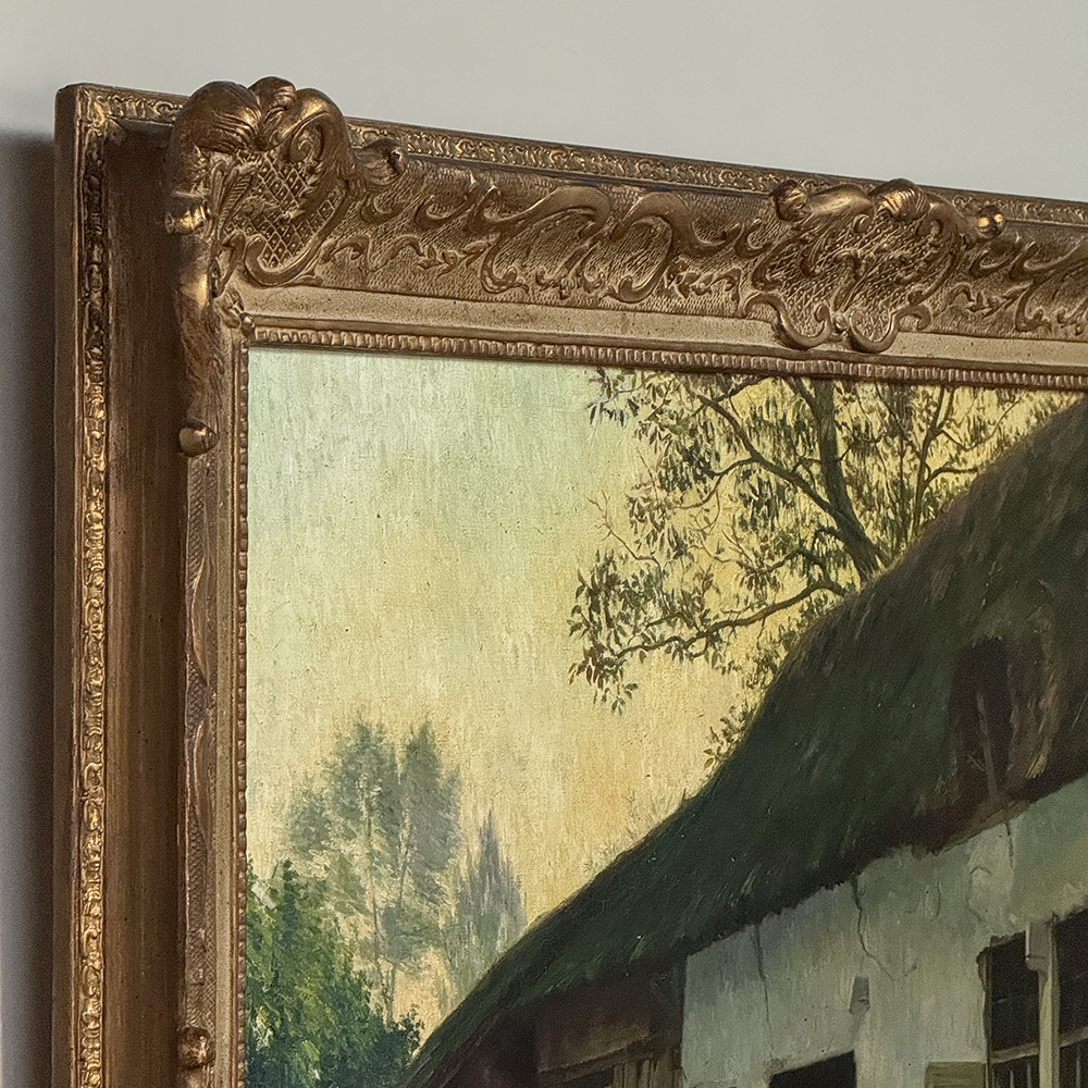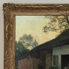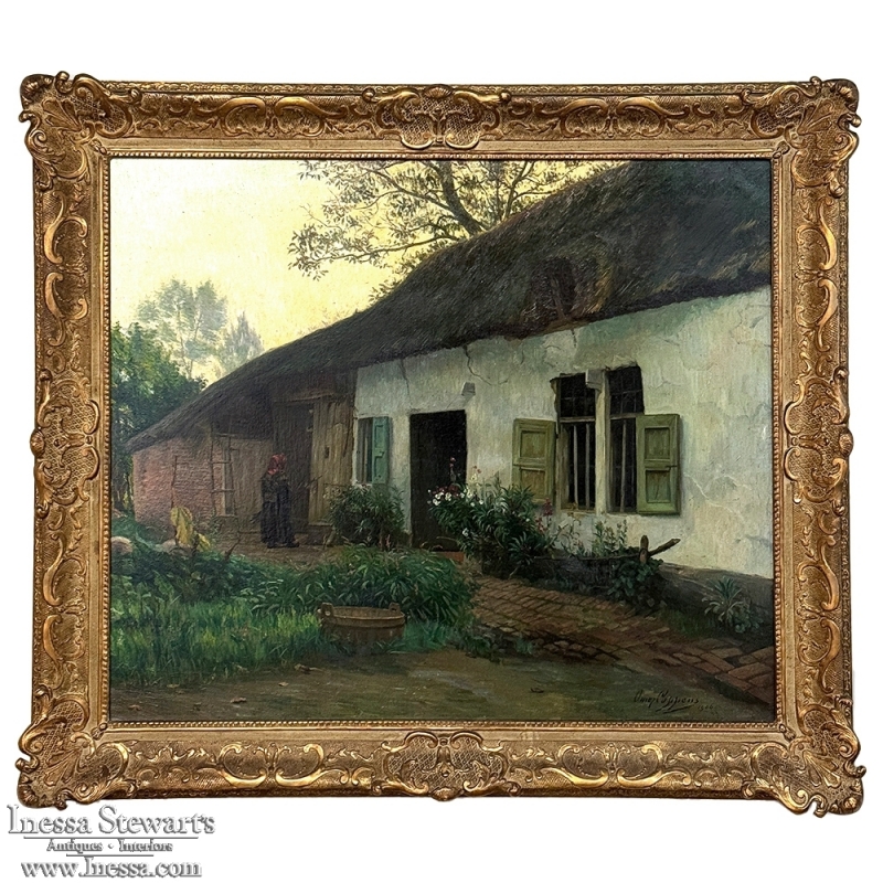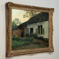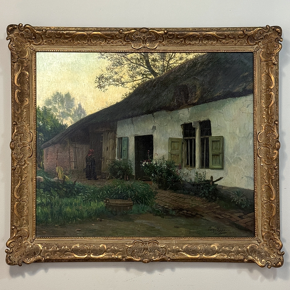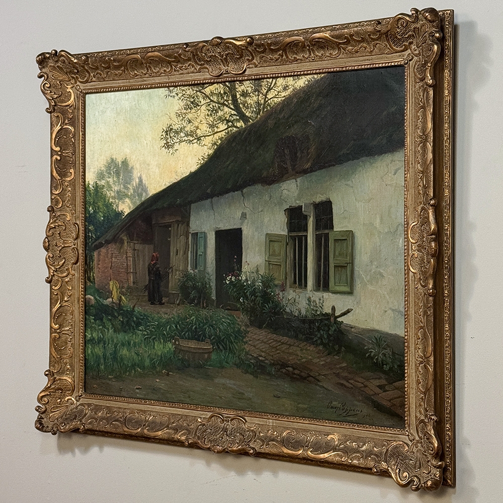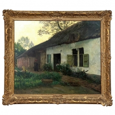 Antique Framed Oil Painting on Canvas by Omer Coppens (1864–1926) is a splendid study in realism by the artist, at once depicting a typical day in a rural life while simultaneously inviting the viewer into the scene as if to be welcomed home. Judicious use of earth tones and shadows indicates an early morning time frame. Note the intriguing composition that creates a non-traditional melding of the sky and foreground interrupted by the perspective of a thatch-roofed cottage obviously expanded over the decades to accommodate the family.