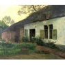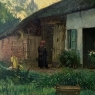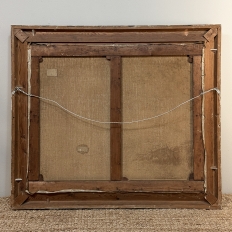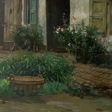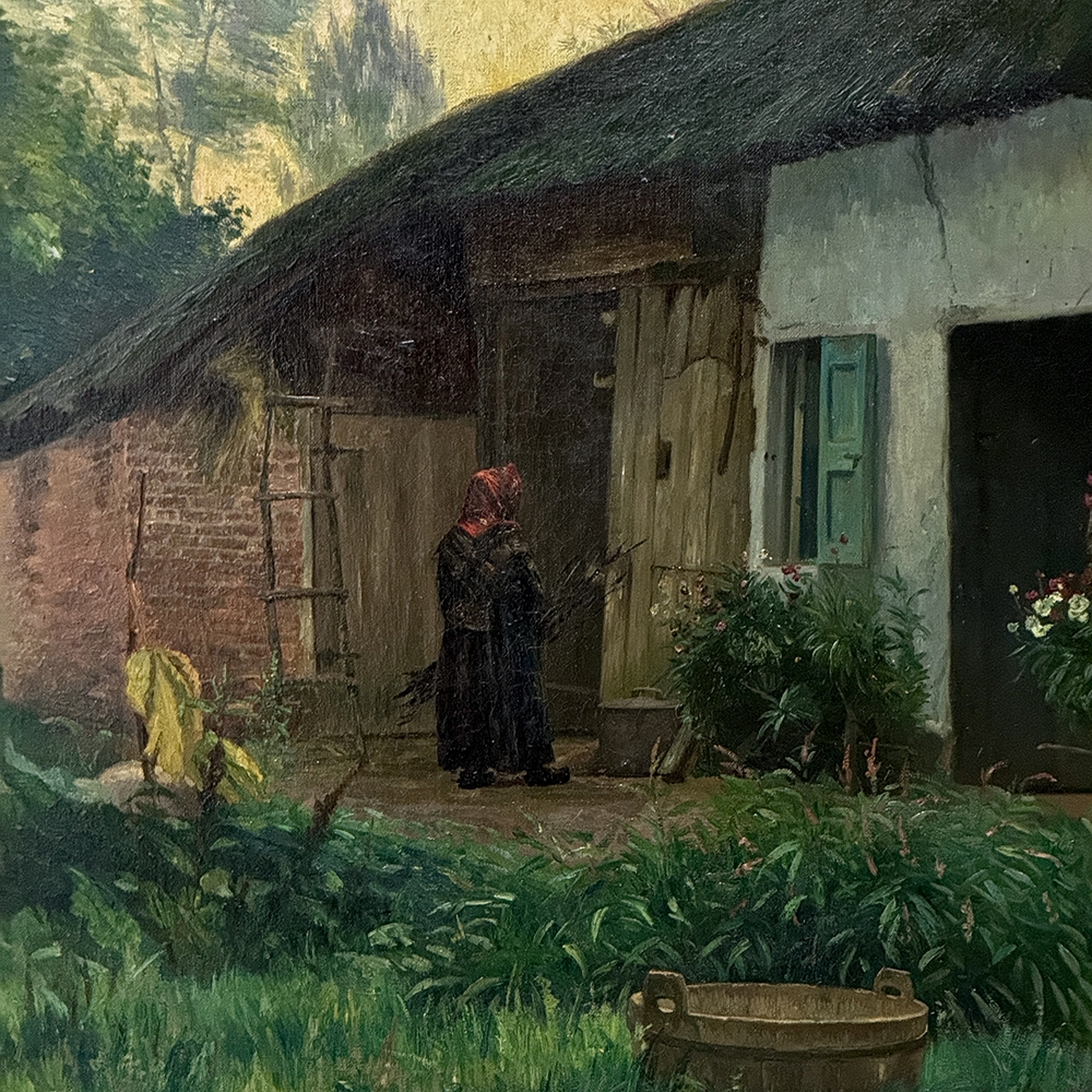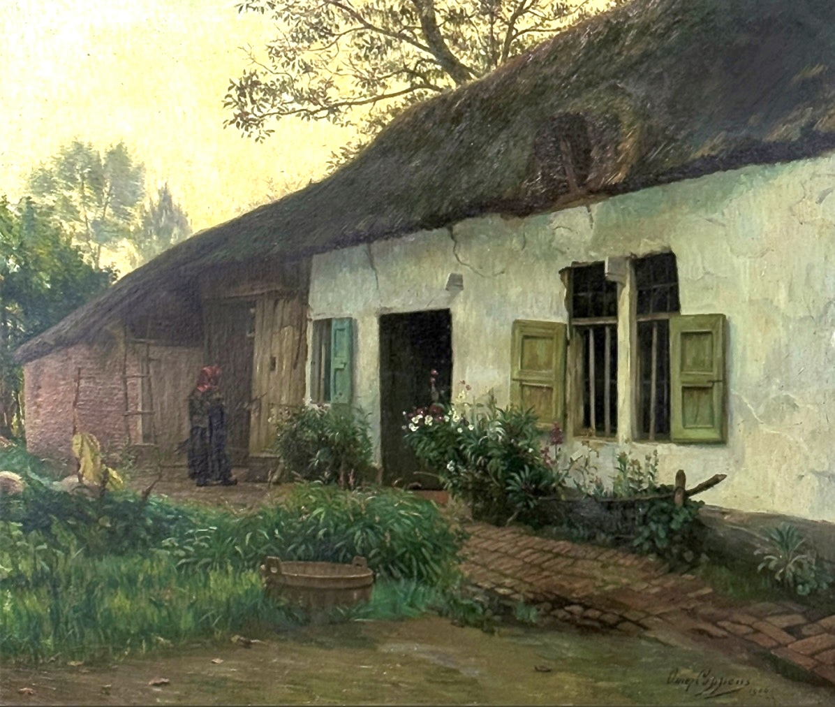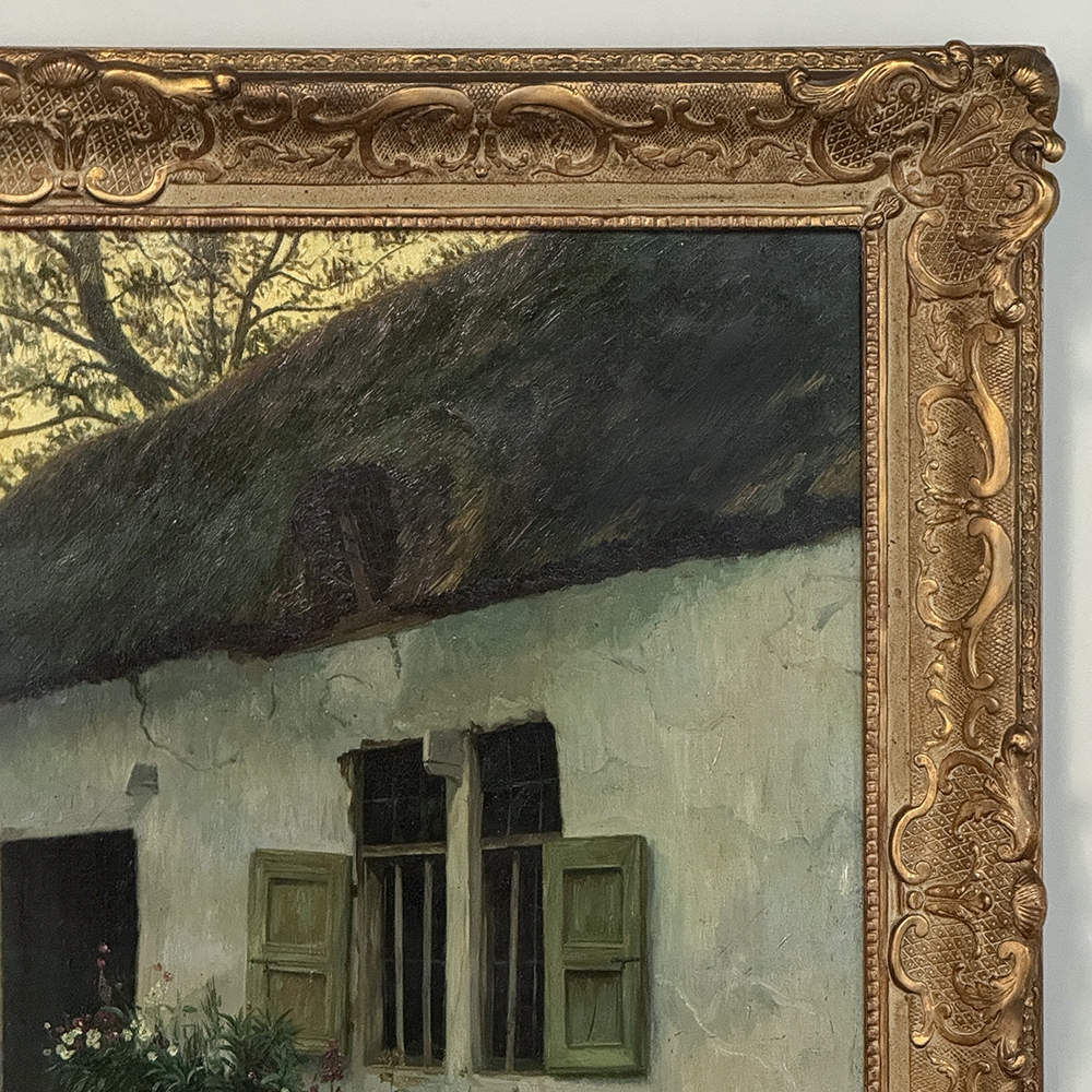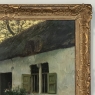 Antique Framed Oil Painting on Canvas by Omer Coppens (1864–1926) is a splendid study in realism by the artist, at once depicting a typical day in a rural life while simultaneously inviting the viewer into the scene as if to be welcomed home. Judicious use of earth tones and shadows indicates an early morning time frame. Note the intriguing composition that creates a non-traditional melding of the sky and foreground interrupted by the perspective of a thatch-roofed cottage obviously expanded over the decades to accommodate the family.