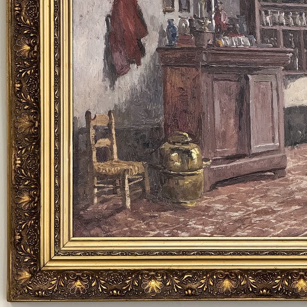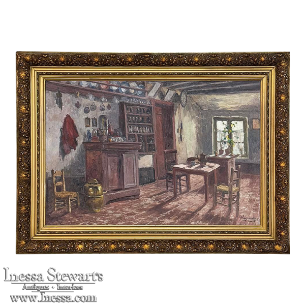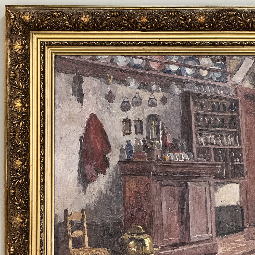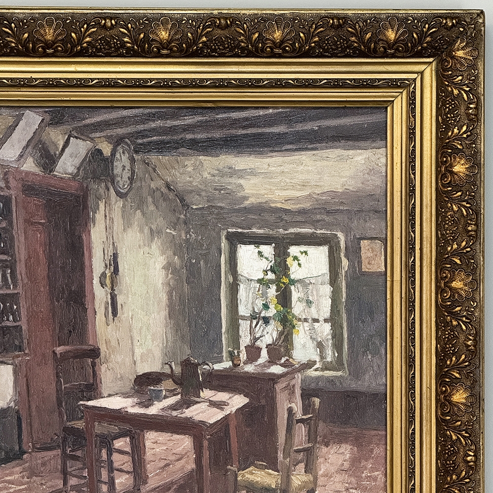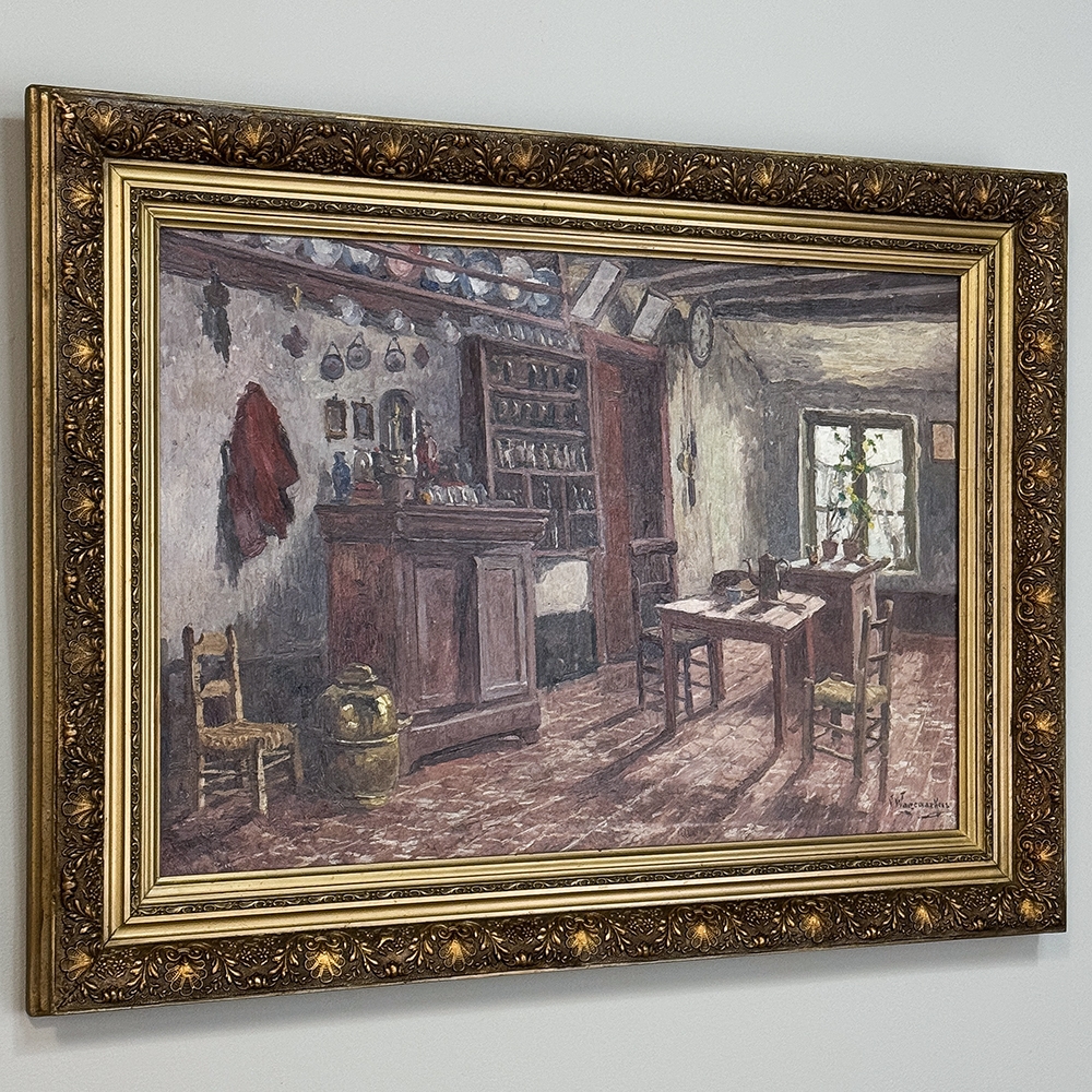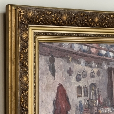 Antique Framed Oil Painting on Canvas by Victor Waegemaeckers is a wonderful example of the interior painting genre that flourished in the 19th century giving us insights into the daily lives of those living in a bygone era. The artist has used a post-impressionistic technique and soft pastel colors in his palette to create a lovely subdued effect. Note the incredible mastery of light and shadow with the morning sun beaming through the window draped with a delicate lace. The owner's collection of everyday items, rustic furniture, and family keepakes creates a home-like warmth that is a snapshot in time. One can almost smell the coffee! It's a snapshot of a morning ritual that survives the ages. Mounted in its original intricately detailed frame lavished with foliates and shells, with gold finish that subtly accents the earth tones of the work.