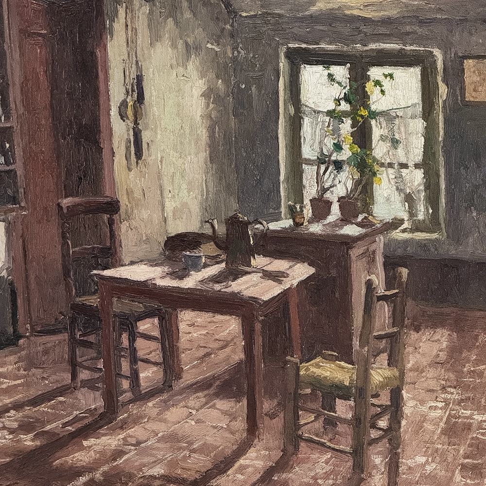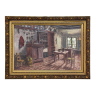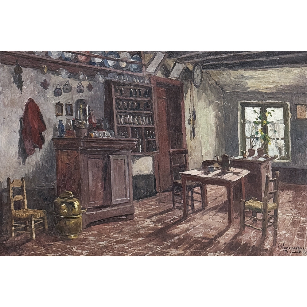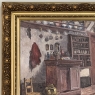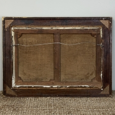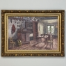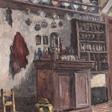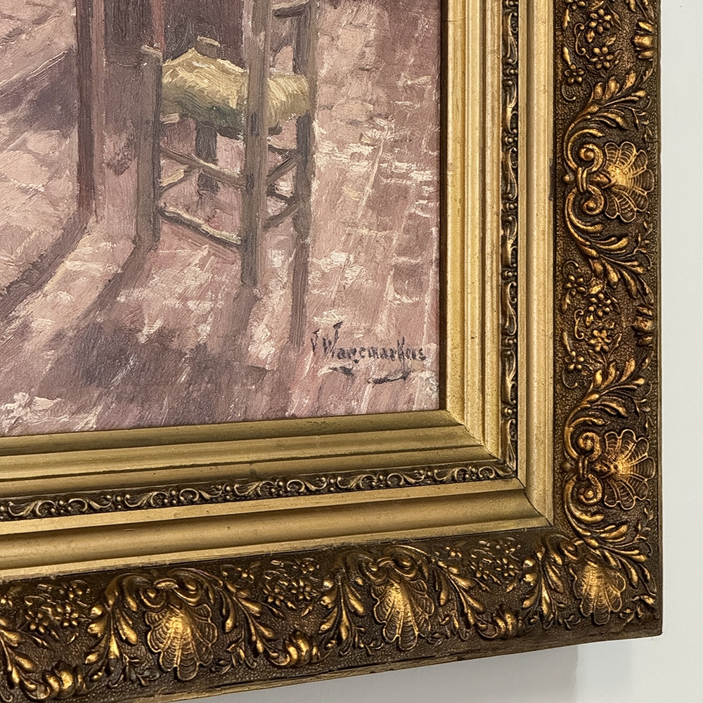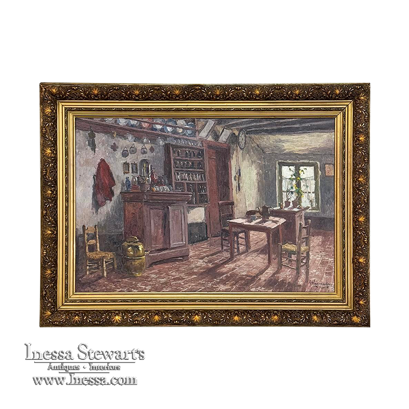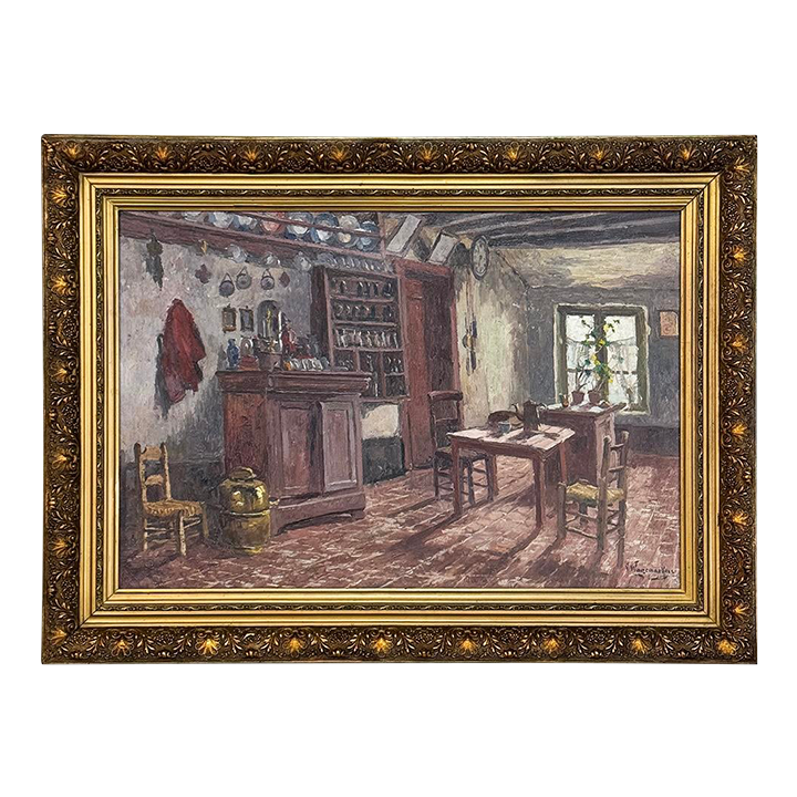 Antique Framed Oil Painting on Canvas by Victor Waegemaeckers is a wonderful example of the interior painting genre that flourished in the 19th century giving us insights into the daily lives of those living in a bygone era. The artist has used a post-impressionistic technique and soft pastel colors in his palette to create a lovely subdued effect. Note the incredible mastery of light and shadow with the morning sun beaming through the window draped with a delicate lace. The owner's collection of everyday items, rustic furniture, and family keepakes creates a home-like warmth that is a snapshot in time. One can almost smell the coffee! It's a snapshot of a morning ritual that survives the ages. Mounted in its original intricately detailed frame lavished with foliates and shells, with gold finish that subtly accents the earth tones of the work.