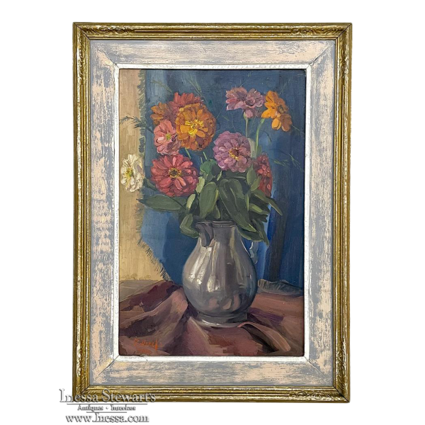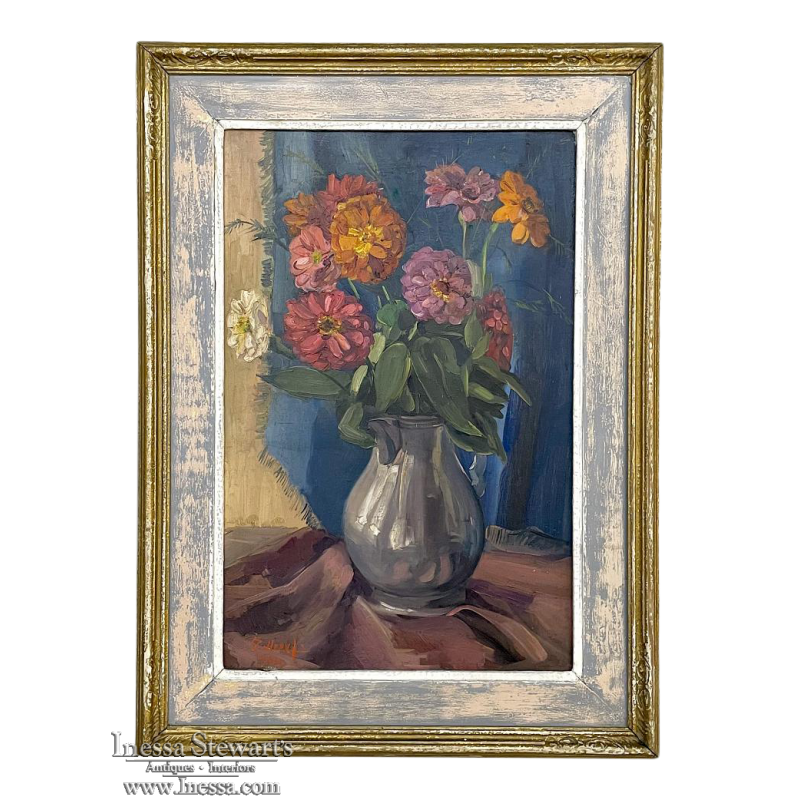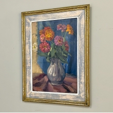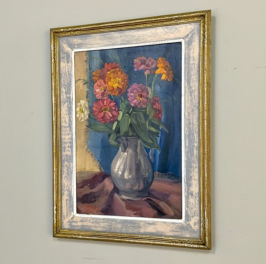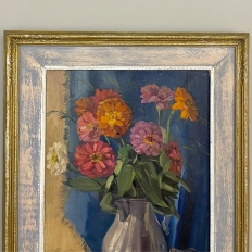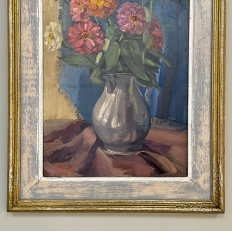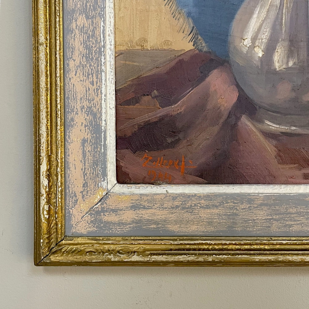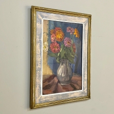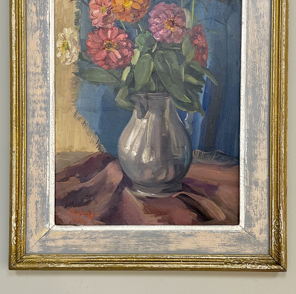 SaleAntique Framed Oil Painting on Canvas by Zollepx is a beautiful work that depicts the classic still life of a pewter pitcher filled with colorful flowers and set by an open window. Painted in occupied Belgium during World War II, it is a testament to the durability of the human spirit. A new protective canvas backing was applied recently. Survives with its original matted frame which has been given a lovely antique painted finish.