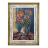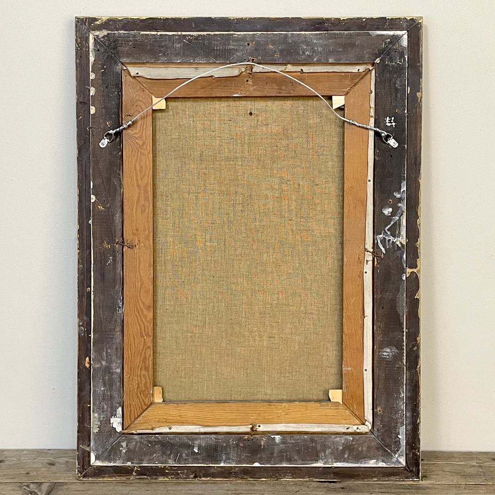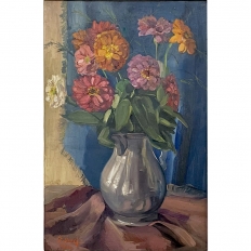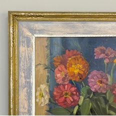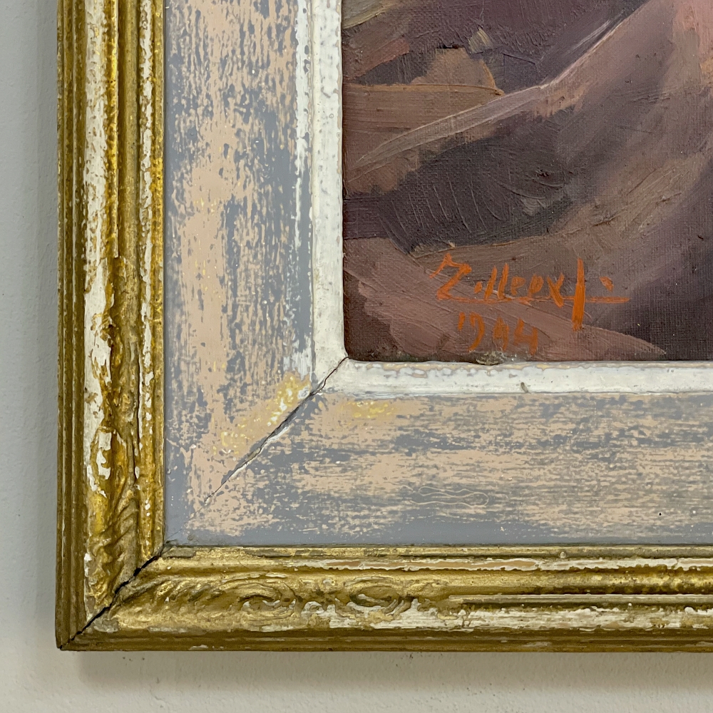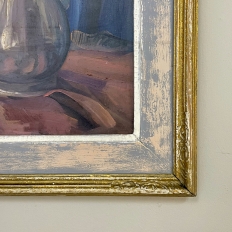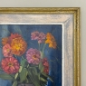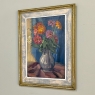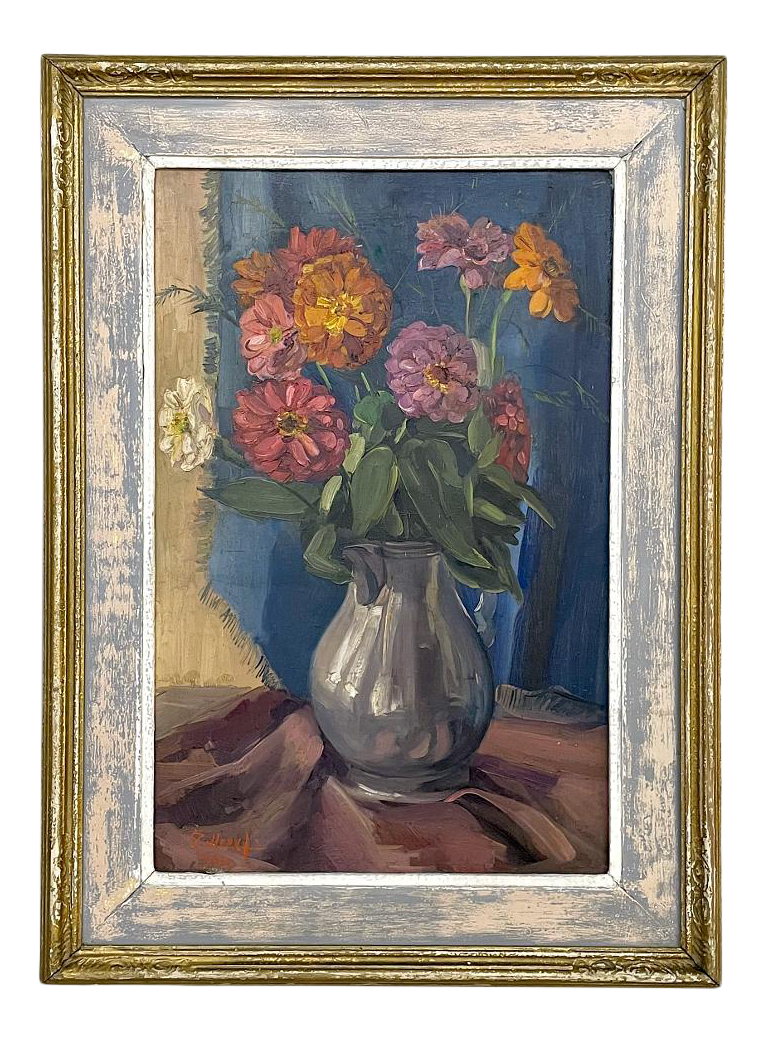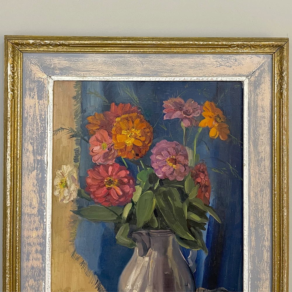SaleAntique Framed Oil Painting on Canvas by Zollepx is a beautiful work that depicts the classic still life of a pewter pitcher filled with colorful flowers and set by an open window. Painted in occupied Belgium during World War II, it is a testament to the durability of the human spirit. A new protective canvas backing was applied recently. Survives with its original matted frame which has been given a lovely antique painted finish.