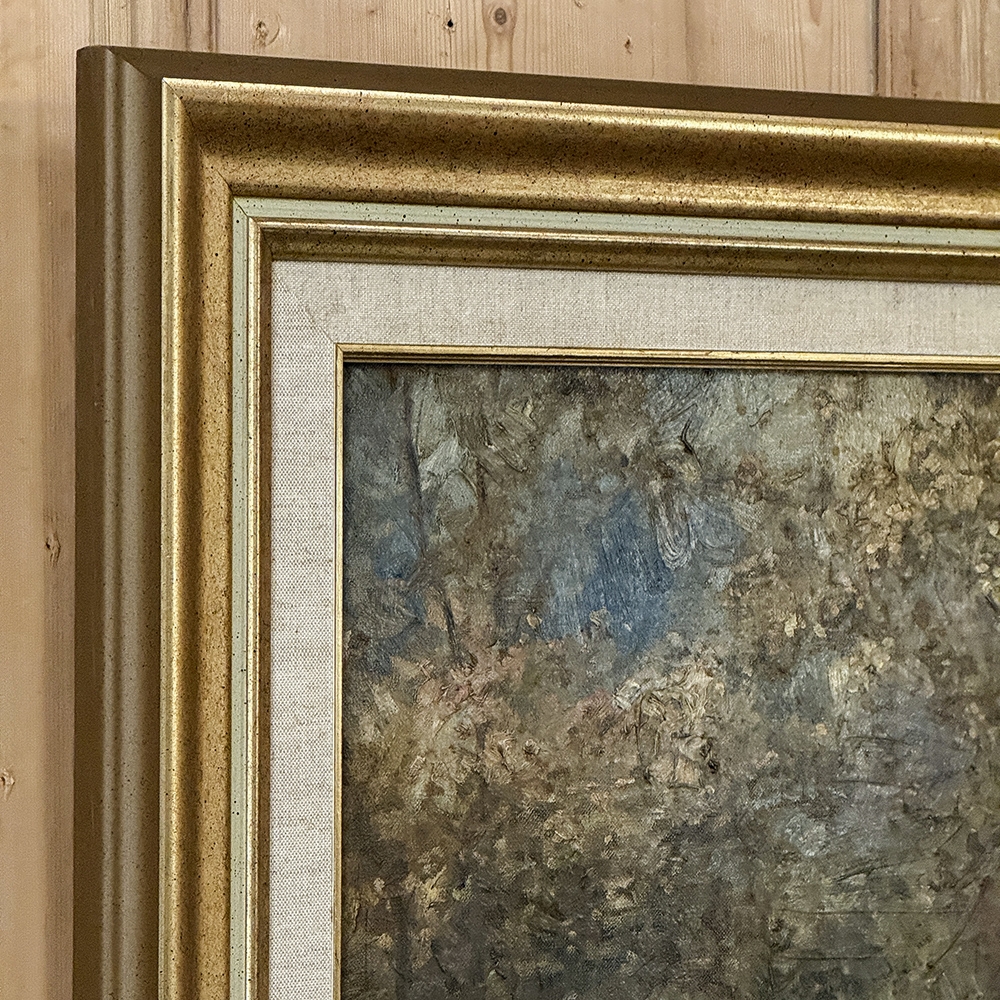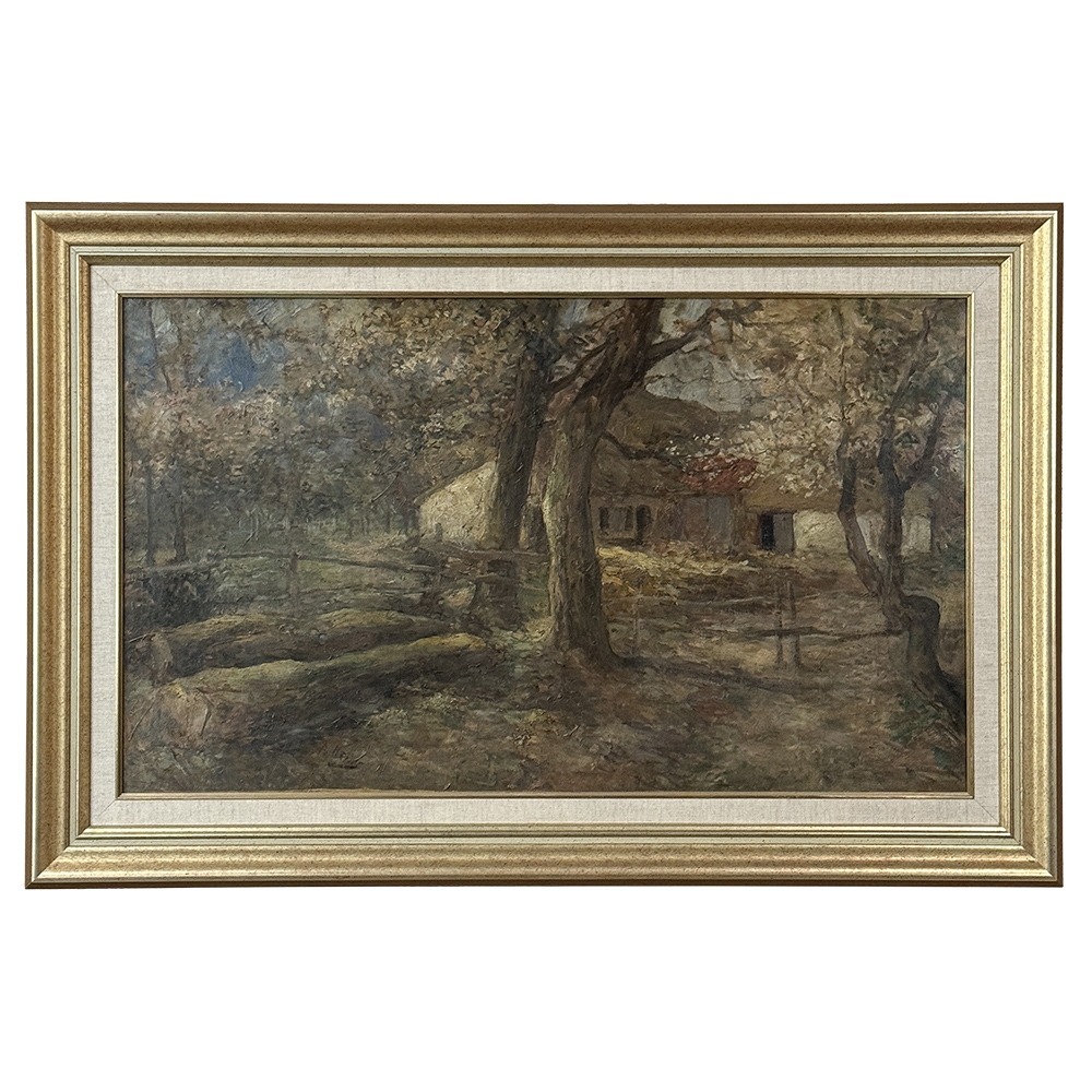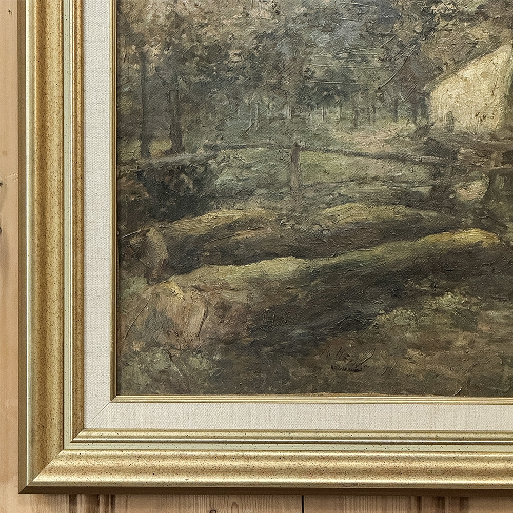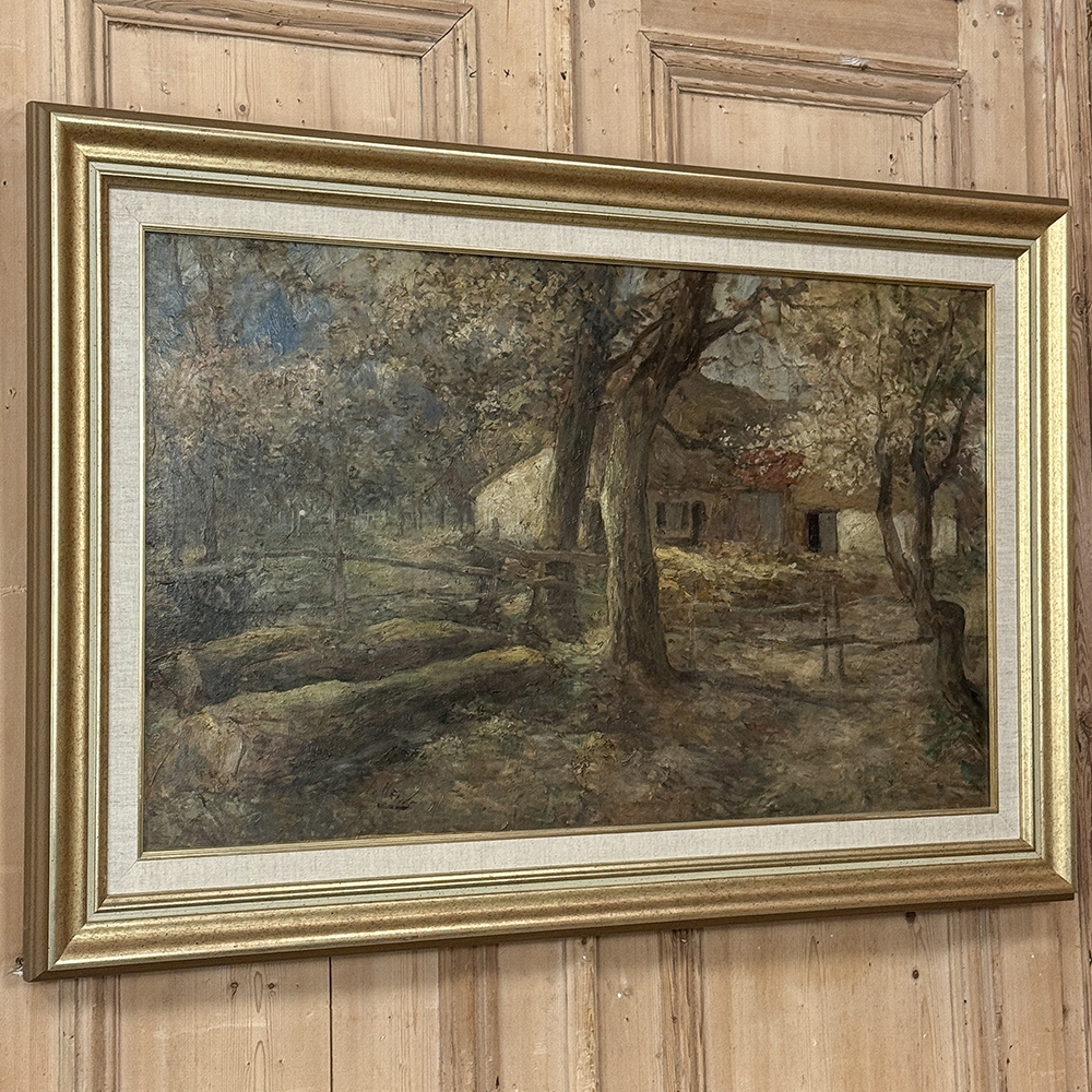 Antique Framed Oil Painting on Canvas signed A. Heins is a wonderful depiction of a charming cottage in the woods, rendered with a deft brush on a soft, earth toned palette. The colors used indicate it is a Spring morning, with shadows playing an intricate part of defining the scene. Heins has chosen to emphasize the structure as it sets in the heavily wooded property with only a hint of the sky showing through the leafy canopy. The work has changed hands many times, as indicated by the various art dealer markings on the back (including a wax seal), which only adds to its mystery and charm. Recently professionally re-framed, and ready to brighten up your room!