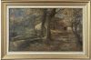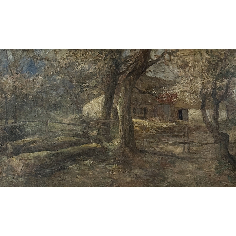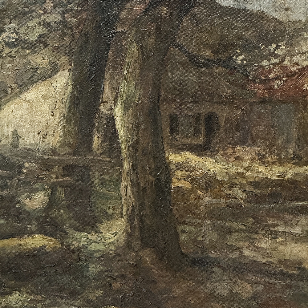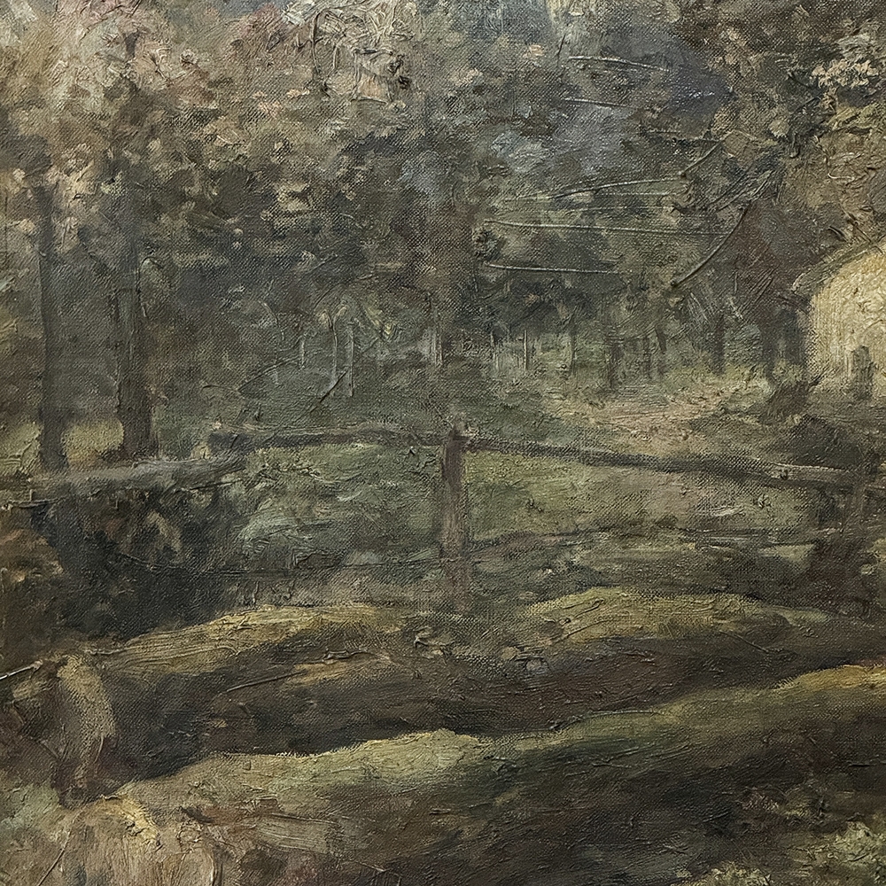 Antique Framed Oil Painting on Canvas signed A. Heins is a wonderful depiction of a charming cottage in the woods, rendered with a deft brush on a soft, earth toned palette. The colors used indicate it is a Spring morning, with shadows playing an intricate part of defining the scene. Heins has chosen to emphasize the structure as it sets in the heavily wooded property with only a hint of the sky showing through the leafy canopy. The work has changed hands many times, as indicated by the various art dealer markings on the back (including a wax seal), which only adds to its mystery and charm. Recently professionally re-framed, and ready to brighten up your room!
