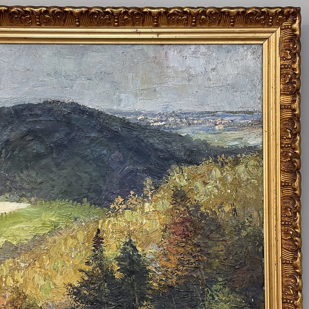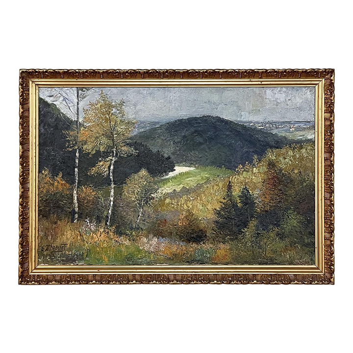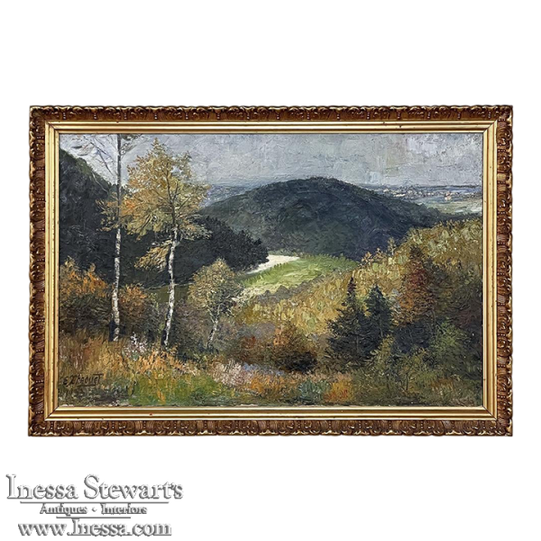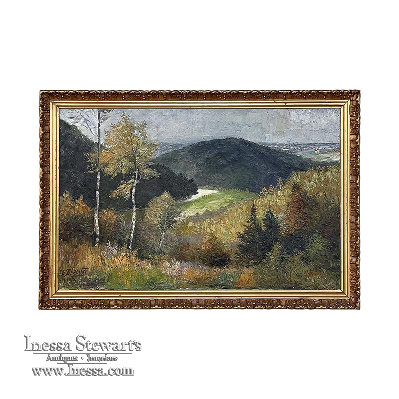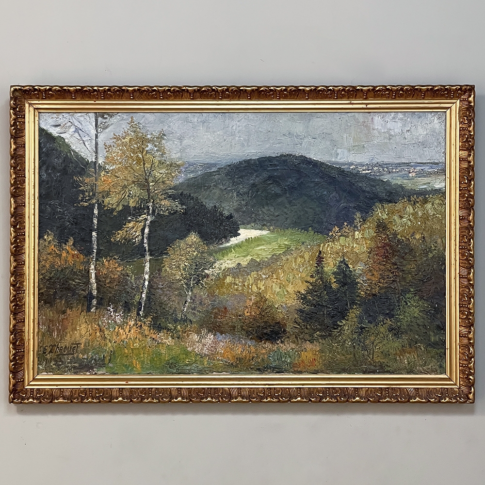 Antique Framed Oil Painting on Canvas signed E.X. Chaouet is a captivating pastoral inspired by the rolling hills around the northern French plains. Here we see depicted an early Fall period, with colors just starting to change. From the artist's vantage point, once can see the last vista of the valley before the geography opens to a plain upon which a small village has been sited in the distance. One can almost smell the fresh air! An overcast sky provides diffuse light onto the scene especially in the background, all rendered with a post-impressionistic technique.