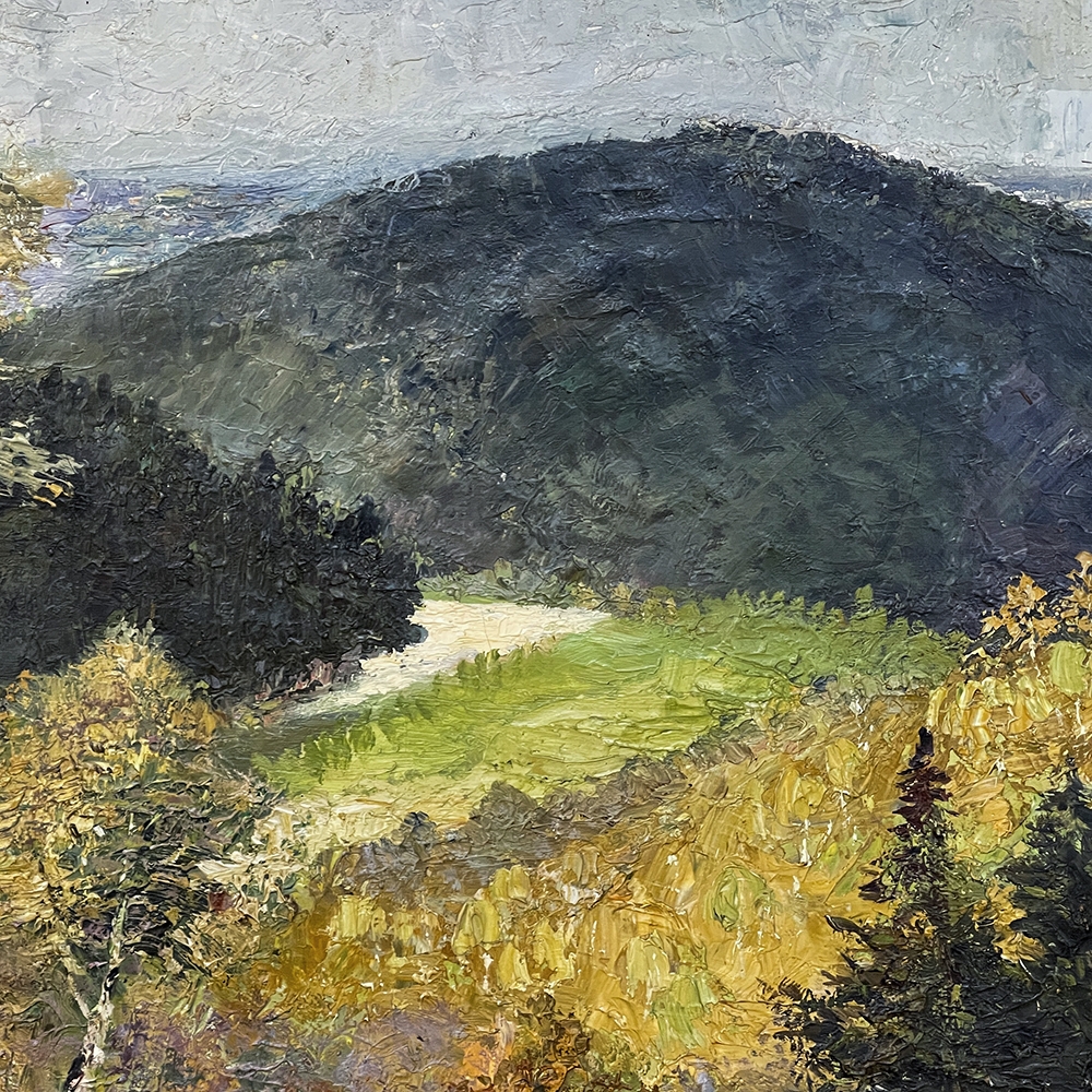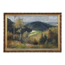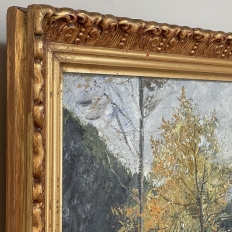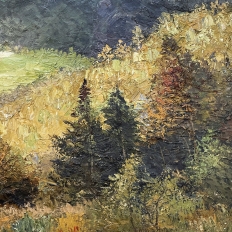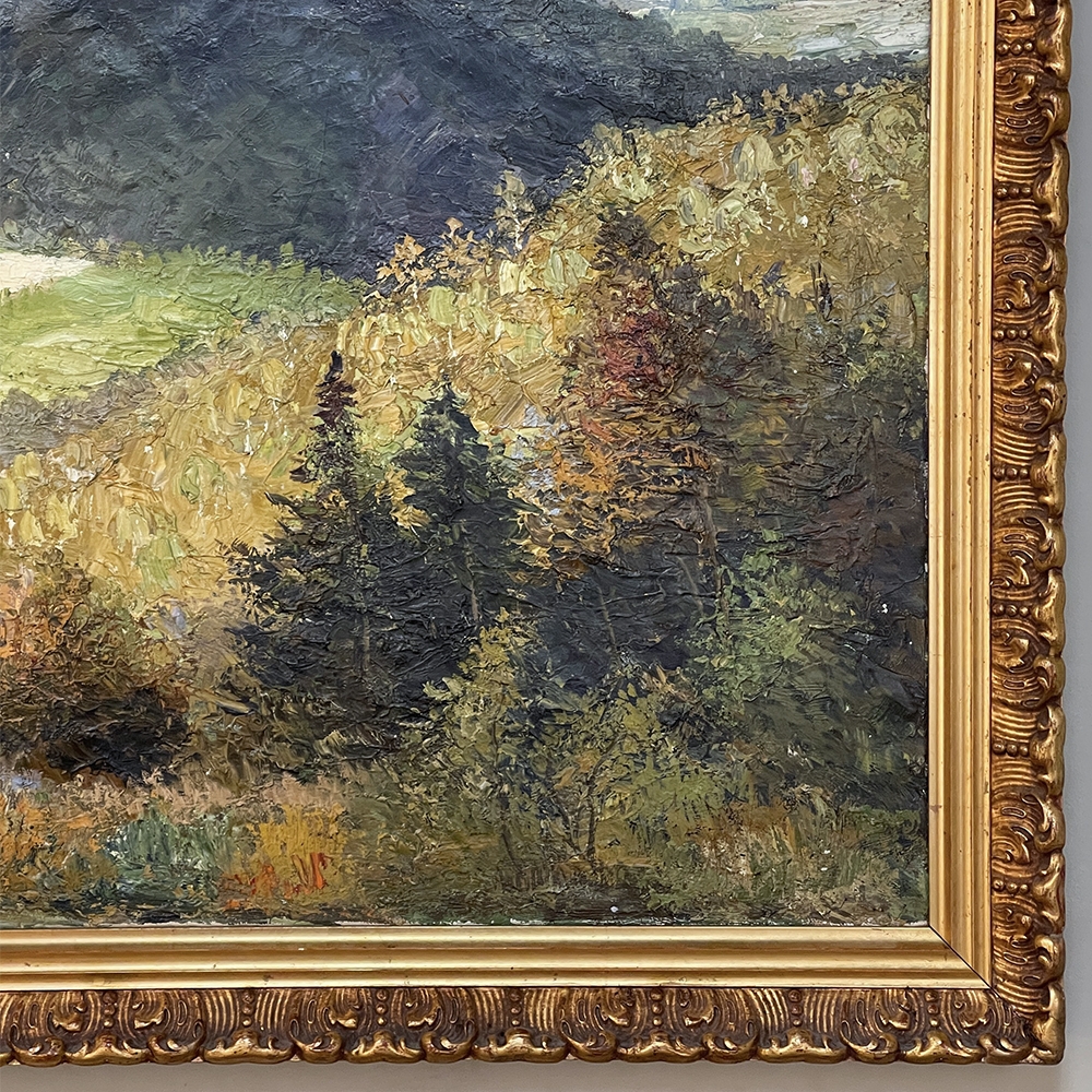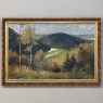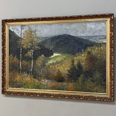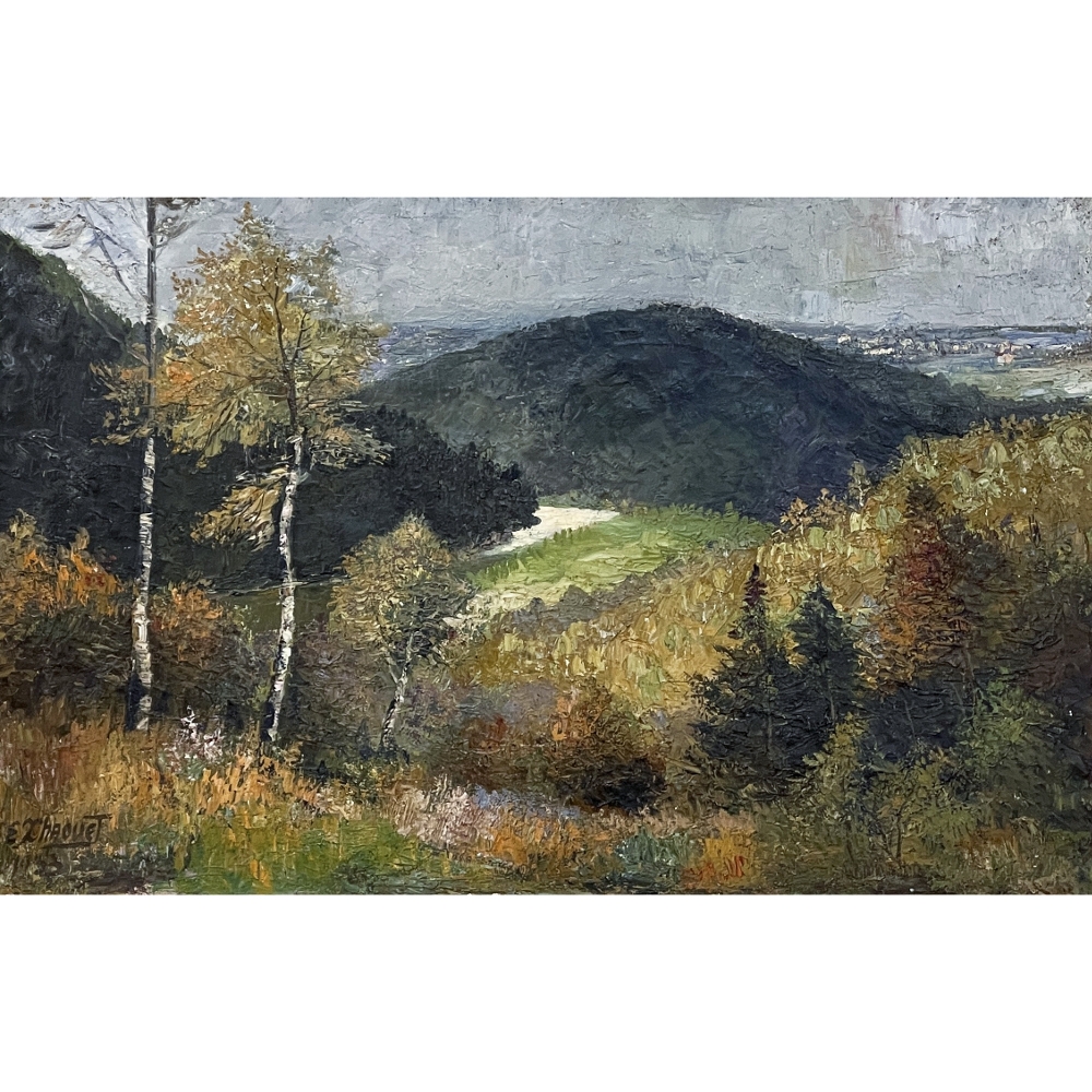 Antique Framed Oil Painting on Canvas signed E.X. Chaouet is a captivating pastoral inspired by the rolling hills around the northern French plains. Here we see depicted an early Fall period, with colors just starting to change. From the artist's vantage point, once can see the last vista of the valley before the geography opens to a plain upon which a small village has been sited in the distance. One can almost smell the fresh air! An overcast sky provides diffuse light onto the scene especially in the background, all rendered with a post-impressionistic technique.