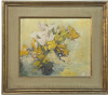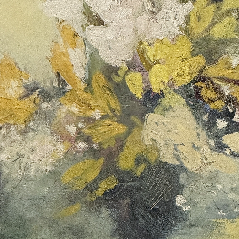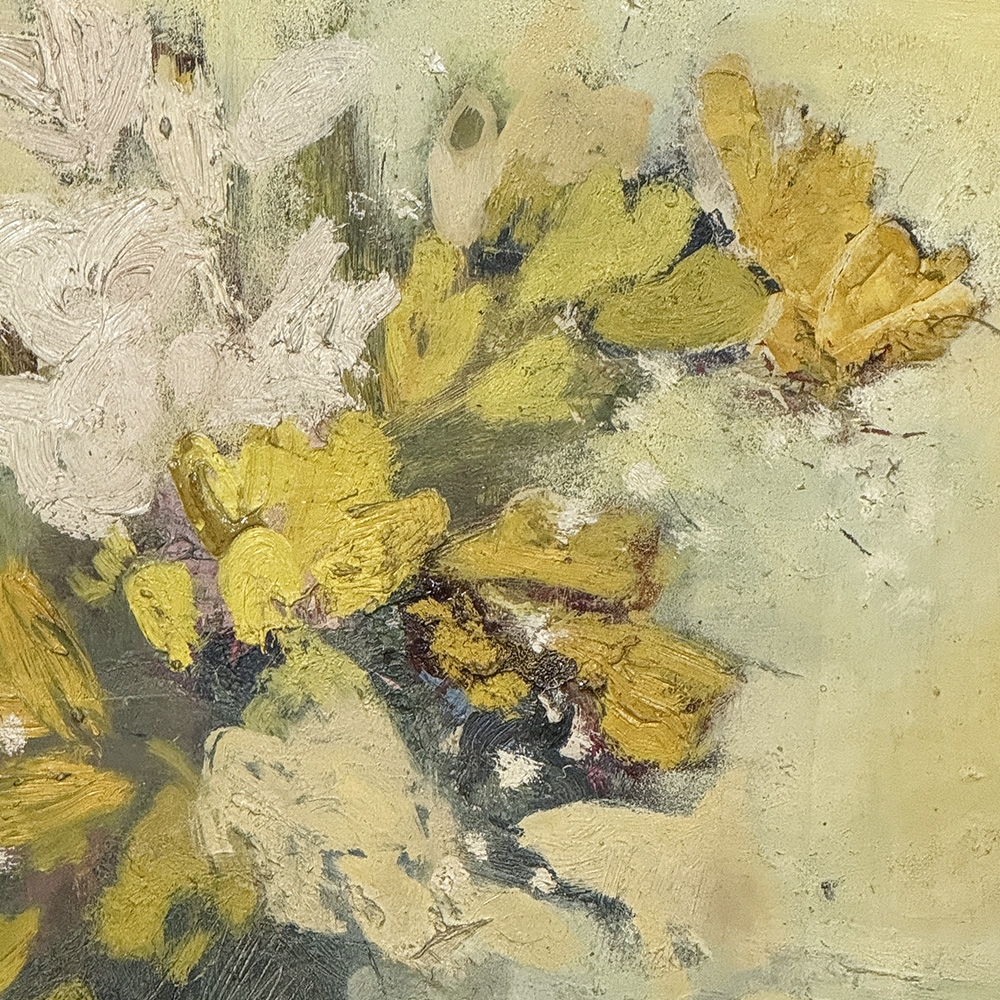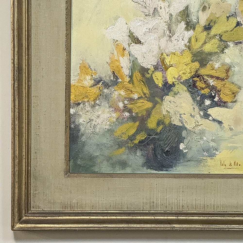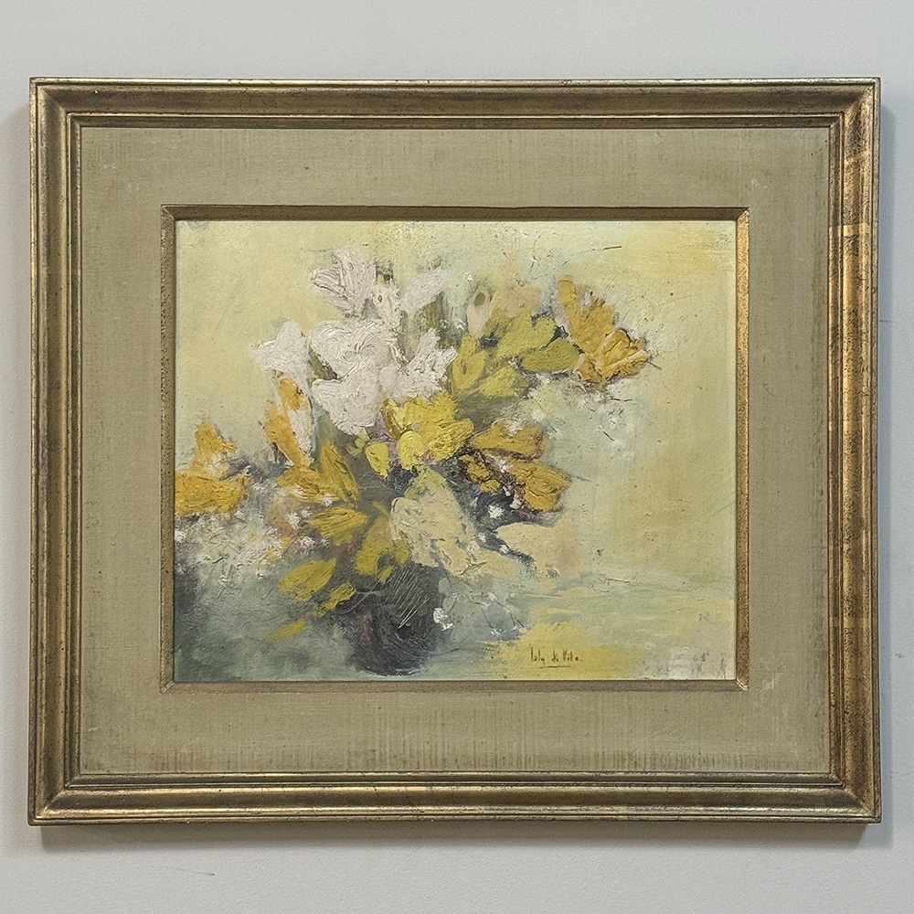 Antique Framed Oil Painting on Panel signed Lola di Vito is a beautiful celebration of yellows and golds, painted with determined impressionistic brush strokes that breathe life and movement into the otherwise typical still life. The profusion of wildflowers look almost windblown in the setting, with background colors carefully chosen to draw from the natural floral hues. Even the matt and frame accentuate the palette. Signed Lola di Vito and surviving in its original frame.