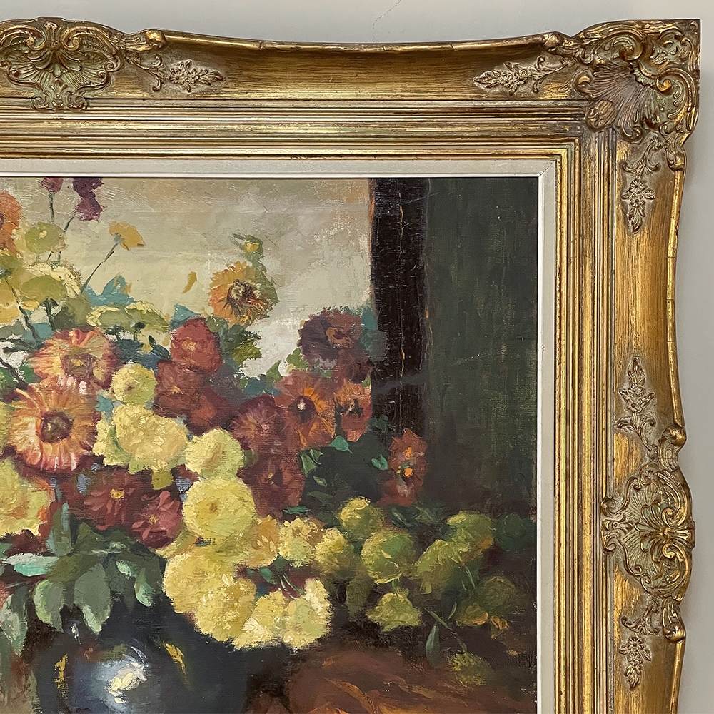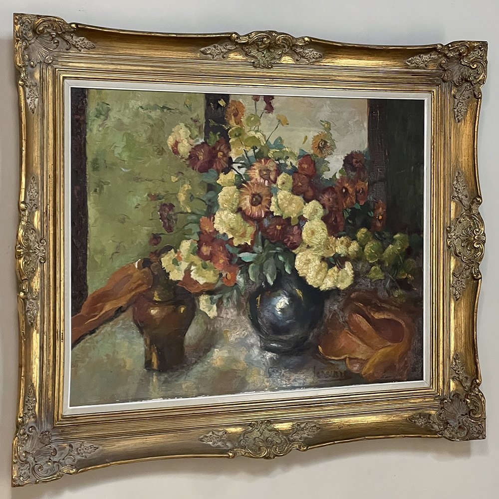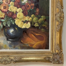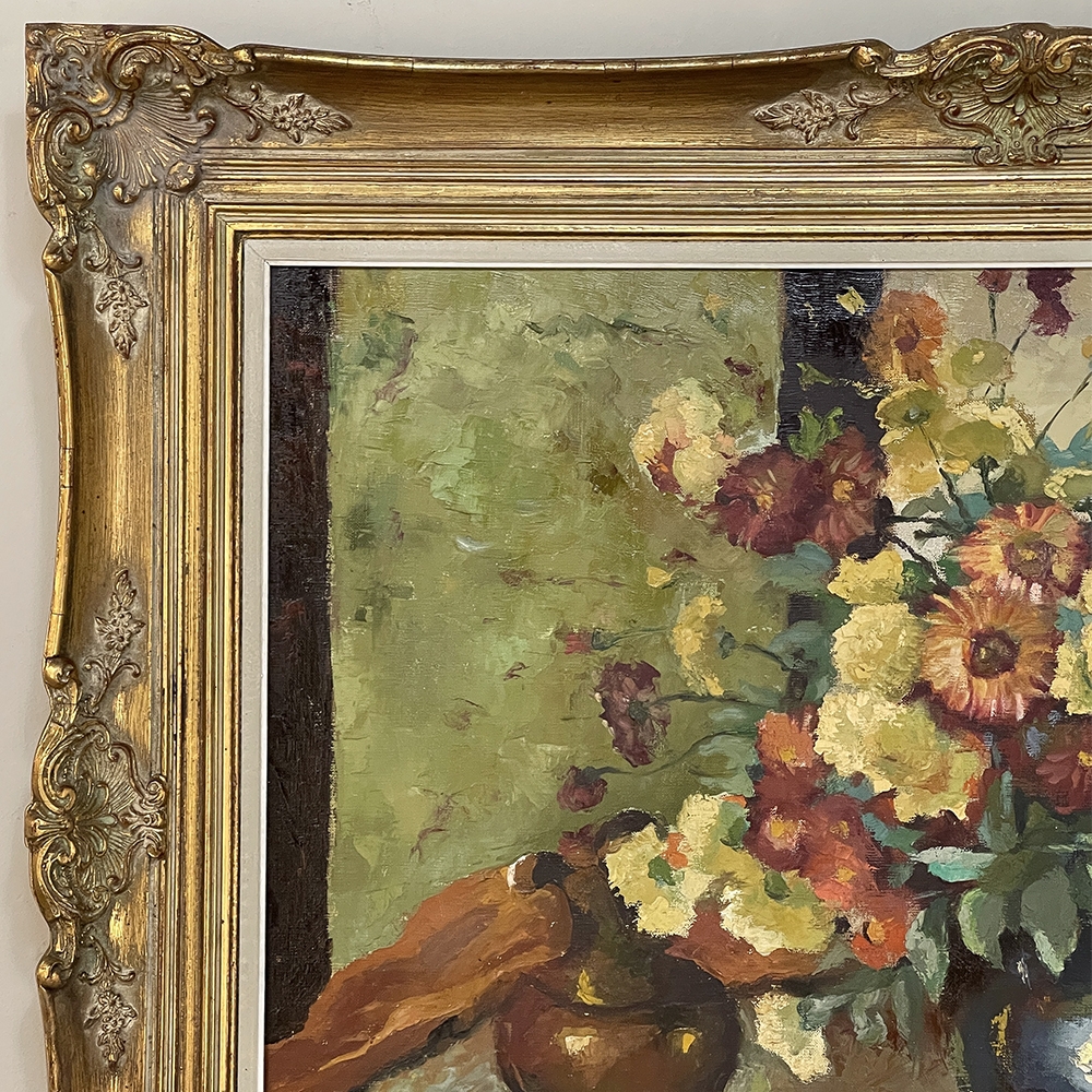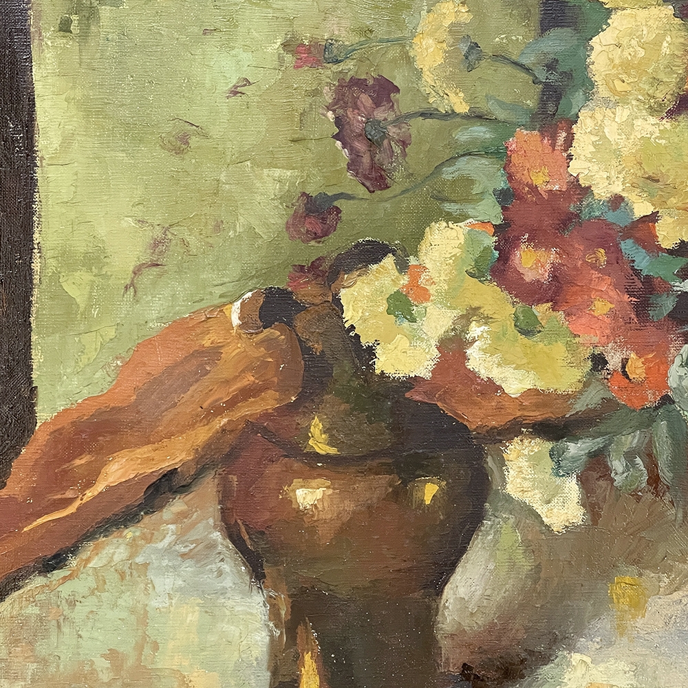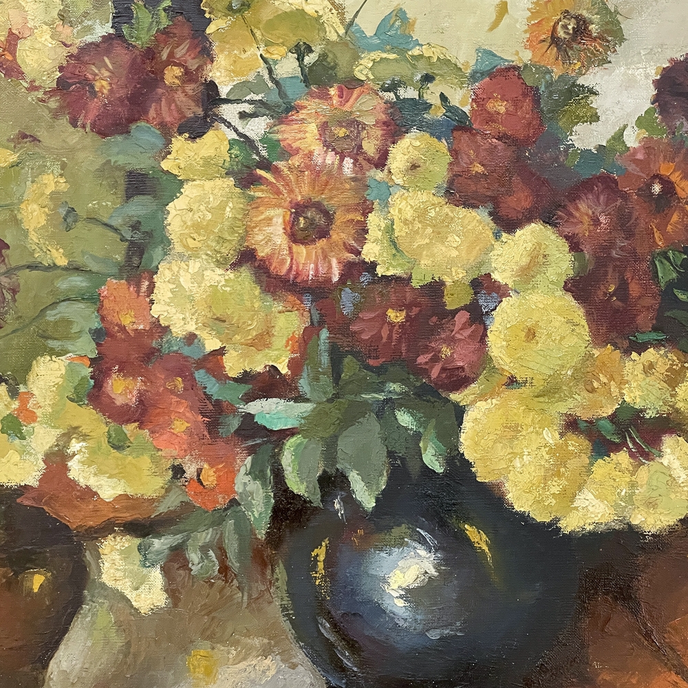 Antique Framed Still Life Signed Oil Painting on Canvas is an exceptional example of the timeless still life theme executed in a post-impressionistic style. Rich earth tones with subtle jewel tone accents pervade the work, where the artist has depicted a bouquet of fresh-picked flowers just arranged and ready to decorate the home's interior. The somewhat unusual depiction of the light source being behind the viewer to the left makes for an interesting effect, with the shadows helping to highlight the richness of the naturalistic colors and forms. Survives in its original gold-highlighted frame.