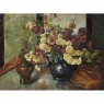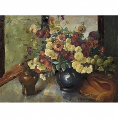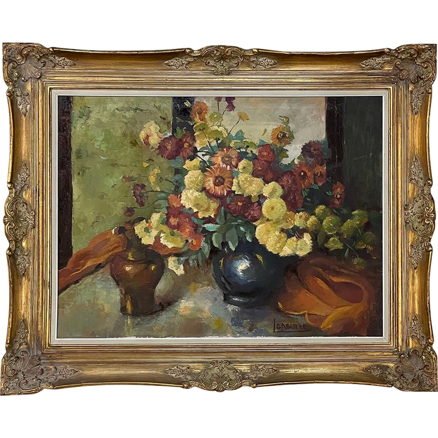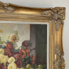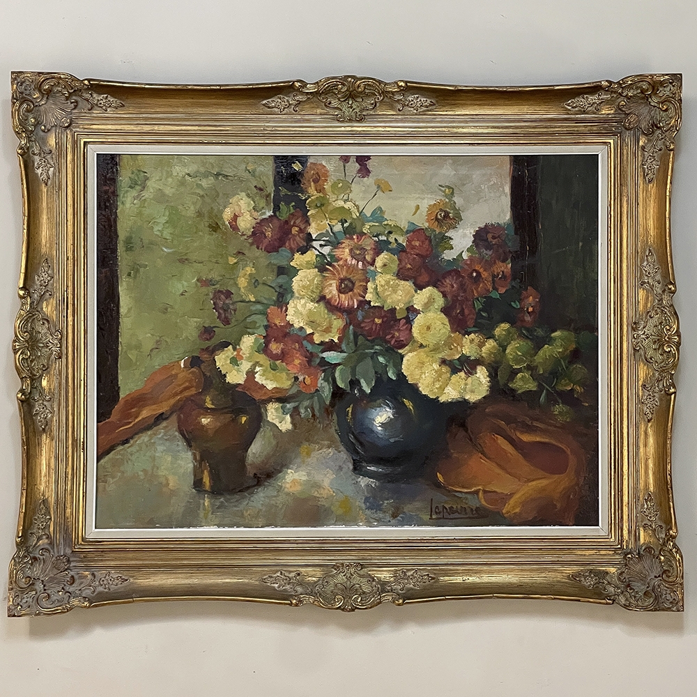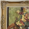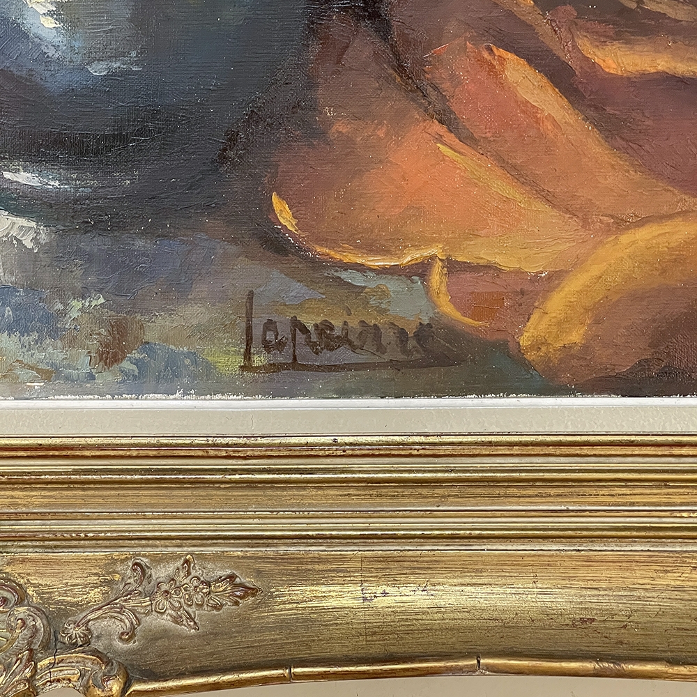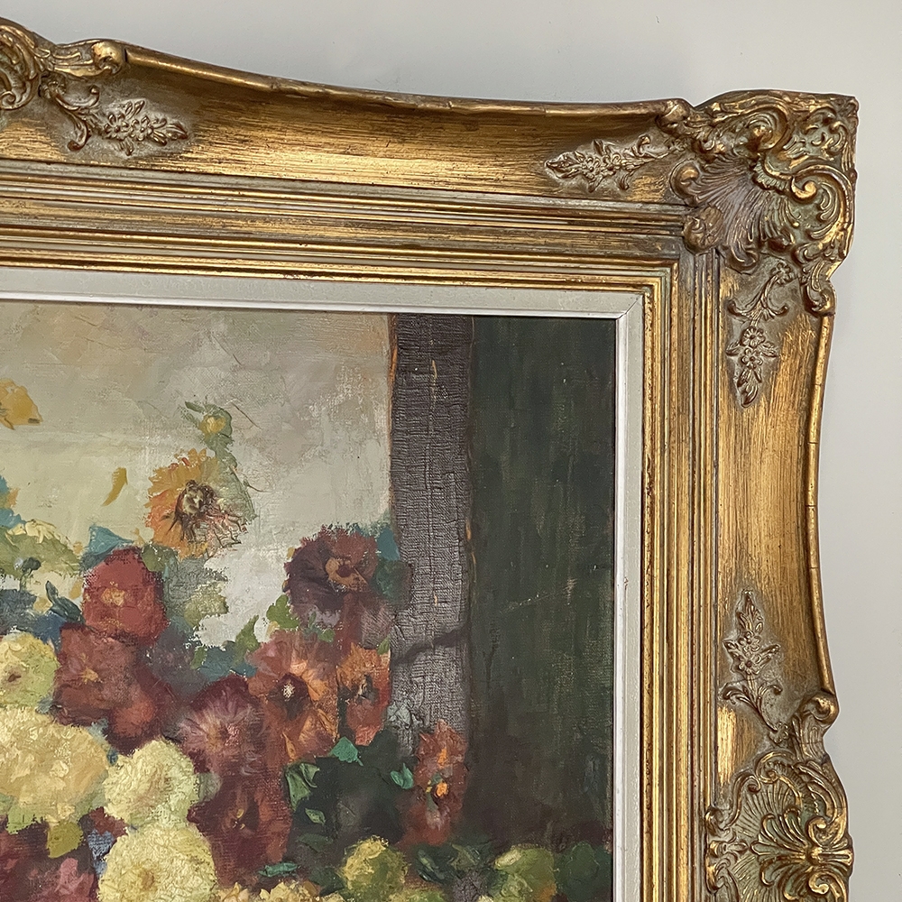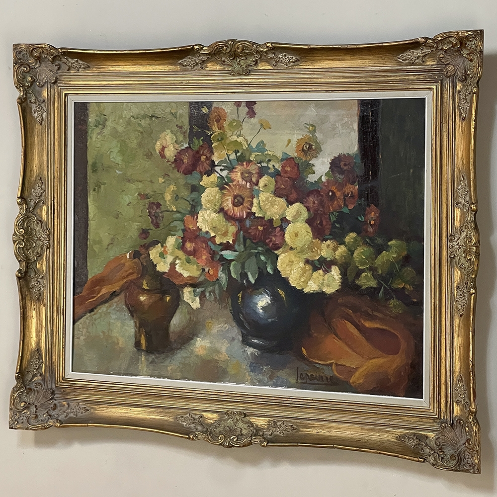 Antique Framed Still Life Signed Oil Painting on Canvas is an exceptional example of the timeless still life theme executed in a post-impressionistic style. Rich earth tones with subtle jewel tone accents pervade the work, where the artist has depicted a bouquet of fresh-picked flowers just arranged and ready to decorate the home's interior. The somewhat unusual depiction of the light source being behind the viewer to the left makes for an interesting effect, with the shadows helping to highlight the richness of the naturalistic colors and forms. Survives in its original gold-highlighted frame.