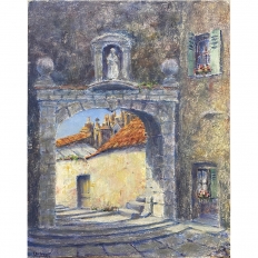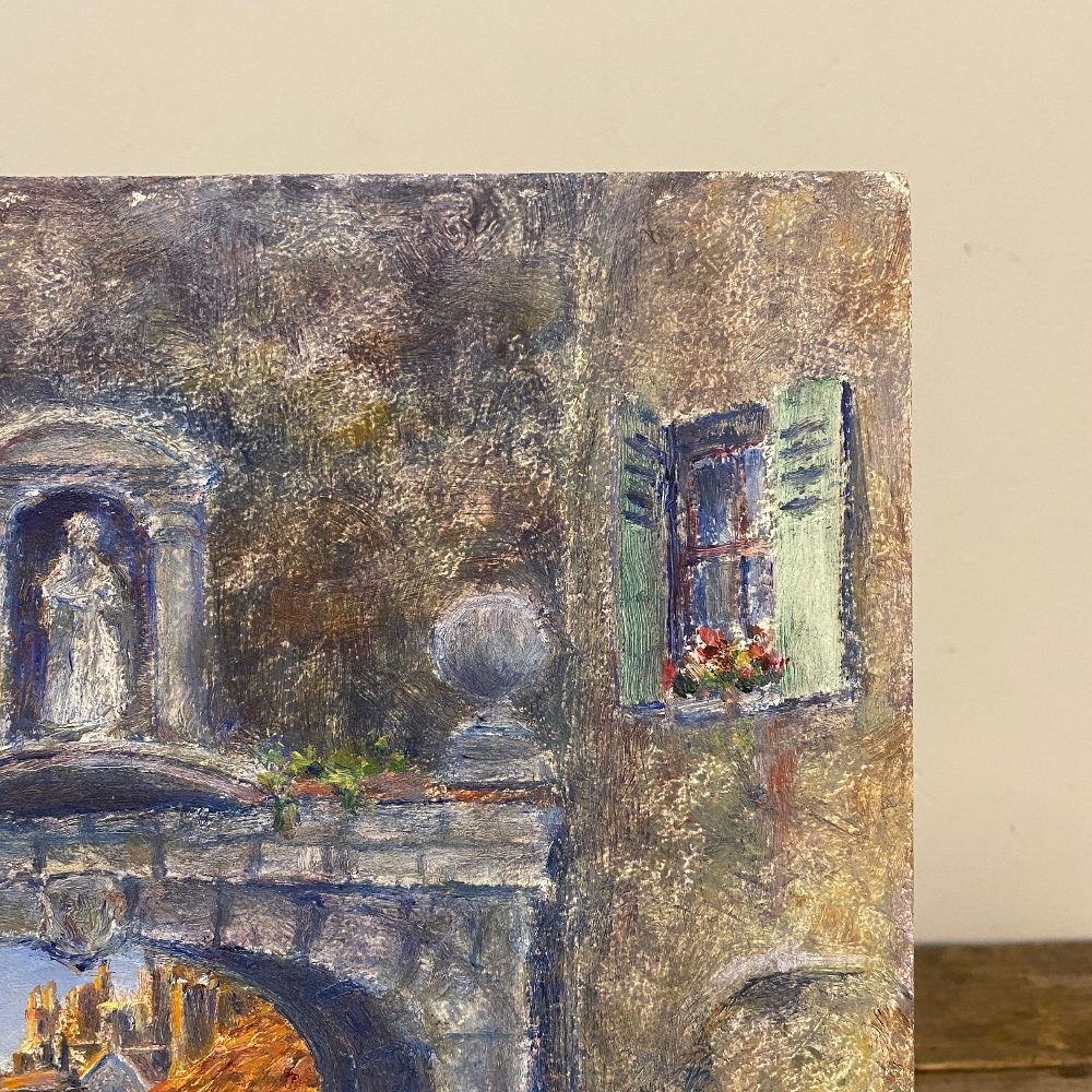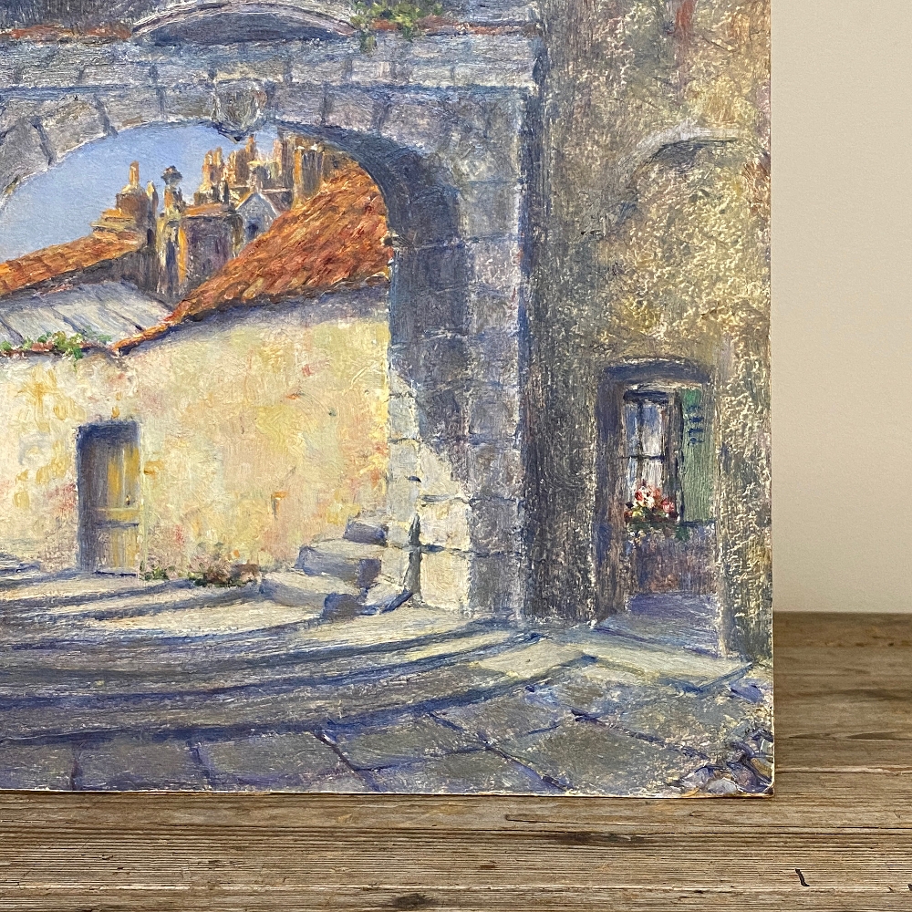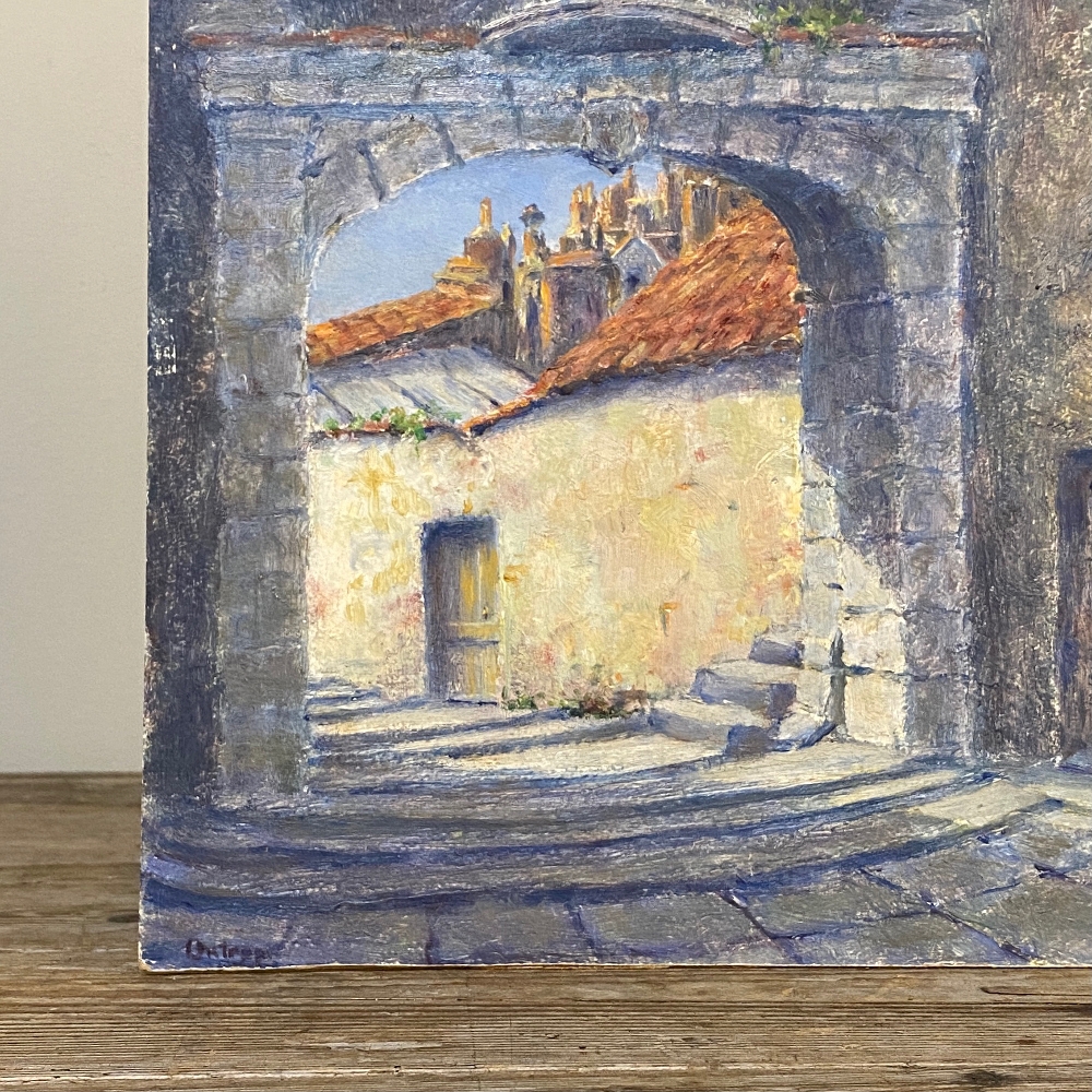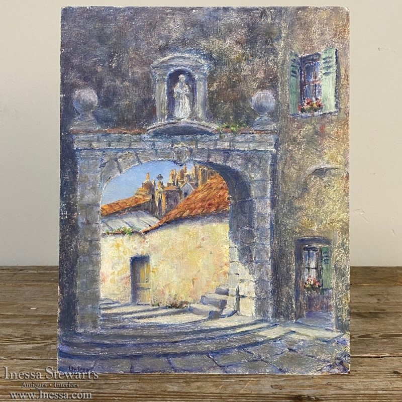 Antique Oil Painting on Board by H. G. Ontrop (1880-1955) is an intriguing example of the artist's work examining an interesting architectural detail of a local village where an arched masonry passageway has been created to facilitate foot traffic in the street plan. A statue of a saint appears in a niche above, usually the patron saint of that particular village. Ontrop has chosen cool colors to reflect the shaded niche of the village tucked away in a corner most visitors may not see, with hints of the sun-kissed terra cotta roofs of the dwellings just visible through the archway at the center of the work.