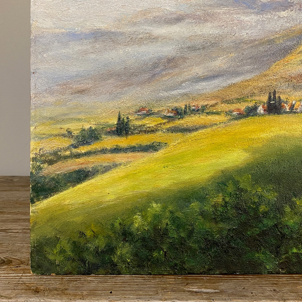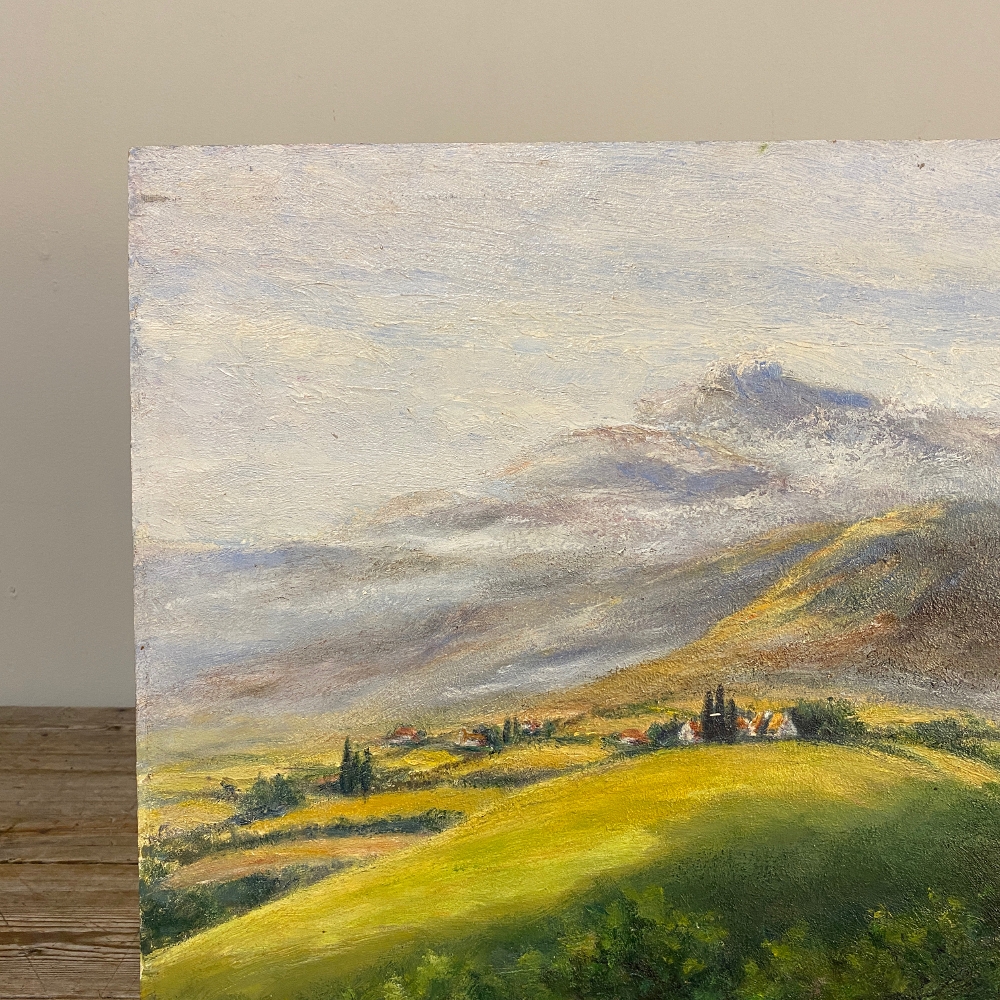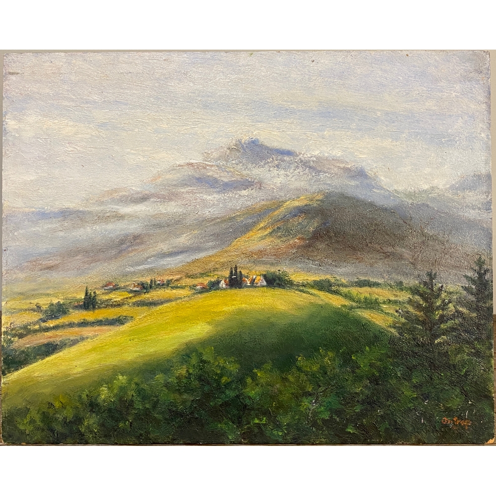 Antique Oil Painting on Board by H. G. Ontrop (1880-1955) represents a classic study in composition, for which the artist was truly gifted! The bold forest greens of the foreground blend into the sun-kissed curvature of the hilltop meadow, leading the eye to the grouping of homes at the foothills of the misty mountains in the background. Executed on board which is a more difficult platform for the artist than canvas, requiring more precision.