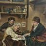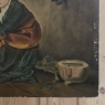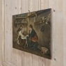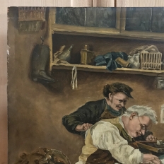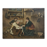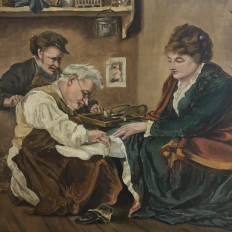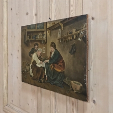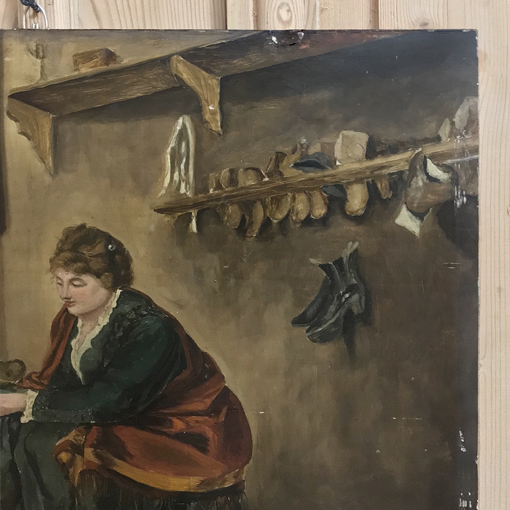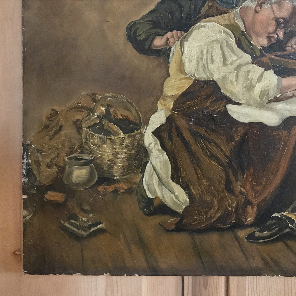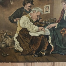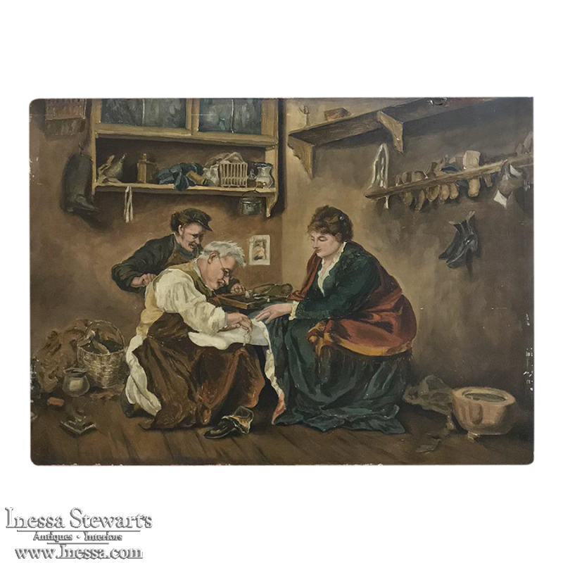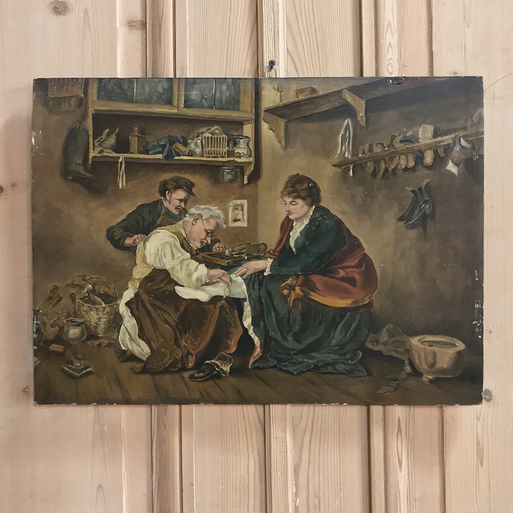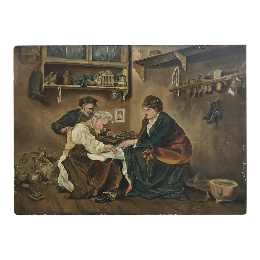 SaleAntique Oil Painting On Board depicts a humble shoemaker's shop. Called a cobbler in Europe after the 13th century, such tradesmen usually worked in one-man shops and serviced either villages or city neighborhoods. Shoes were fitted by hand and custom cut and sewn, and as a result were comparatively expensive. Here the shoemaker is at work taking measurements of a customer's calf and foot for her fitting, as a young apprentice watches the procedure. Note the artist's attention to the detail not only of the subjects in the painting, but the disorderly surroundings in what should be considered a busy shop.
