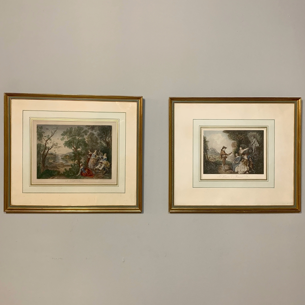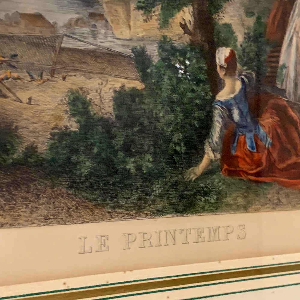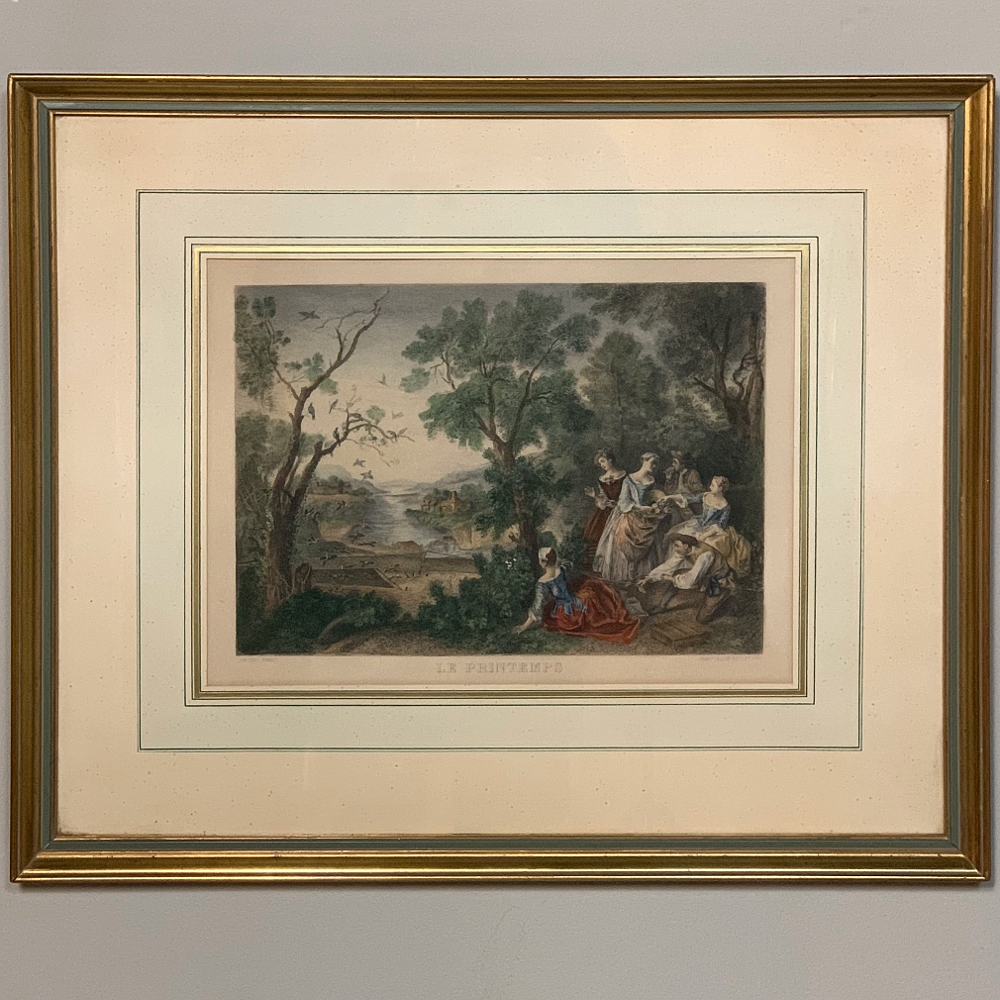 SaleFramed Engraving, Antique French, Hand-Colored ~ 'Springtime' from the Belle Epoque period in France depicts a refreshing scene of courtesans enjoying the Spring weather on the grounds of a lavish estate.