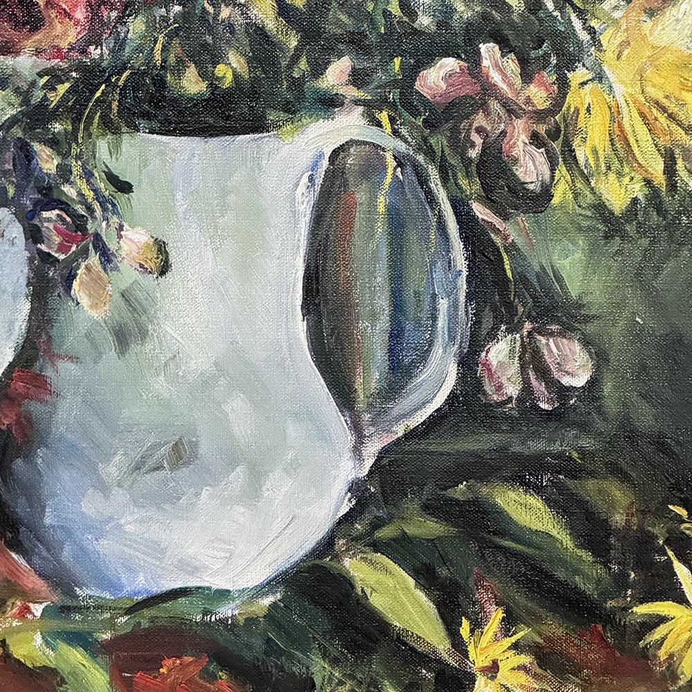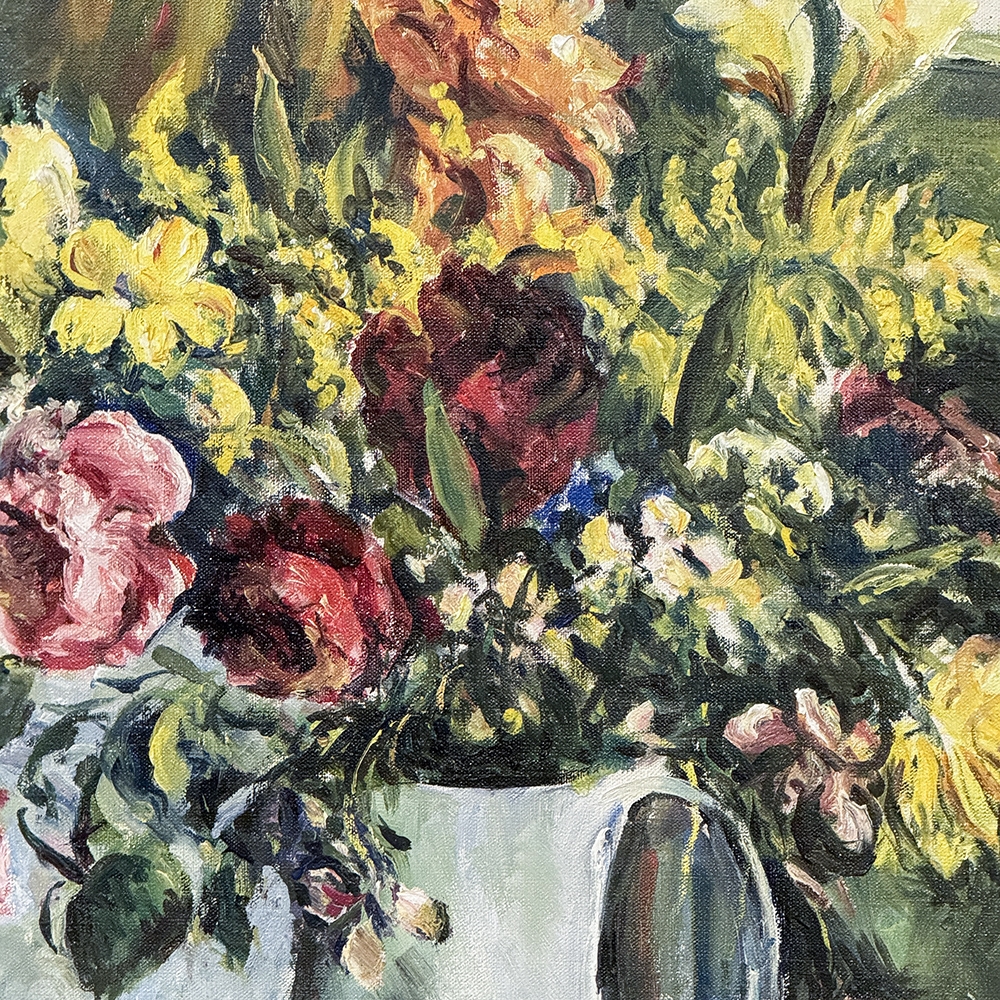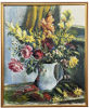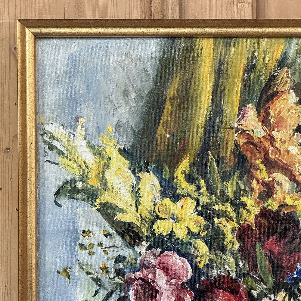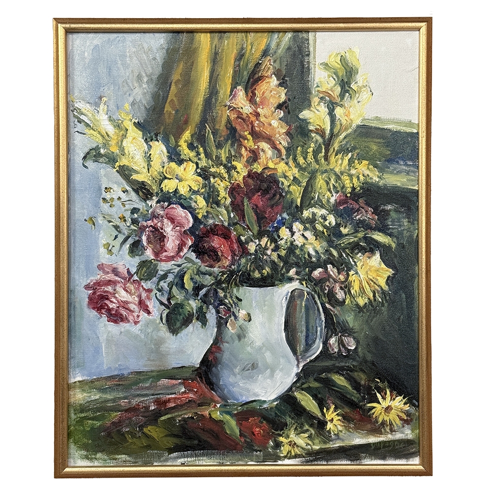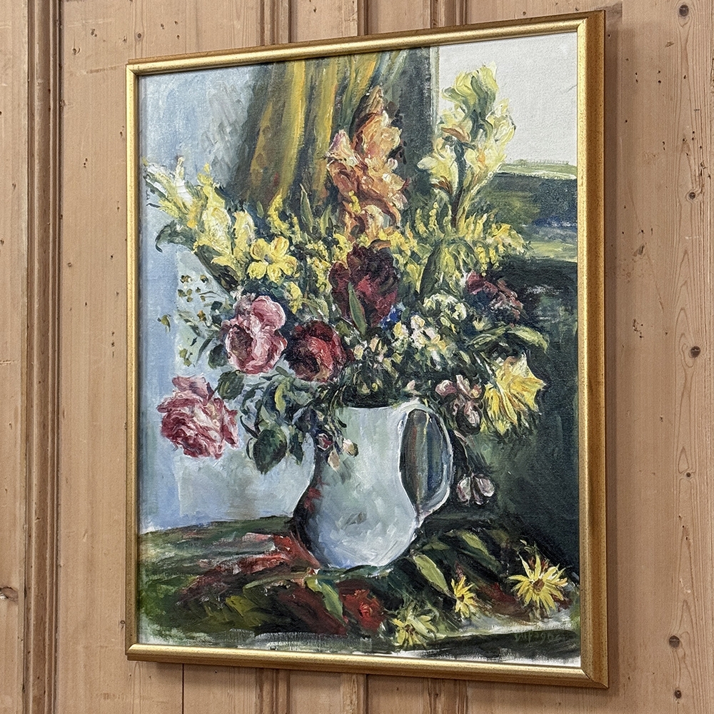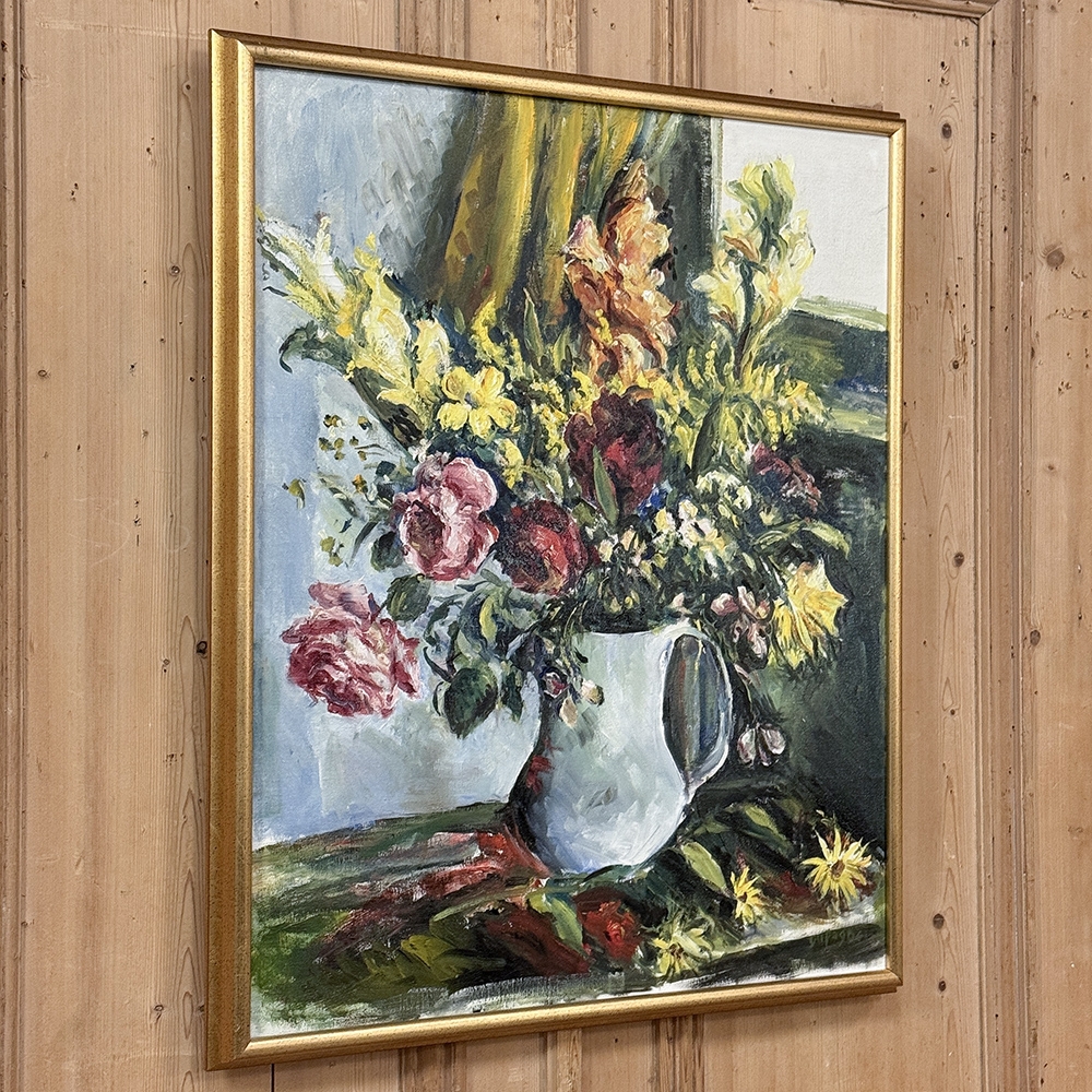 Framed Oil Painting on Canvas by Adrien Dupagne (1889-1980) is a lovely still life in an impressionistic tone with vibrant colors with the vase as a pitcher placed next to a window. The flowers appear to be freshly picked and arranged and stand out against the comparatively muted background. Frame appears to be original. Dupagne studied at the Academy of Fine Arts of Liege, graduating in 1910 as a sculptor, but soon after followed the advice of his teachers and learned the art of painting. In 1912 he assisted in London with sculptures for the decoration of the Titanic. His life's interests took him all over the world, even to America in his 60's, and his works have been exhibited worldwide as well, including Riga, and can still be found in several museums in Brussels, Antwerp and Liege.