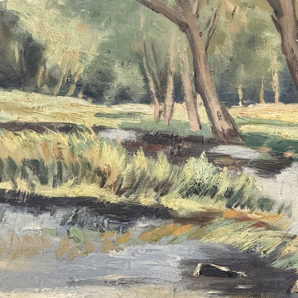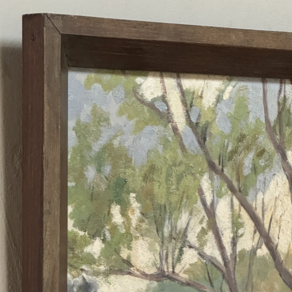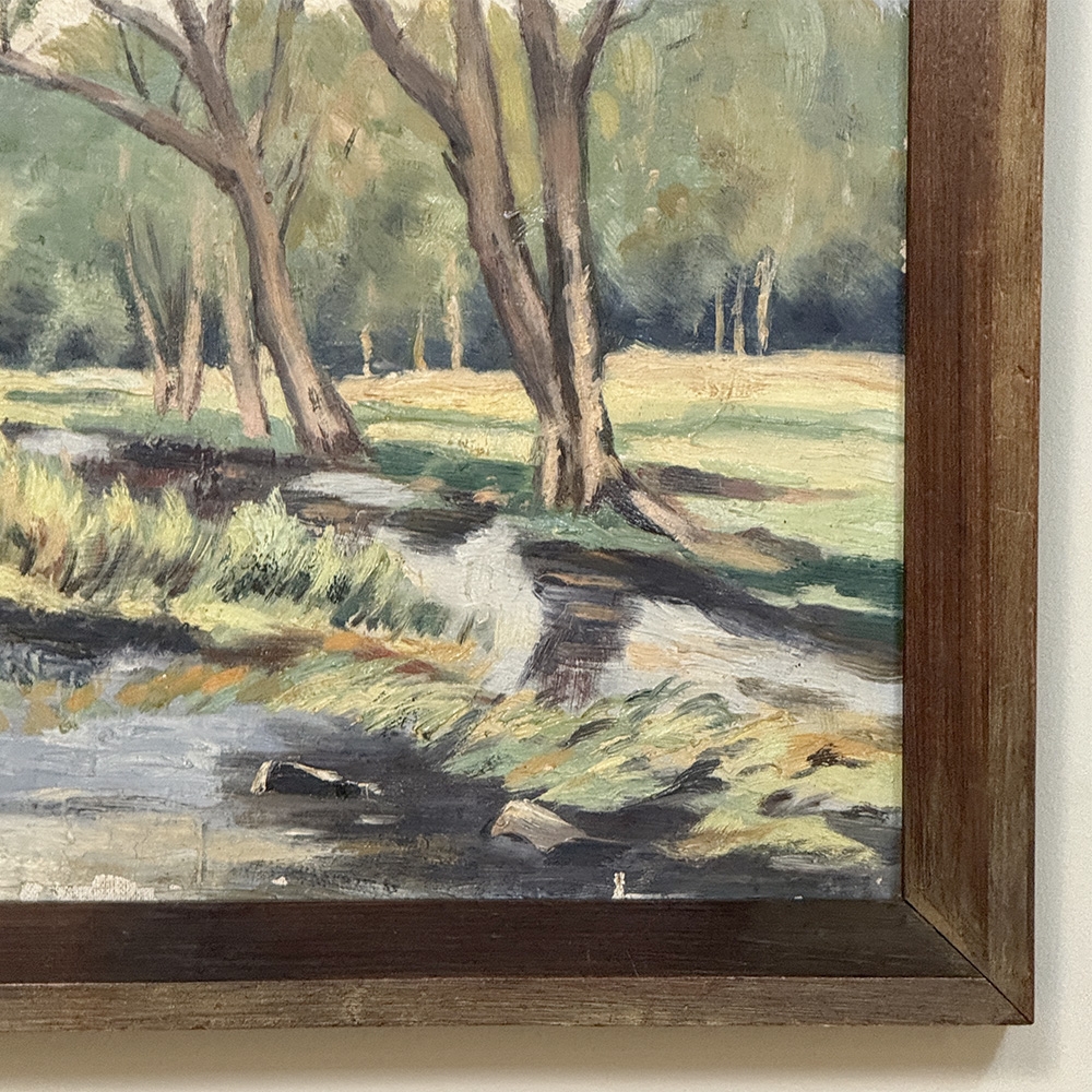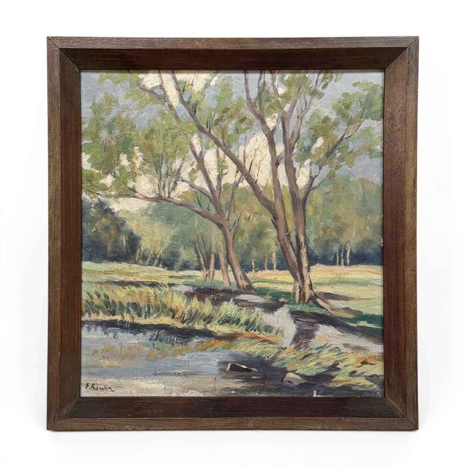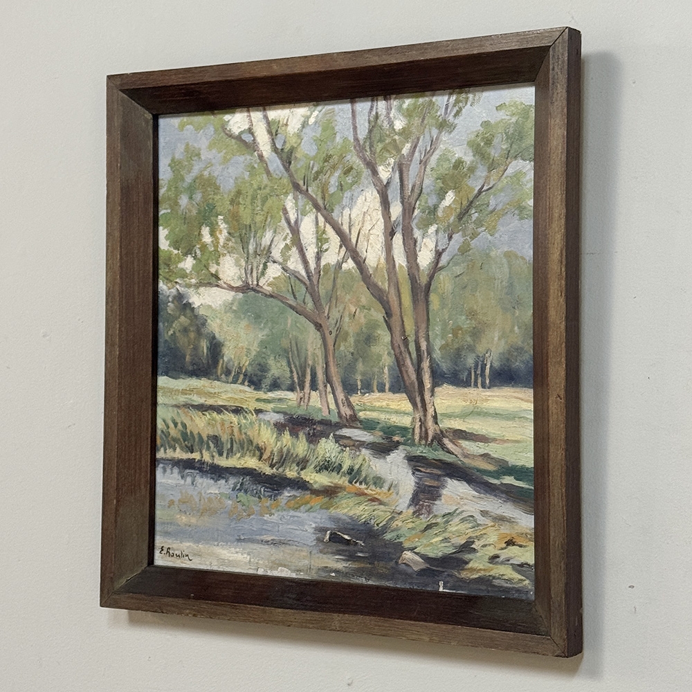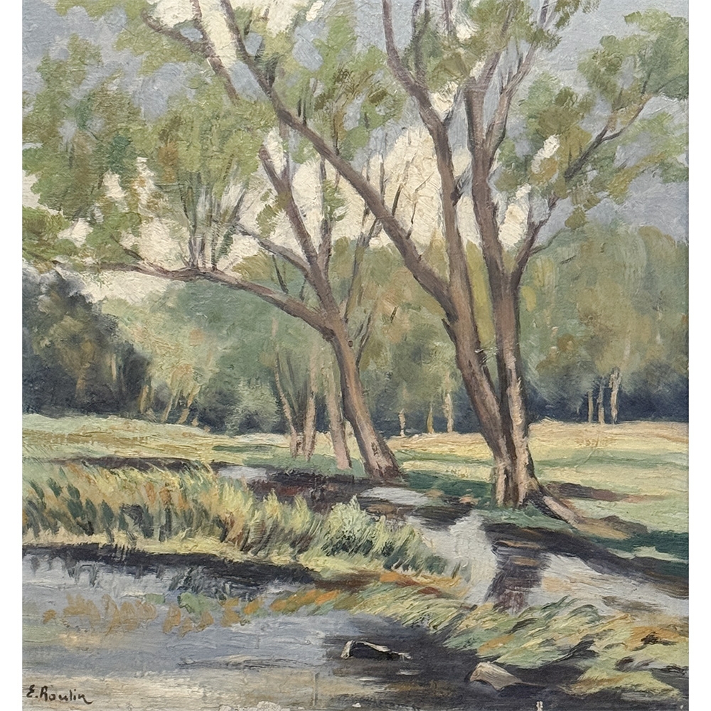 Framed Oil Painting on Canvas by Emile Roulin captures a peaceful woodland landscape with a gentle stream winding through the foreground beneath a stand of slender trees. Soft greens, blue-grays, and warm earth tones create a fresh, light-filled palette, while the painter’s loose yet confident brushwork gives the scene an easy naturalism and inviting movement. The composition has a restful, pastoral quality that draws the eye through the water, meadow, and trees with quiet charm. Housed in a simple frame that suits its unpretentious beauty, it is a lovely example of European landscape painting with a serene and collected presence.
