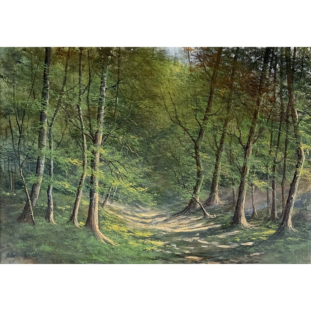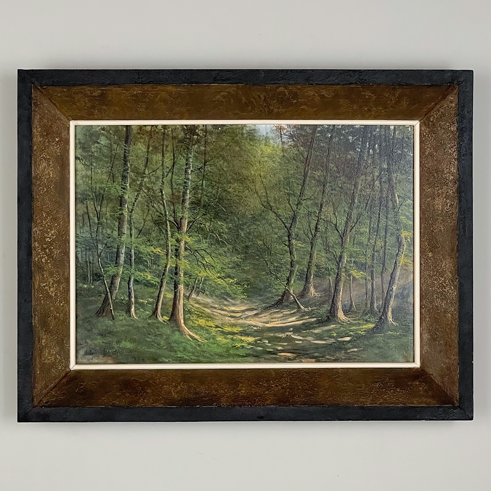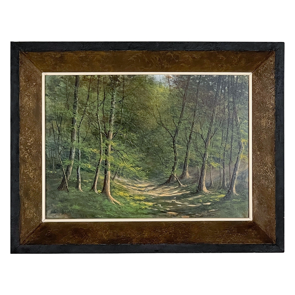 SaleFramed Oil Painting on Canvas by Ewald Kreusch (1895-1960) is a delightful study of an old-growth forest with a footworn path leading on to adventures beyond the horizon. Kreusch has used a splendid palette with varying shades of green to create a lush look that invites one into the scene. Survives in its original frame.