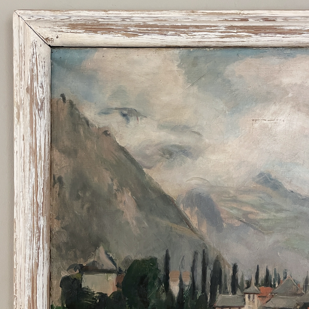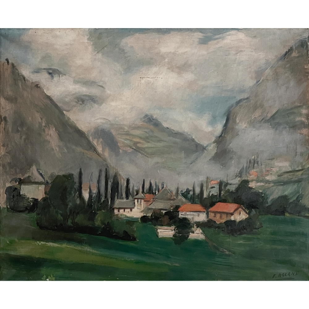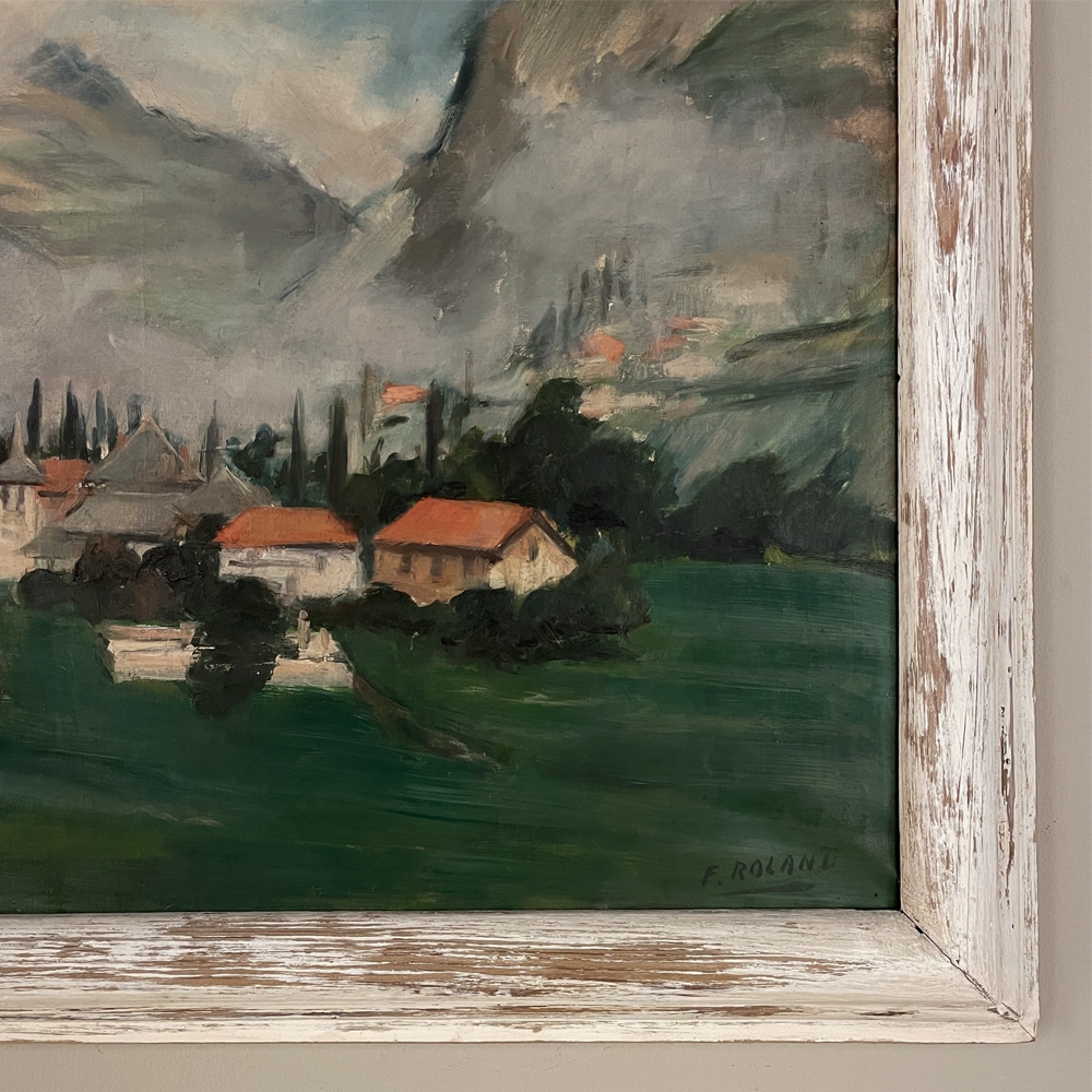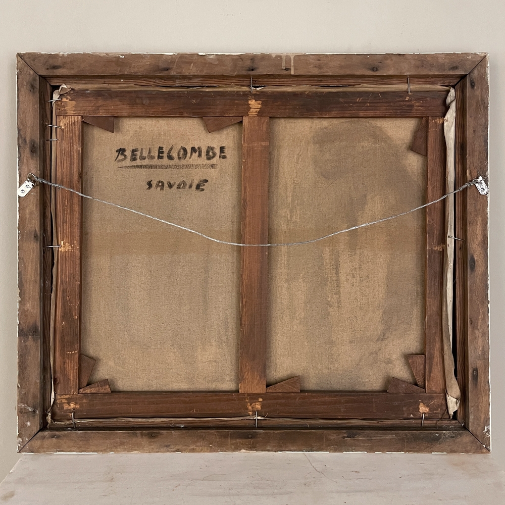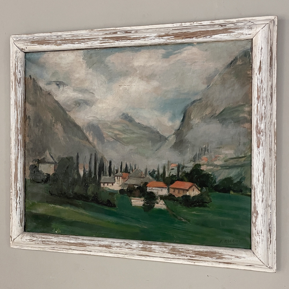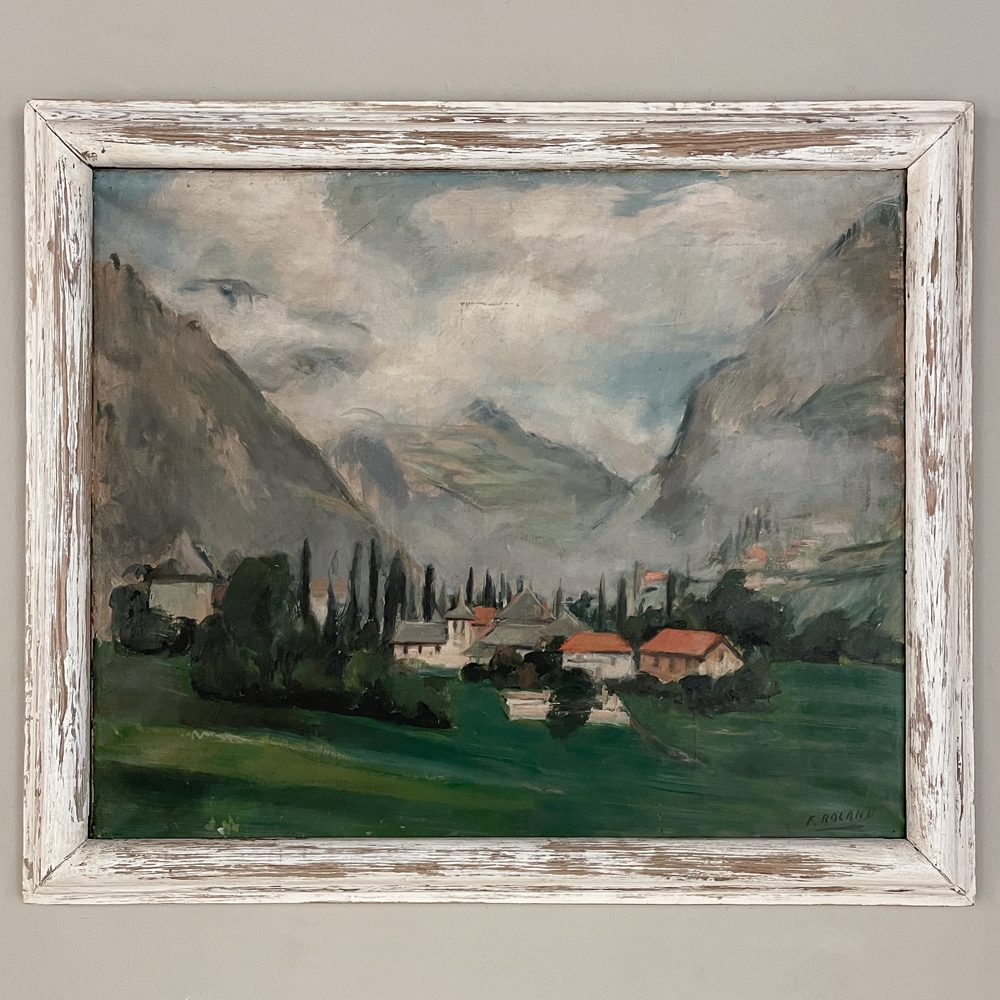 Framed Oil Painting on Canvas by Flory Roland (1905-1978) is a splendid view of the quaint little community of Bellecombe in the Savoie region, equidistant from Geneva and Grenoble nestled in a valley of the Alps not too far from the Italian border. The abrupt elevations of the mountains envelope the little settlement, contrasted with color by the artist as well to emphasize the lush greenery of the valley compared to the harsh rocky terrain surrounding it. Survives in its original distressed painted frame.