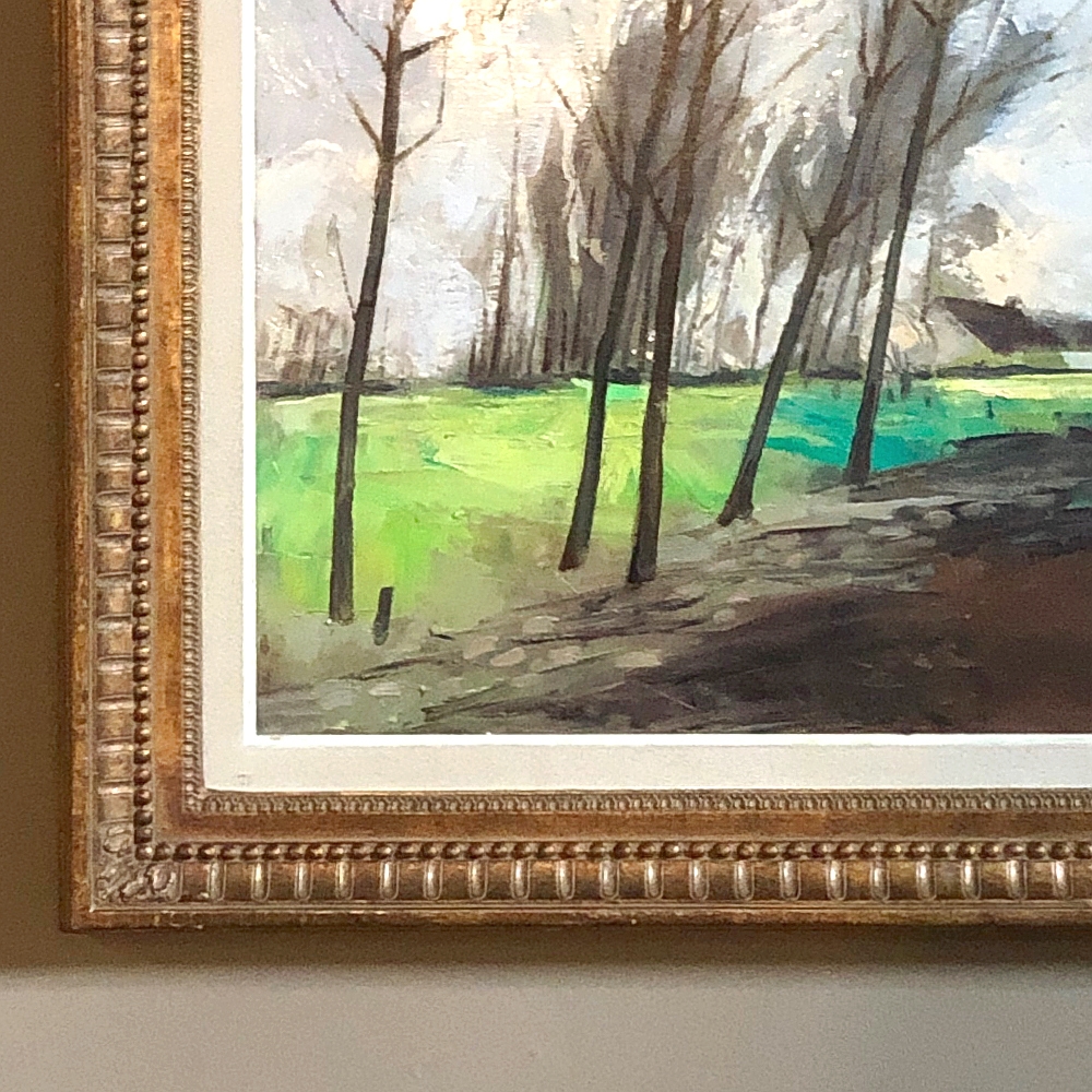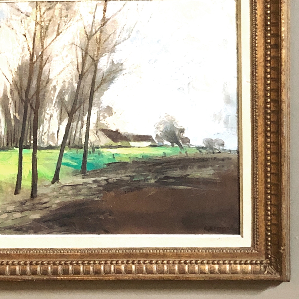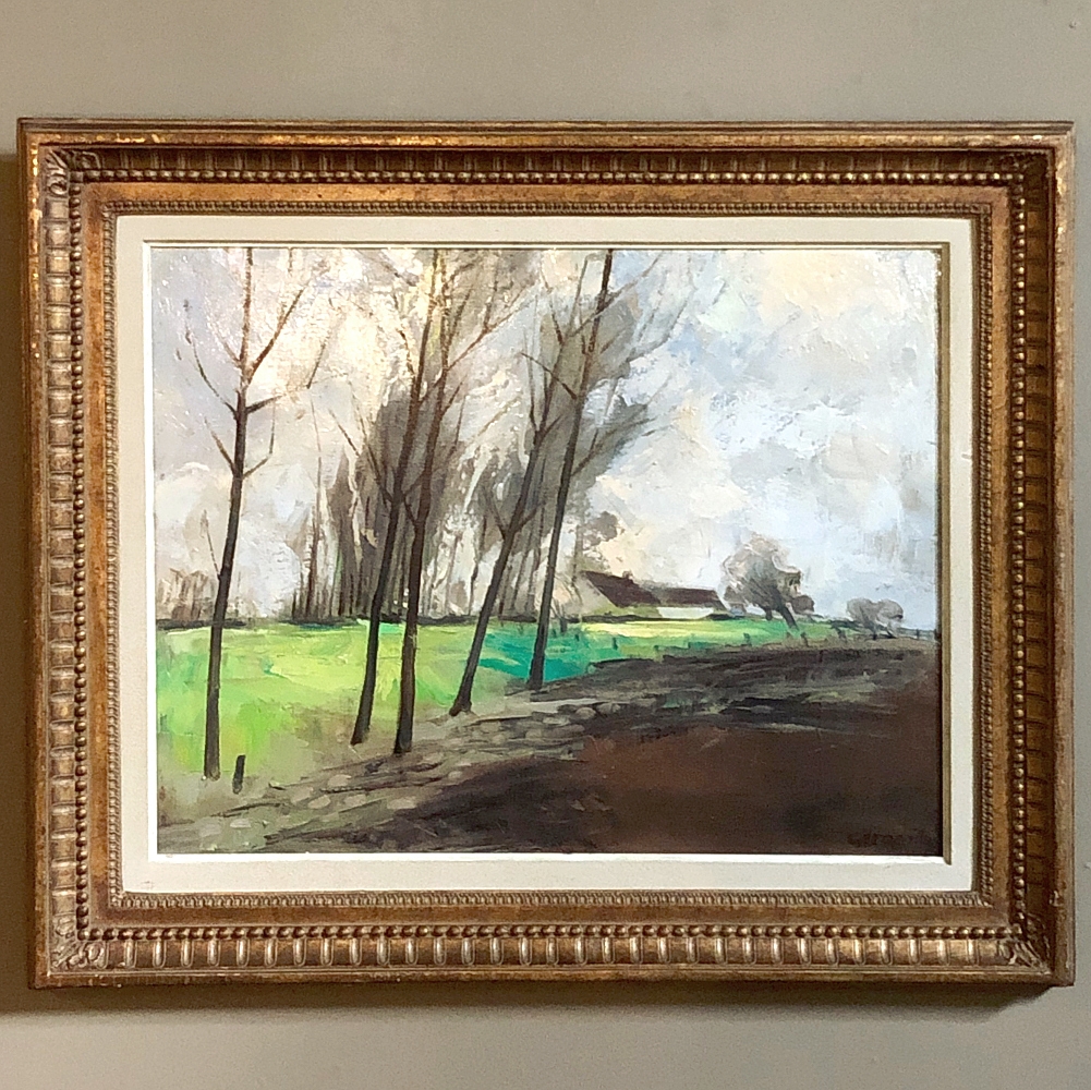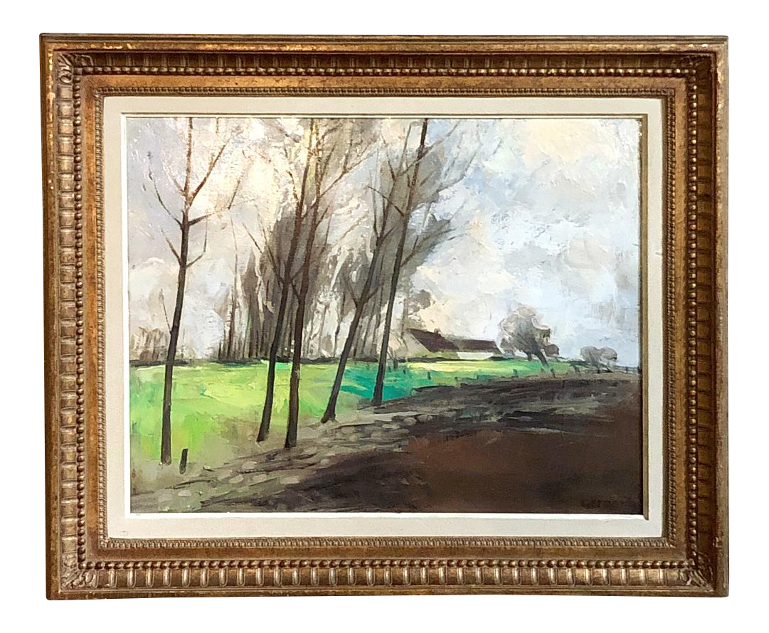 Framed Oil Painting on Canvas by Geroen depicts a quaint country cottage in a rustic, rural setting, with bold, impressionist-inspired strokes and subtle coloration blends. Set in its original frame.