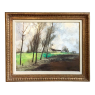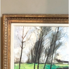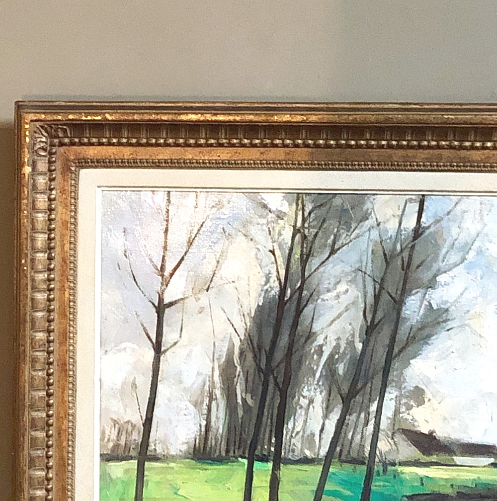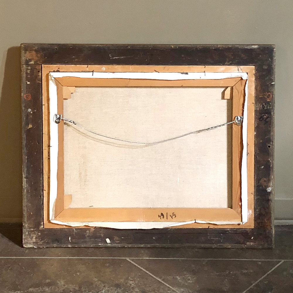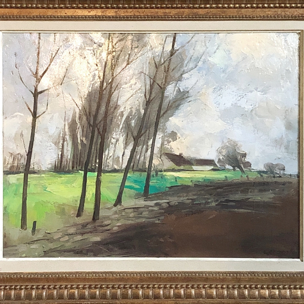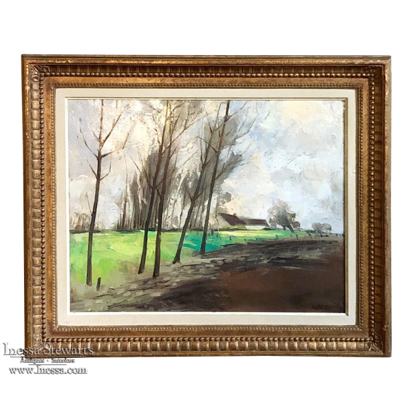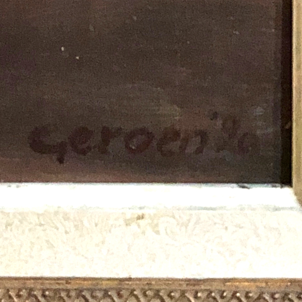 Framed Oil Painting on Canvas by Geroen depicts a quaint country cottage in a rustic, rural setting, with bold, impressionist-inspired strokes and subtle coloration blends. Set in its original frame.