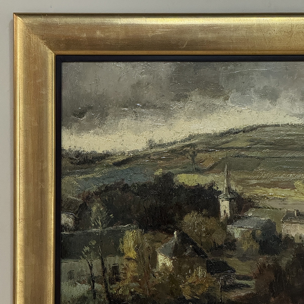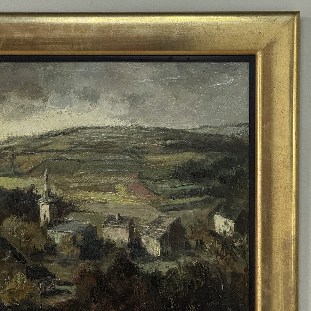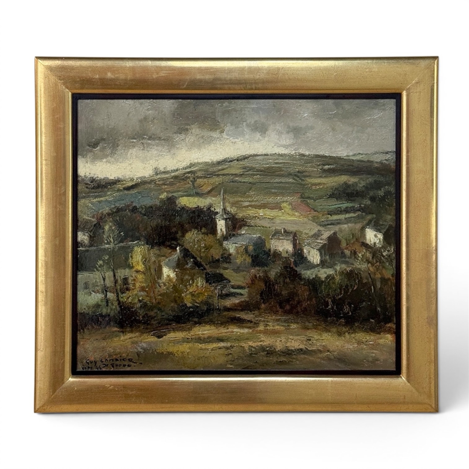 Framed Oil Painting on Canvas by Guy Cambier (1923–2008), Dated 1946, 'Village Landscape' is a richly painted pastoral, is full of depth, texture, and beautifully handled detail. The artist applies the paint with confidence, building the hillside, rooftops, trees, and distant church with strong, expressive brushwork that gives the composition real presence and atmosphere. The eye is drawn naturally down into the village, where the clustered houses and rising spire create a wonderful sense of place and invite you further into the scene.