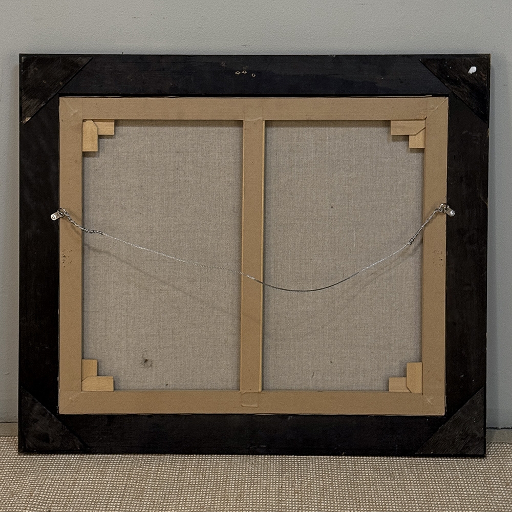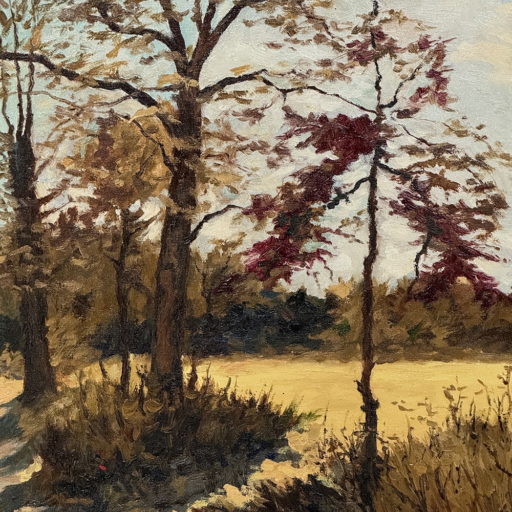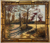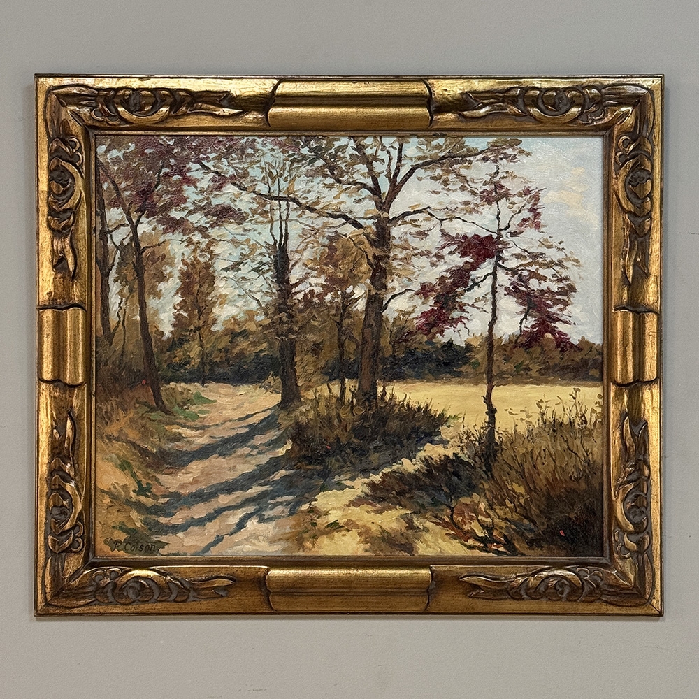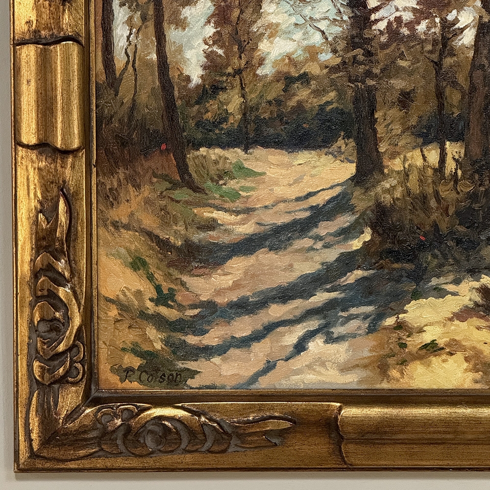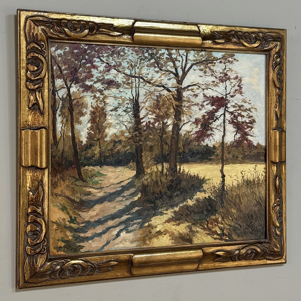 Framed Oil Painting on Canvas by P. Colson celebrates a Ray of Sunshine in Autumn. Set in its original decorative gold frame, it appears the artist was traveling down a country path and was inspired by the fall scenery. The intriguing composition is made more compelling by the impressionistic style. The autumnal color palette is also of note, with a cloudy yet bright day perfect for capturing on canvas.