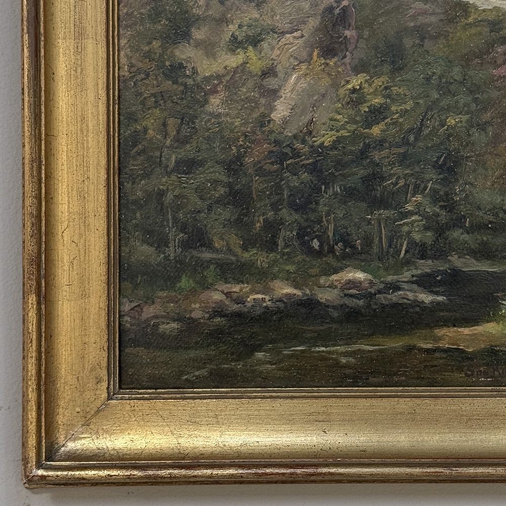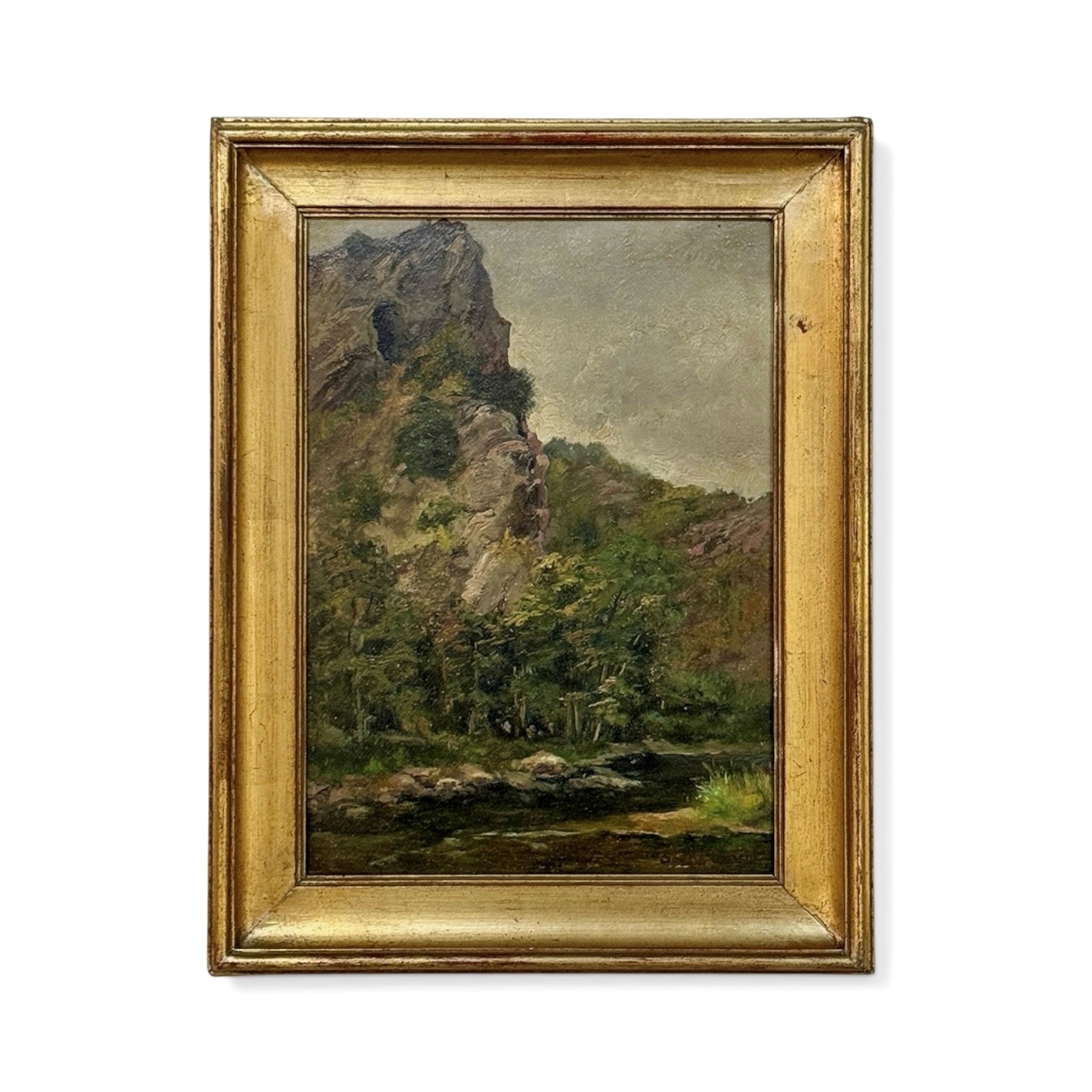 Here the artist turns his attention to rising rock formations, trees, and open sky, balancing the composition with a sense of structure and ease. The vertical format gives the scene an appealing lift, drawing the eye upward and emphasizing the natural monumentality of the terrain. Souky’s brushwork remains soft and evocative, favoring mood and light over hard definition, which gives the painting its lyrical and reflective quality. Housed in its gilt frame, the work has a timeless decorative presence while preserving the romantic spirit of the landscape.