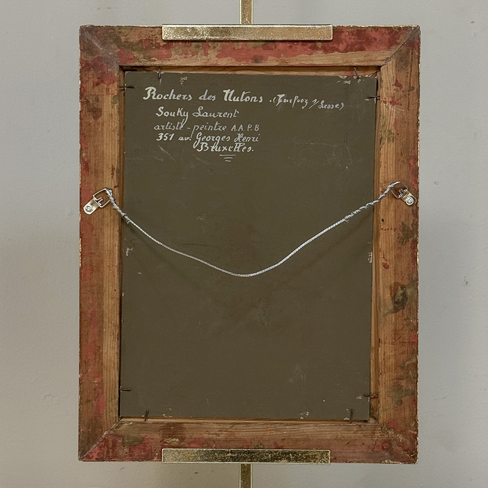This framed oil painting on panel by Laurent Souky (1914–2005) offers a more vertical and dramatic interpretation of the landscape, focusing on the rugged natural beauty suggested by its title, Rochers des Nutons. A Belgian 20th century painter known for landscape views, Souky worked with an atmospheric, painterly style that brings a quiet poetry to the natural world.