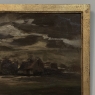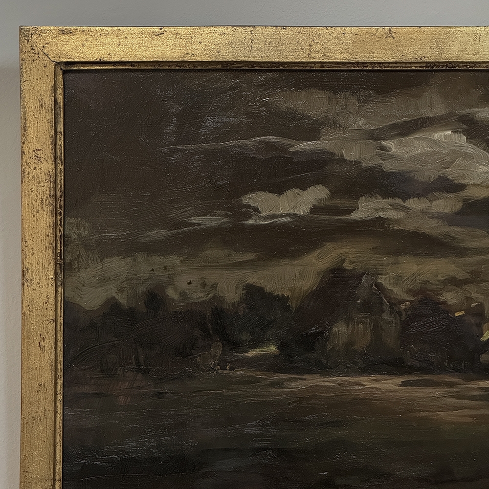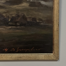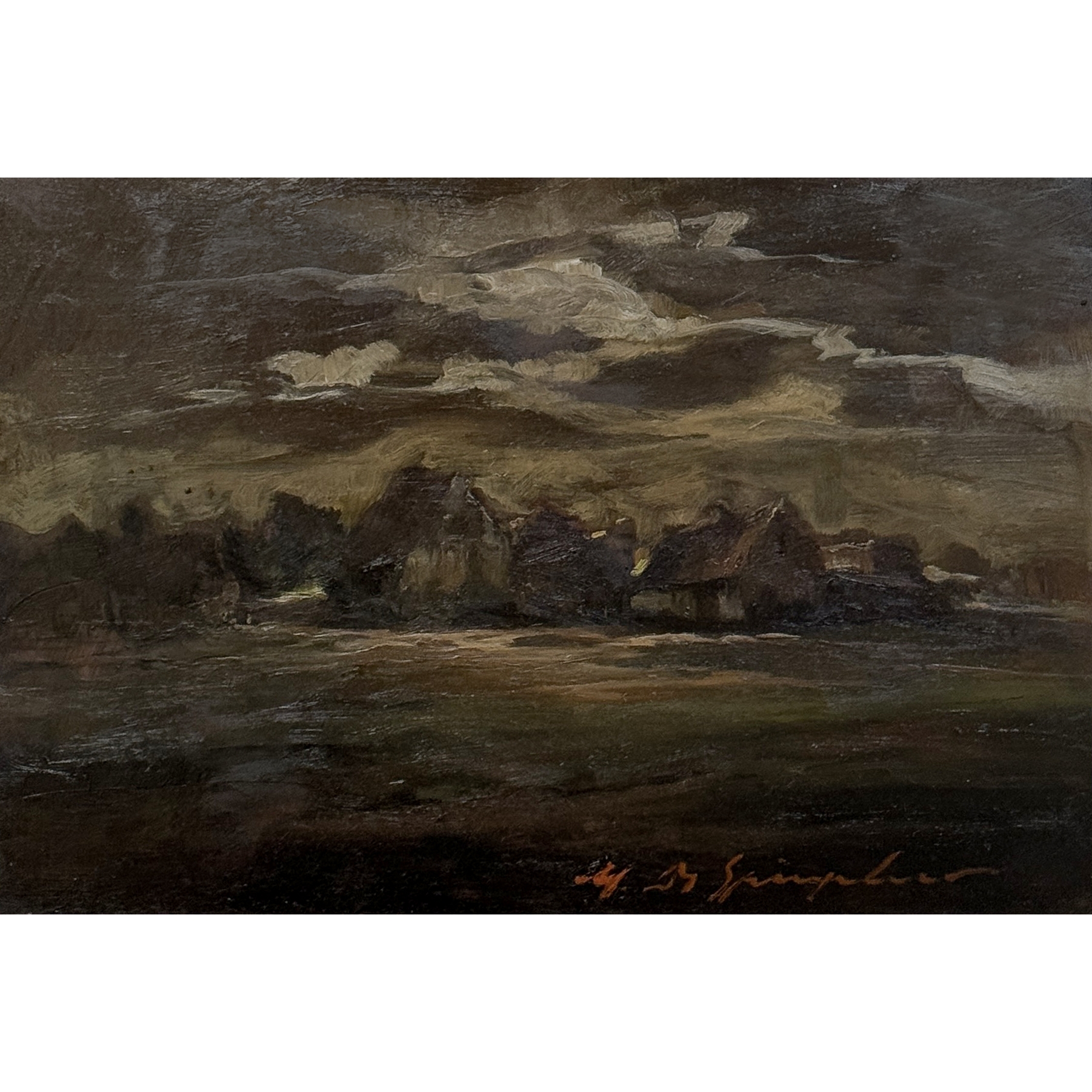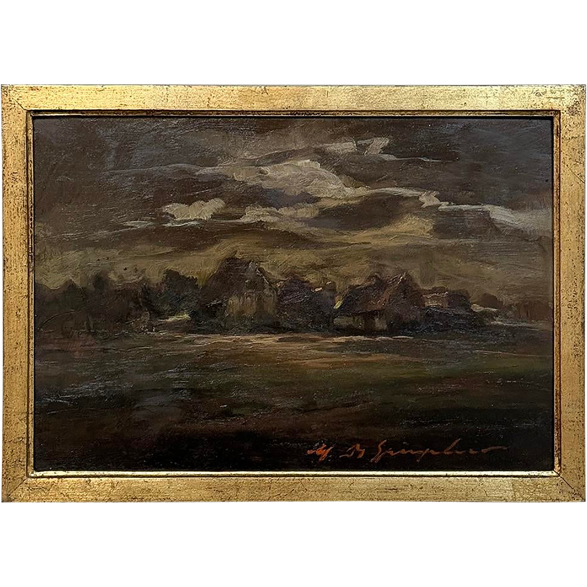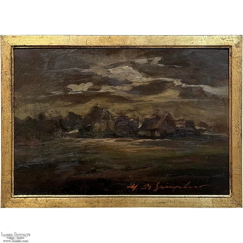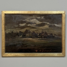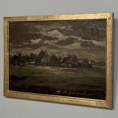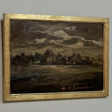 Framed Oil Painting on Panel by Marthe de Spiegeleir (1897-1991) is a wonderful post-impressionist work depicting a quaint country village illuminated by a full moon behind overcast skies. One can imagine a hunter returning from the day ready to rest, relax and have some dinner coming upon this most welcome sight. De Spiegeleir was a prolific artist who lived to age 94, and in her full lifetime was able to capture the essence of rural life in Northern Europe, consisting primarily of landscapes and human interest studies. Her works, such as this one with its original frame, tended to be smaller in size, making them ideal for groupings or accents for cozy spaces. Note her mastery of muted light and exploration of a broad palette surrounding basic earth tones and a myriad shades of gray.