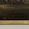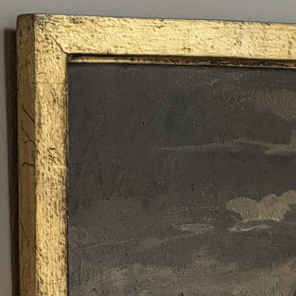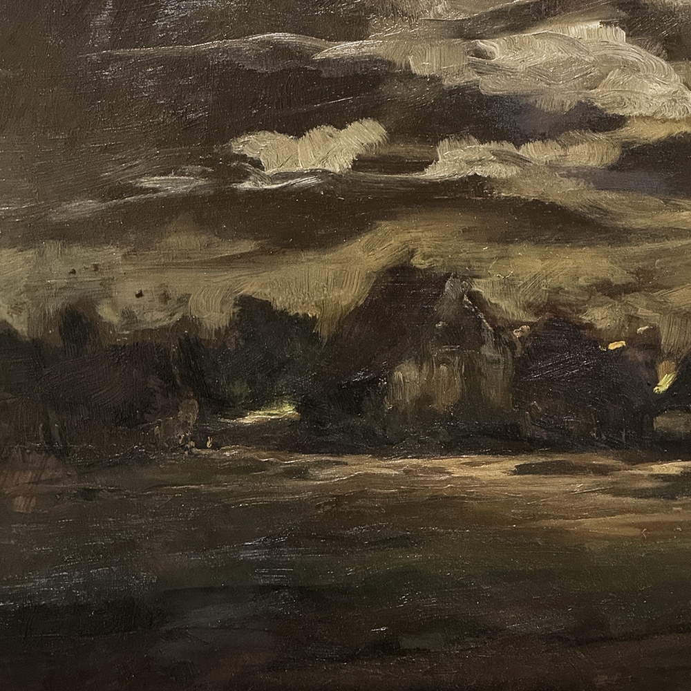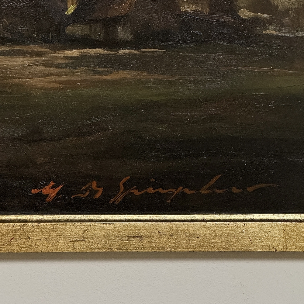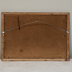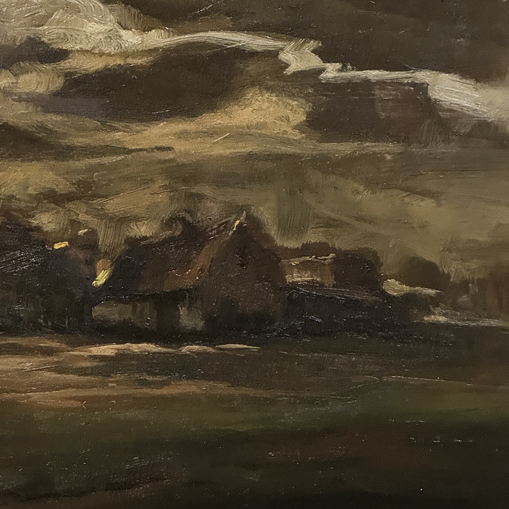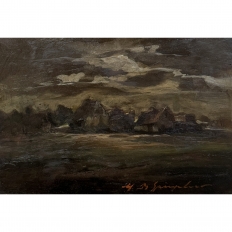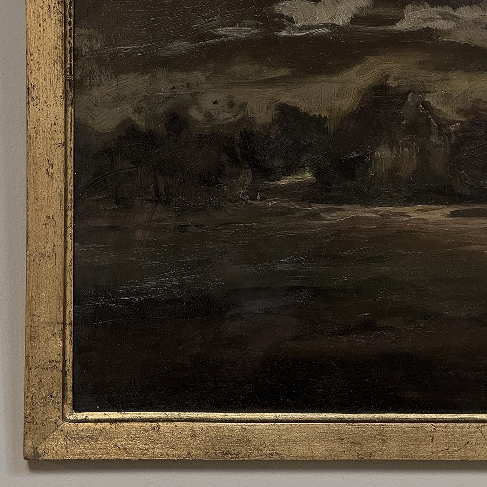 Framed Oil Painting on Panel by Marthe de Spiegeleir (1897-1991) is a wonderful post-impressionist work depicting a quaint country village illuminated by a full moon behind overcast skies. One can imagine a hunter returning from the day ready to rest, relax and have some dinner coming upon this most welcome sight. De Spiegeleir was a prolific artist who lived to age 94, and in her full lifetime was able to capture the essence of rural life in Northern Europe, consisting primarily of landscapes and human interest studies. Her works, such as this one with its original frame, tended to be smaller in size, making them ideal for groupings or accents for cozy spaces. Note her mastery of muted light and exploration of a broad palette surrounding basic earth tones and a myriad shades of gray.