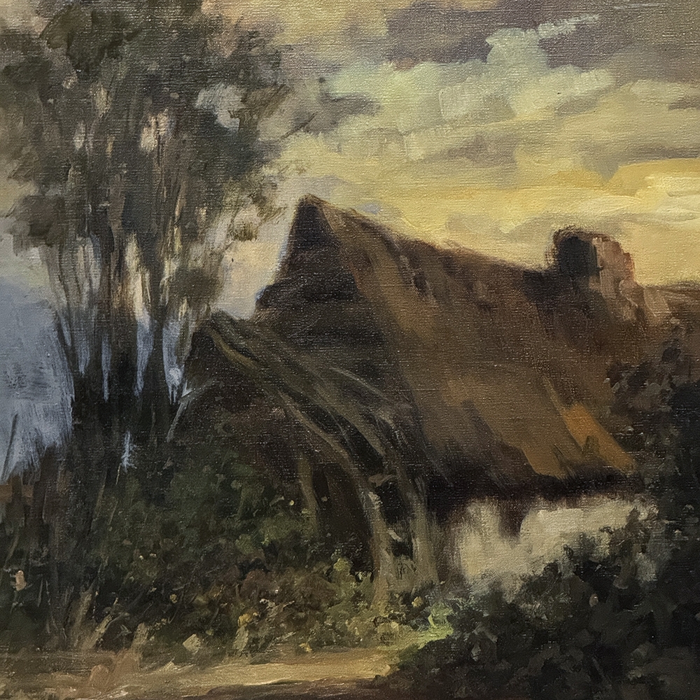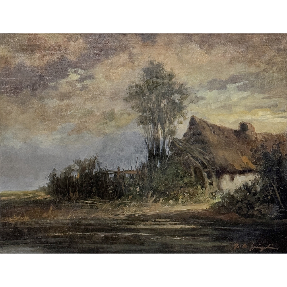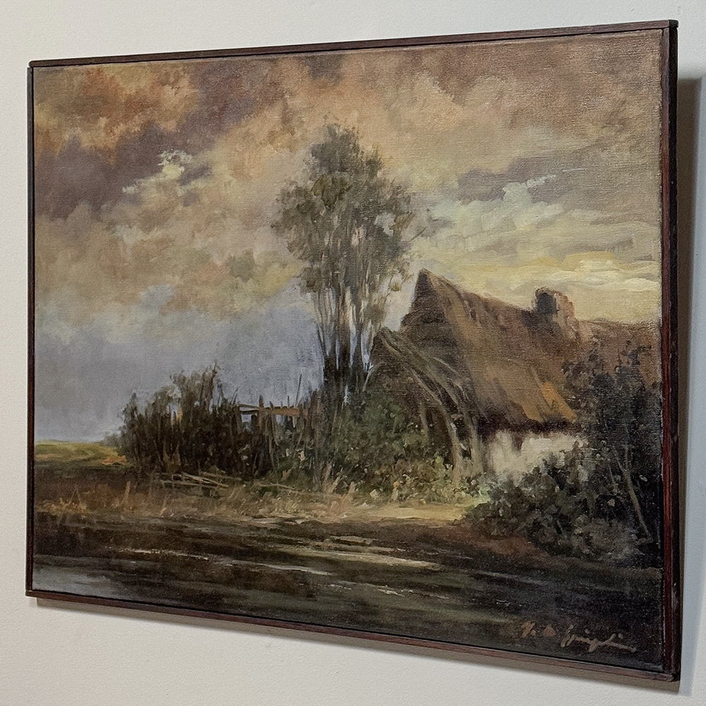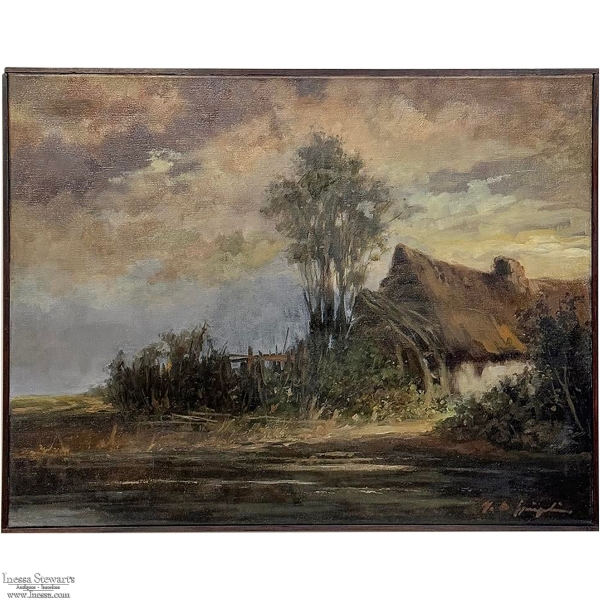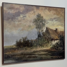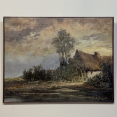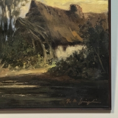 Framed Oil Painting on Panel by Marthe de Spiegeleir (1897-1991) is a splendid post-impressionist work depicting a charming country cottage on a late afternoon. The presence of an untended garden and a thatch roof that is in need of repair indicate the home was probably abandoned by the time the artist discovered and was inspired by it. De Spiegeleir was a prolific artist who lived to age 94, and in her full lifetime was able to capture the essence of rural life in Northern Europe, consisting primarily of landscapes and human interest studies. Her works, such as this one with its original frame, tended to be smaller in size, although this example is somewhat larger. Note her mastery of muted light and exploration of a broad palette surrounding basic earth tones and a myriad shades of gray.