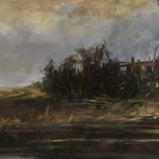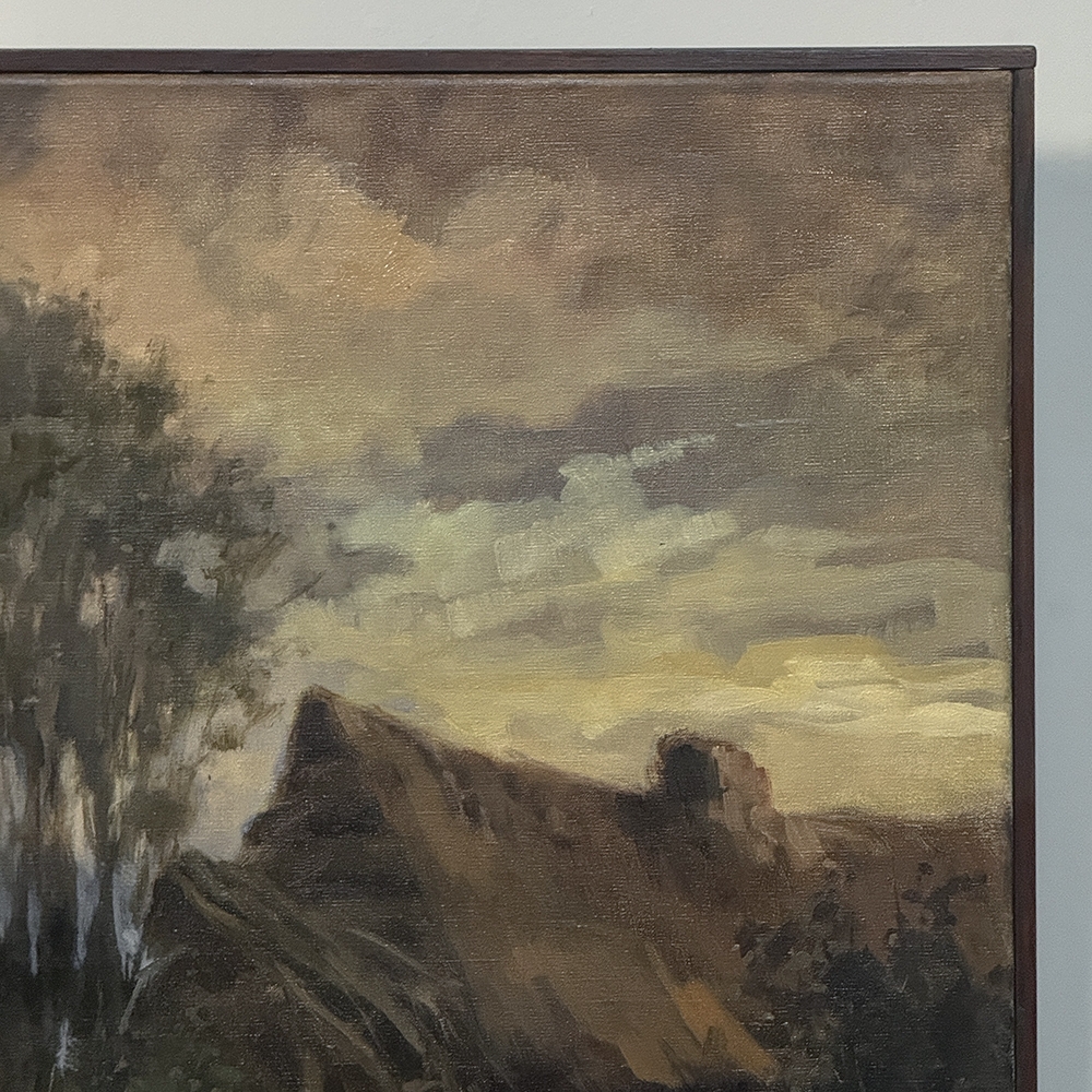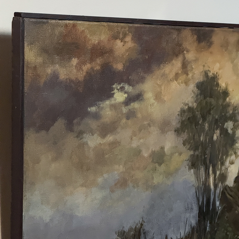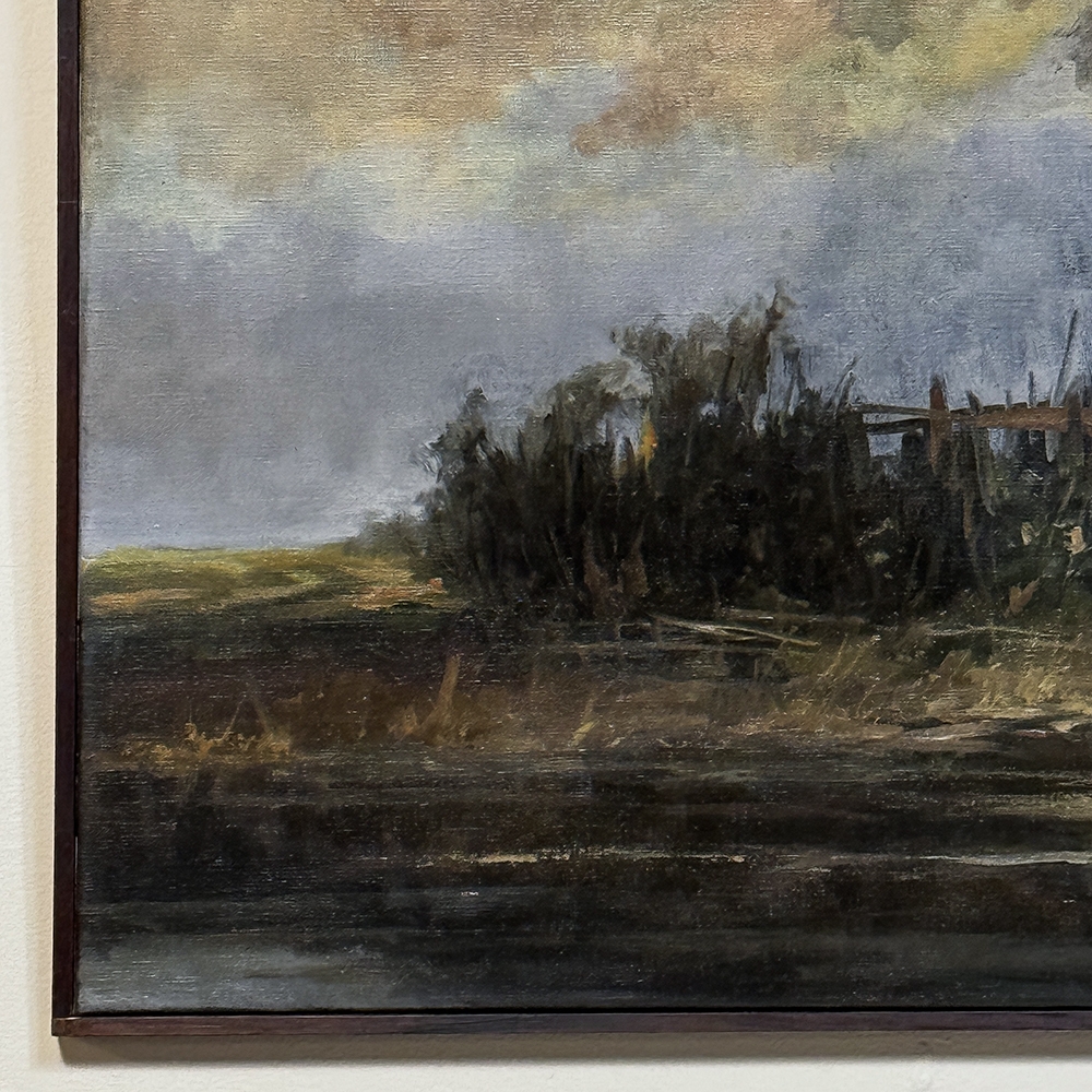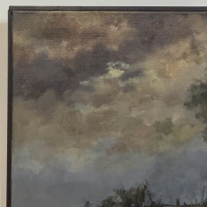 Framed Oil Painting on Panel by Marthe de Spiegeleir (1897-1991) is a splendid post-impressionist work depicting a charming country cottage on a late afternoon. The presence of an untended garden and a thatch roof that is in need of repair indicate the home was probably abandoned by the time the artist discovered and was inspired by it. De Spiegeleir was a prolific artist who lived to age 94, and in her full lifetime was able to capture the essence of rural life in Northern Europe, consisting primarily of landscapes and human interest studies. Her works, such as this one with its original frame, tended to be smaller in size, although this example is somewhat larger. Note her mastery of muted light and exploration of a broad palette surrounding basic earth tones and a myriad shades of gray.