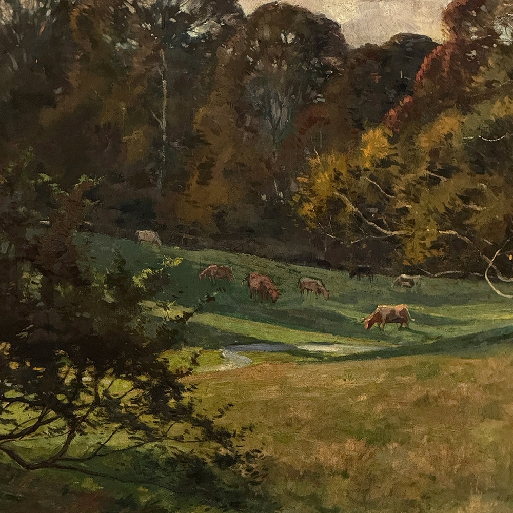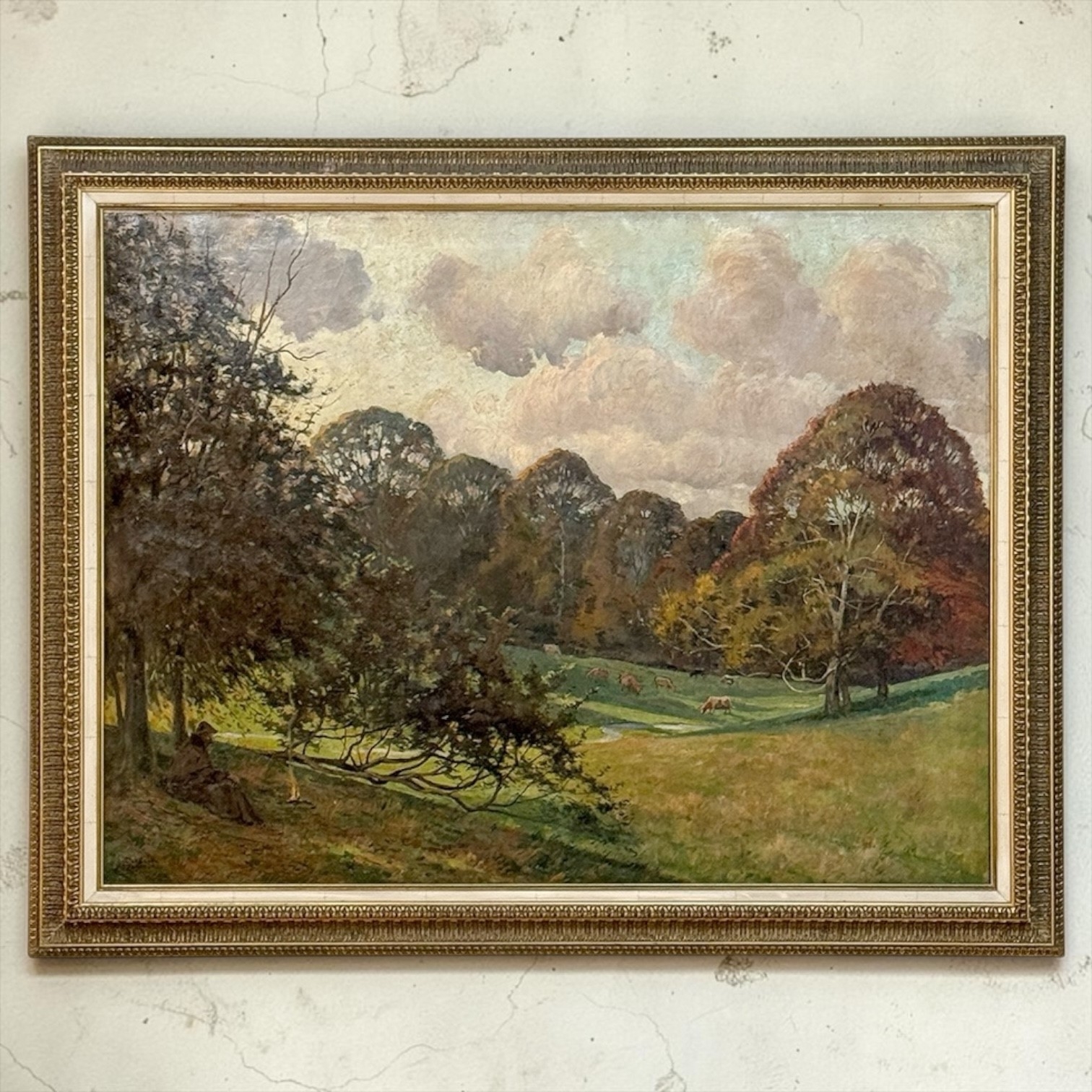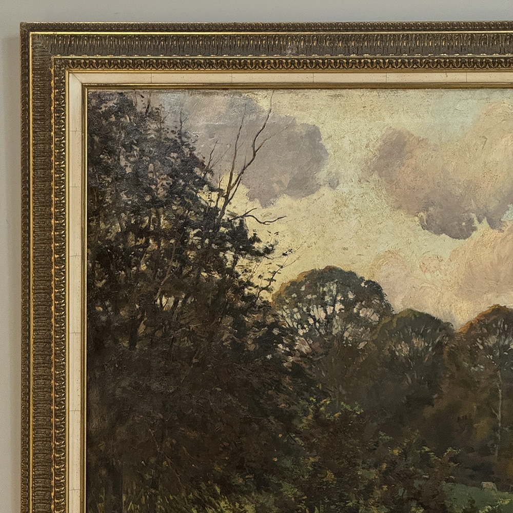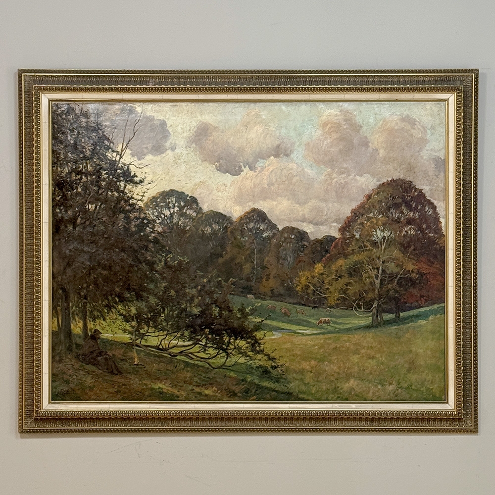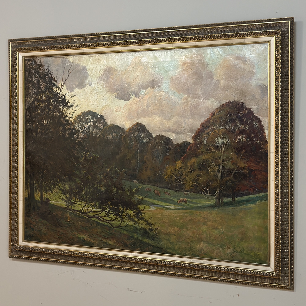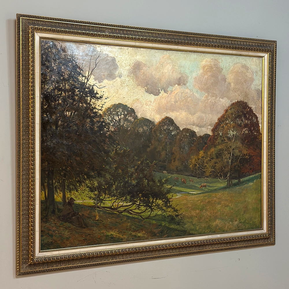 This framed oil painting on canvas by Belgian artist Léon Dardenne presents far more than a beautifully observed pastoral landscape. Beneath a luminous, cloud-filled sky, grazing cattle move peacefully through an open meadow, while in the shaded foreground a solitary seated figure, likely a shepherd, keeps watch beside a small fire. That quiet human presence gives the composition a deeper resonance, introducing themes of guardianship, patience, and rural life lived in close rhythm with the land. Dated 1897, the painting is handled with refined naturalism and rich atmospheric color, balancing the grandeur of the landscape with a moving sense of stillness and responsibility.