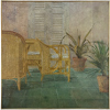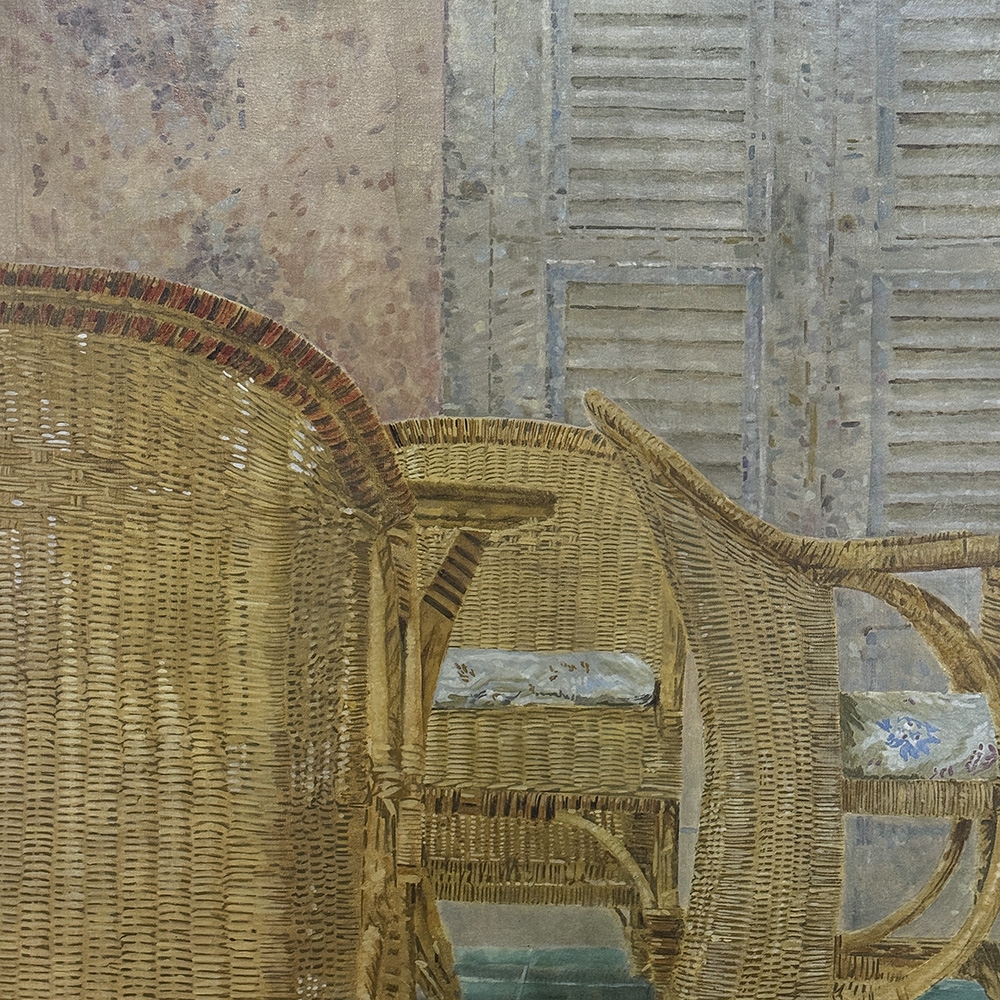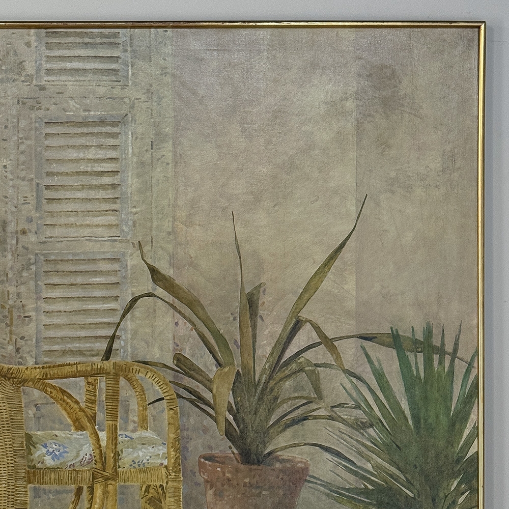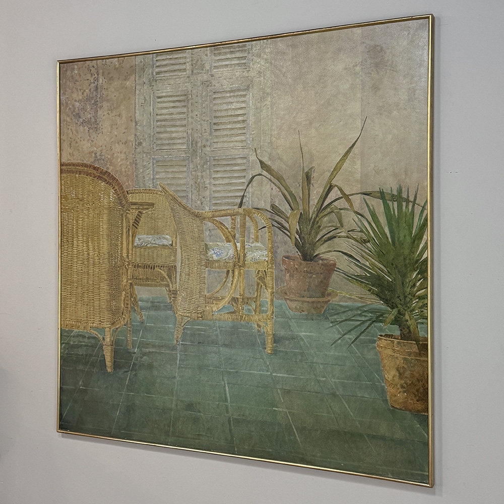 Grand Oil Painting on Canvas by Jaap Schlee (1946-2014) ca. 1980 is a marvelous example of the artist's work, just prior to his embarking on an extensive pencil study of his favorite author, Paul Leautaud for which he is world-renowned. Painted on a grand scale almost exactly five feet square, this scene depicts a veranda in a sub-tropical climate with the emphasis on the interior space. The geometry of the wicker furniture and tile floor is amazing, with jaloused windows between stucco walls as a backdrop. The realism of the scene coupled with the palette is visually stimulating, and it sports its original understated gold frame.