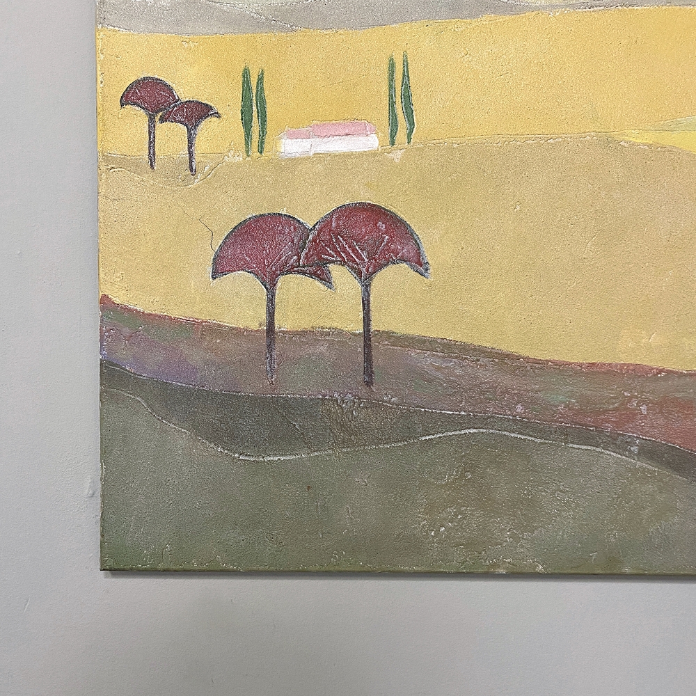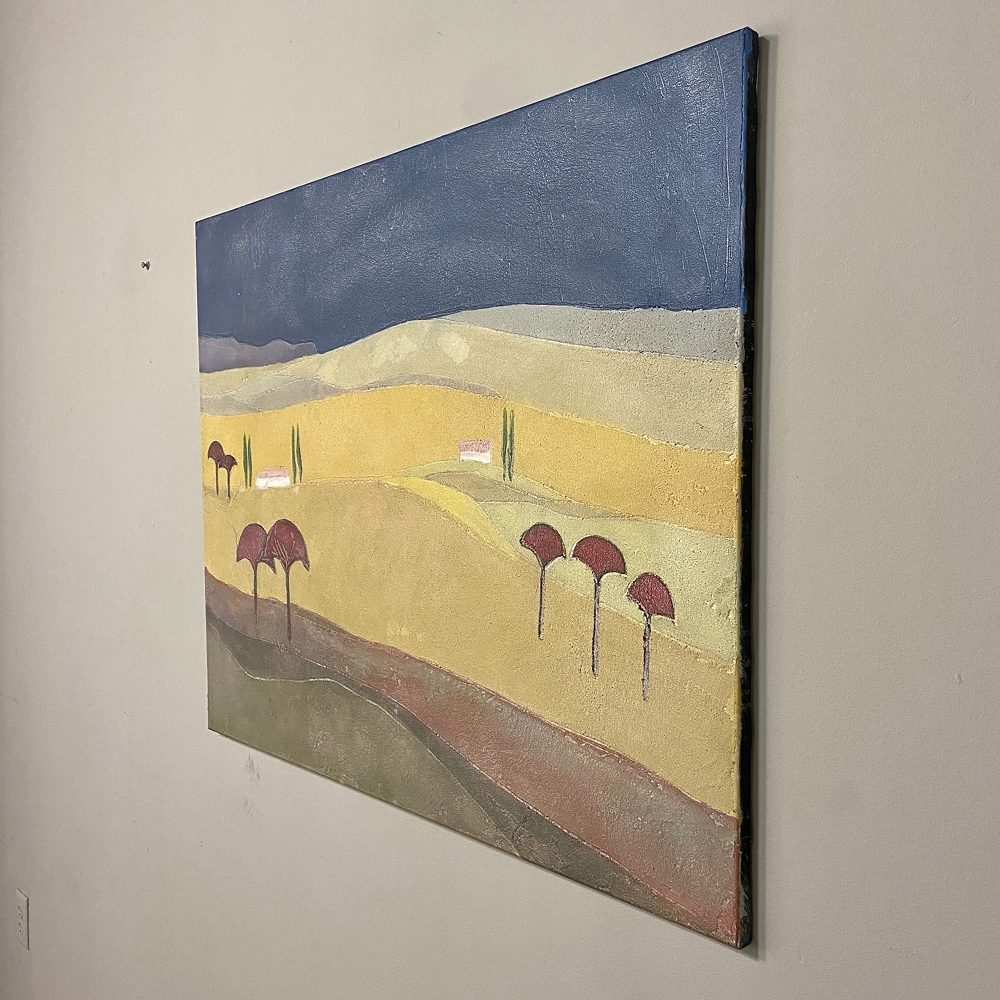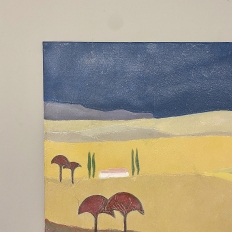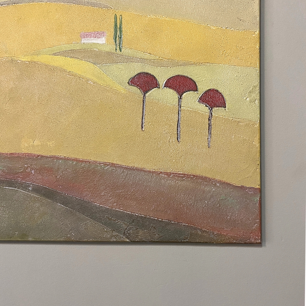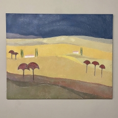 Mid-Century Oil Painting on Canvas by Michel Fouat is a splendid example of the artist's work, with a minimalist influence in the design countered by bold contrast using somewhat subdued earth tones to create an intriguing, fantastic landscape. Note how Michel creates depth between the sky, the distant hills, the closer hills, the rolling plains and the foreground which appears in a shadowy color shift. Italian cypress frame a rustic dwelling at the center of the composition, with ochre accents representing ornamental trees in the foreground.