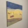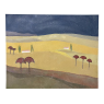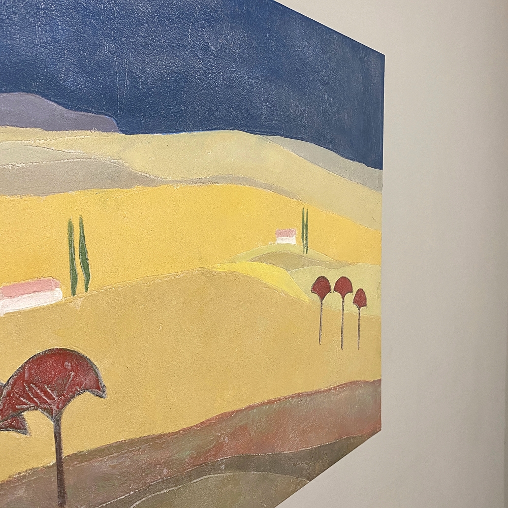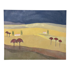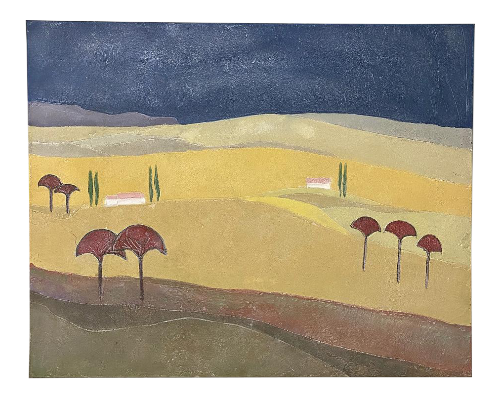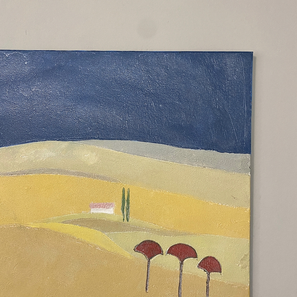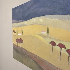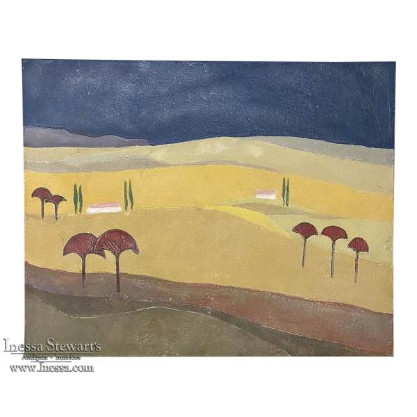 Mid-Century Oil Painting on Canvas by Michel Fouat is a splendid example of the artist's work, with a minimalist influence in the design countered by bold contrast using somewhat subdued earth tones to create an intriguing, fantastic landscape. Note how Michel creates depth between the sky, the distant hills, the closer hills, the rolling plains and the foreground which appears in a shadowy color shift. Italian cypress frame a rustic dwelling at the center of the composition, with ochre accents representing ornamental trees in the foreground.