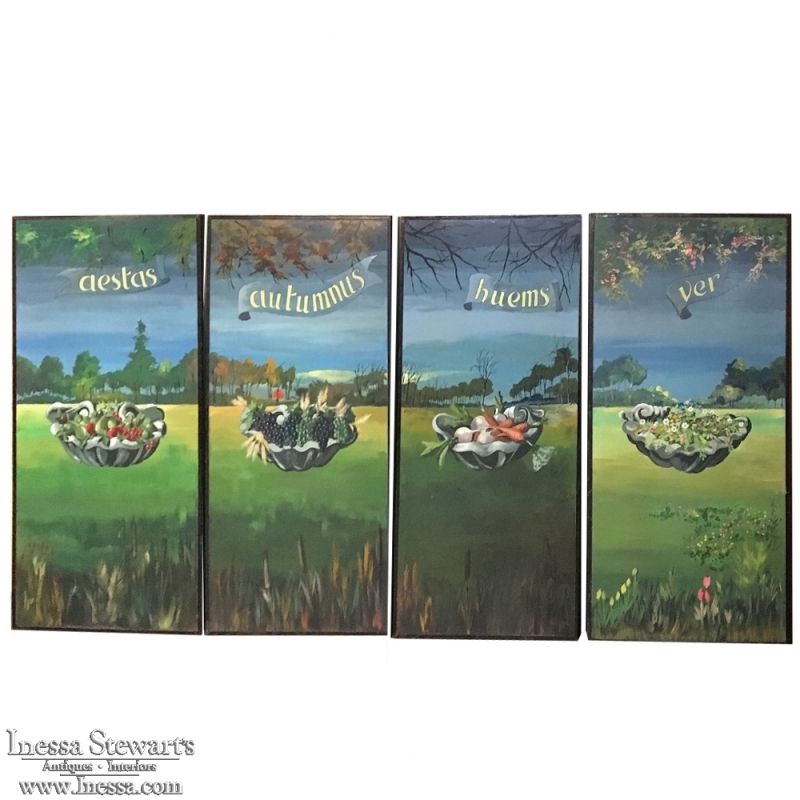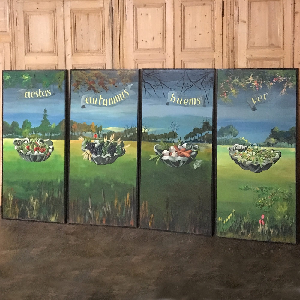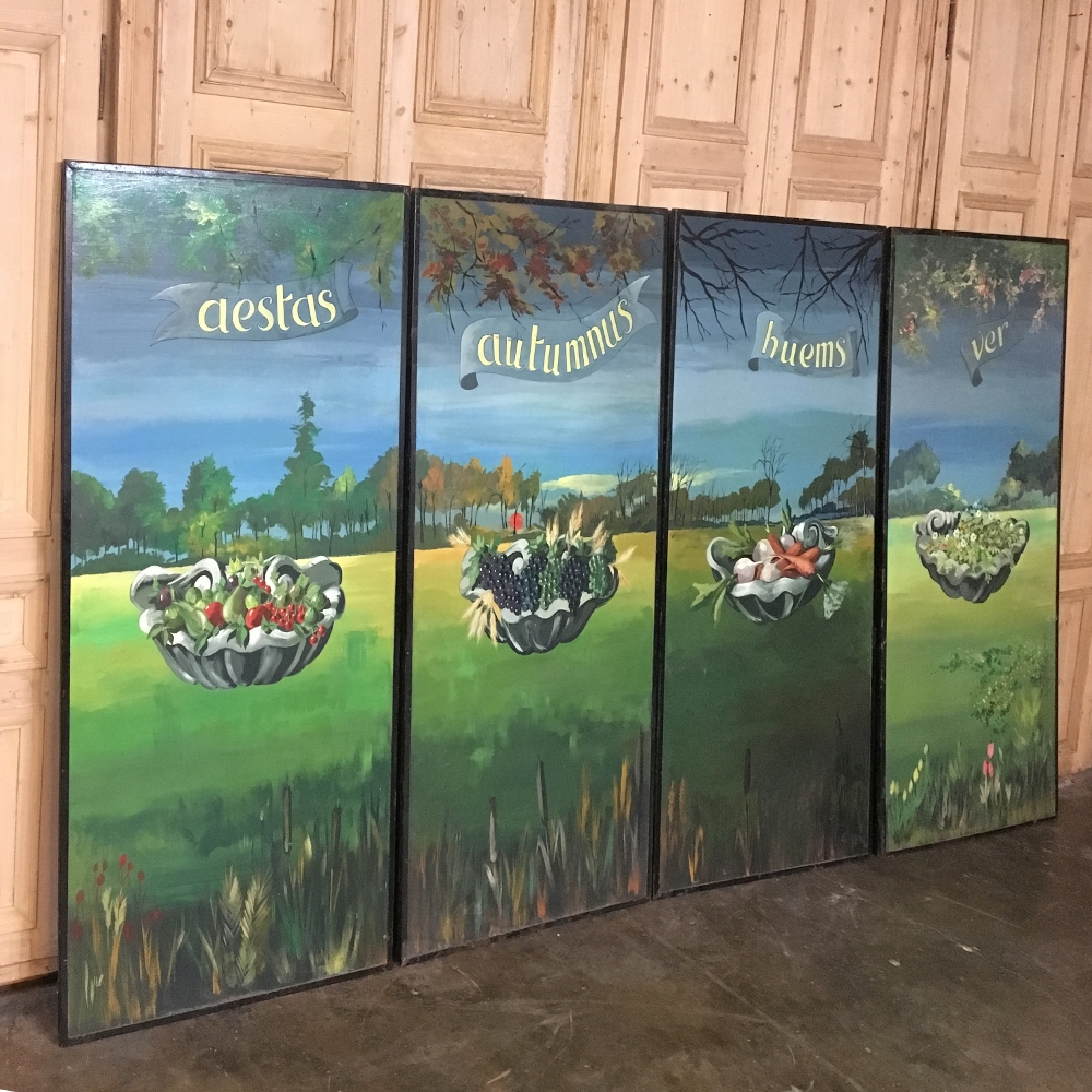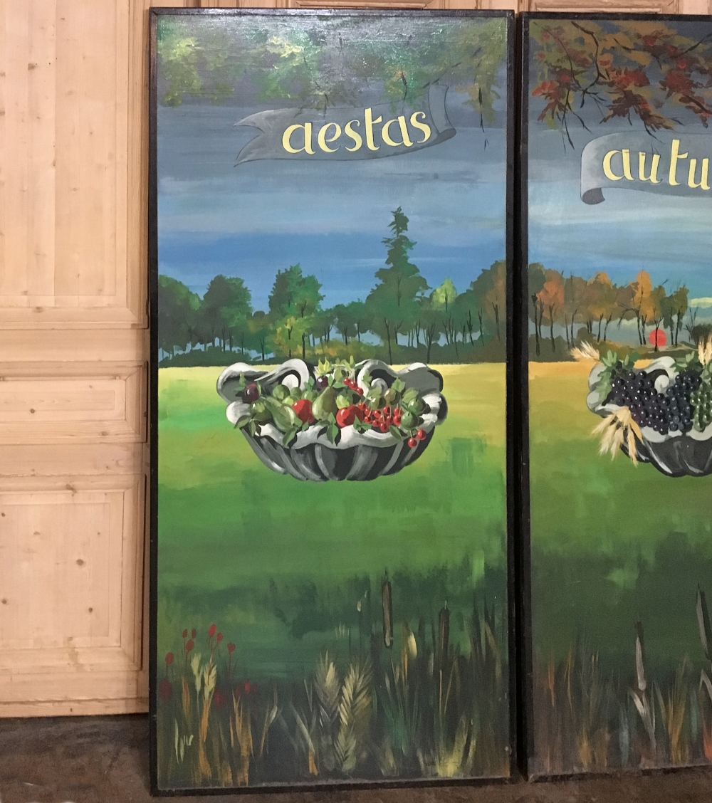 SaleMid-Century set of 4 Large Scale Four Seasons Paintings beautifully and colorfully represent the Four Seasons, with the seasons' names painted in script in Latin. This set can transform a wall into a mural, or accent individually in a room for a continuous theme, all starting with the click of your mouse! Each measures over 6 feet tall and over 3 feet wide, and can be placed side by side for a screen effect, or separated to create a lovely grouping or room adornment. The paintings depict the seasonal harvest typical to each time of year in the spirit of the cornucopia, or horn of plenty, or "bounty of the earth", with a stunning pastoral background making them exquisitely interesting and a literal visual feast for the eyes!