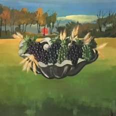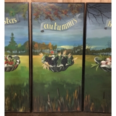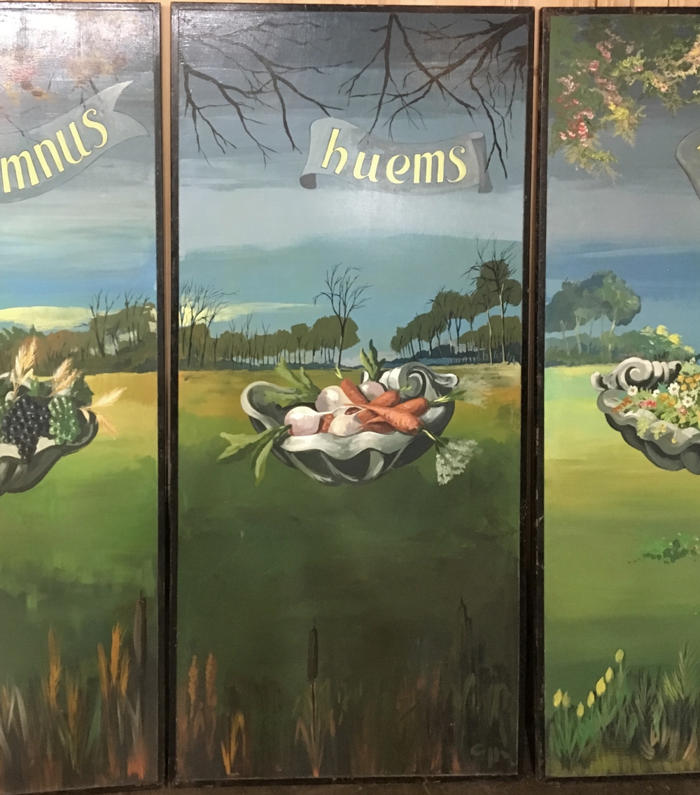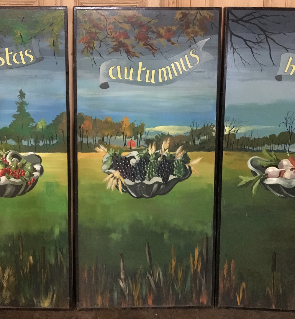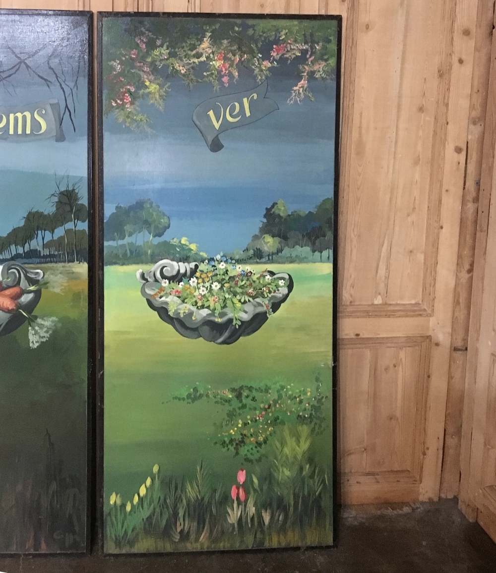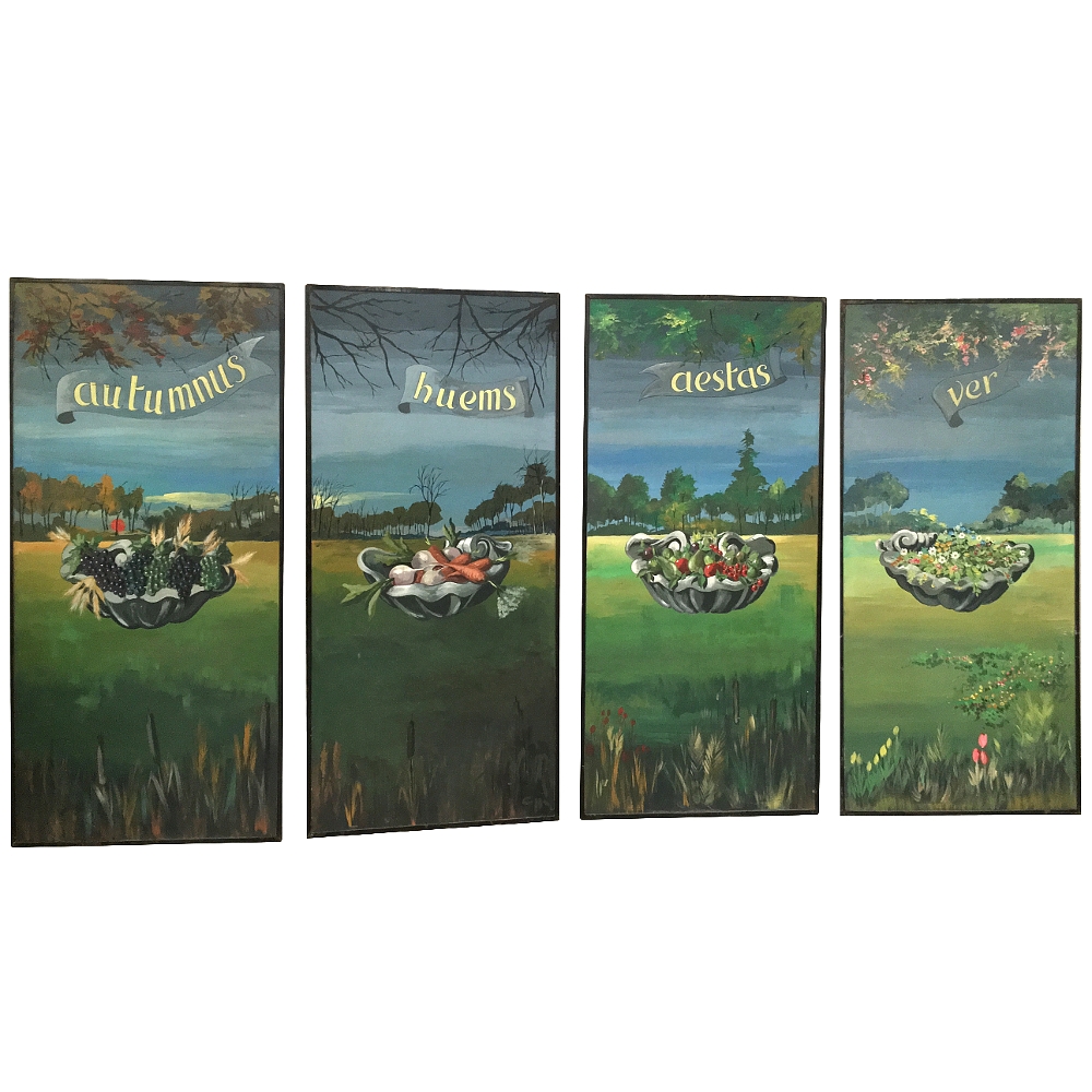 SaleMid-Century set of 4 Large Scale Four Seasons Paintings beautifully and colorfully represent the Four Seasons, with the seasons' names painted in script in Latin. This set can transform a wall into a mural, or accent individually in a room for a continuous theme, all starting with the click of your mouse! Each measures over 6 feet tall and over 3 feet wide, and can be placed side by side for a screen effect, or separated to create a lovely grouping or room adornment. The paintings depict the seasonal harvest typical to each time of year in the spirit of the cornucopia, or horn of plenty, or "bounty of the earth", with a stunning pastoral background making them exquisitely interesting and a literal visual feast for the eyes!