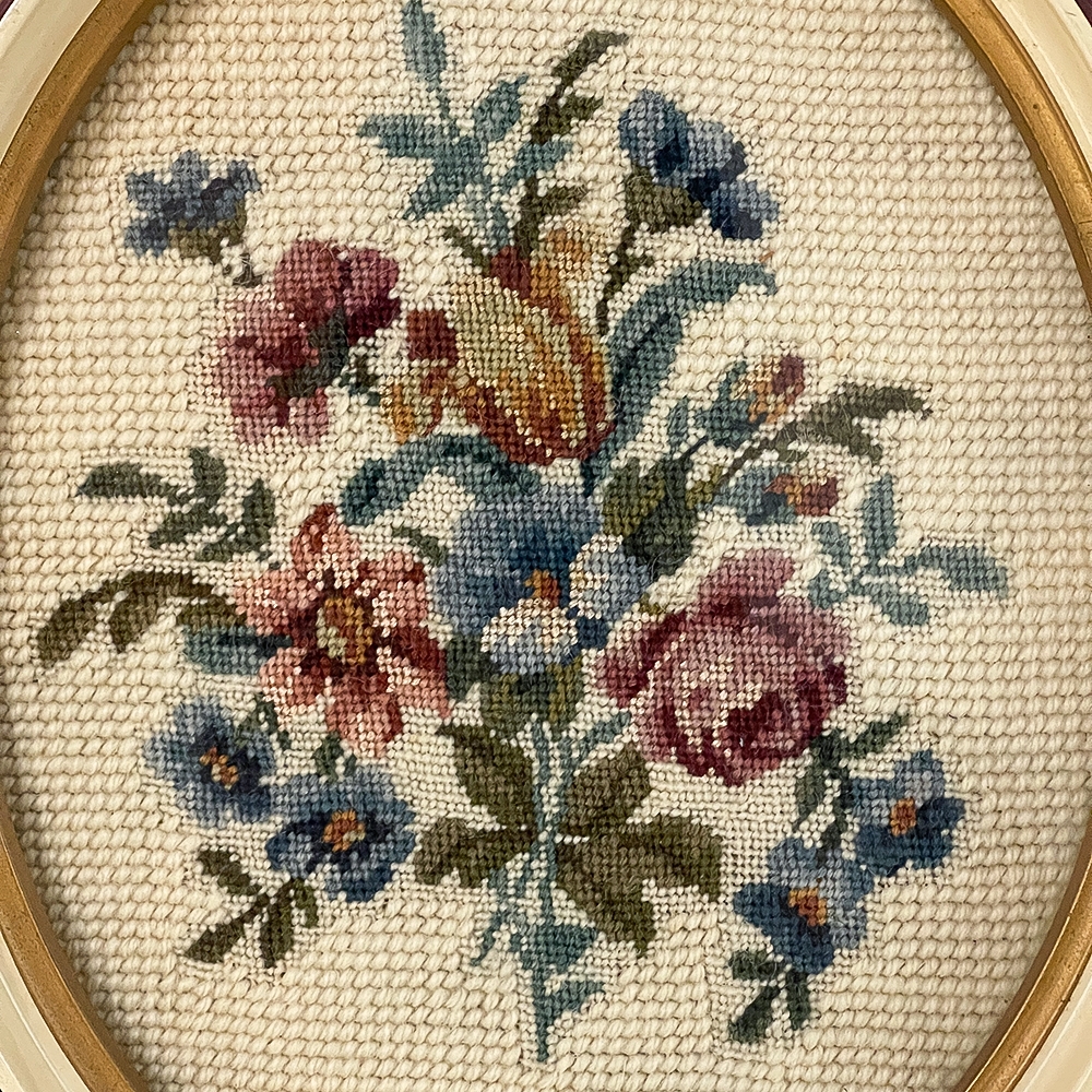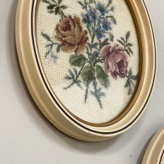 Pair Antique Needlepoint Works in Original Bakelite Frames are delightful works in needlepoint as well as petite point, creating wonderful detail using the coloration of the threads to create images. In this case, two distinct floral bouquets of wildflowers together with roses are the subjects. The natural earth tones coupled with the subtle, toned down jewel tones create a visually pleasing effect, and one can only imagine how much time was required to painstakingly stitch the artworks into the creations you see herein. Each survives in its original bakelite frame, dating the pair to the early 20th century, with Bakelite patented in 1907 by Leo Baekeland in Yonkers, New York.