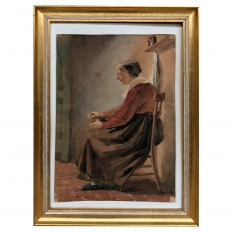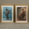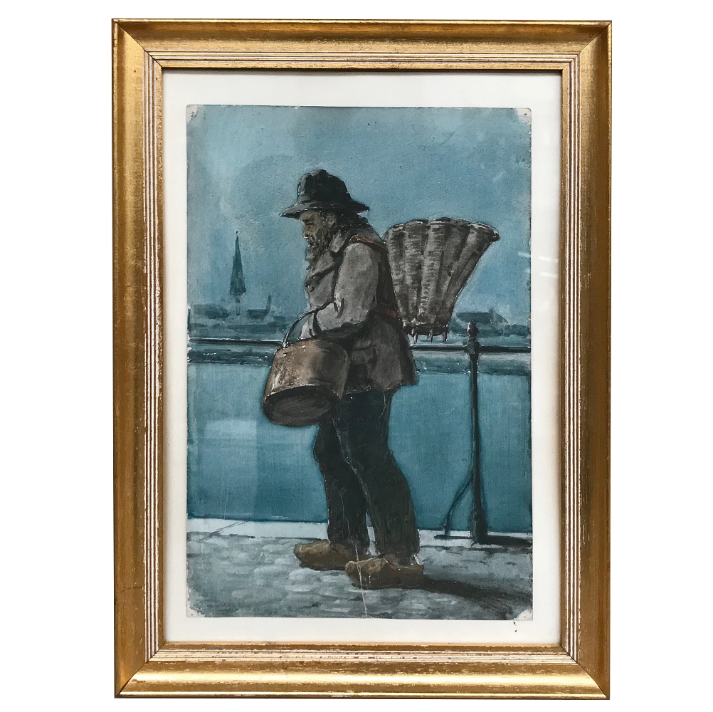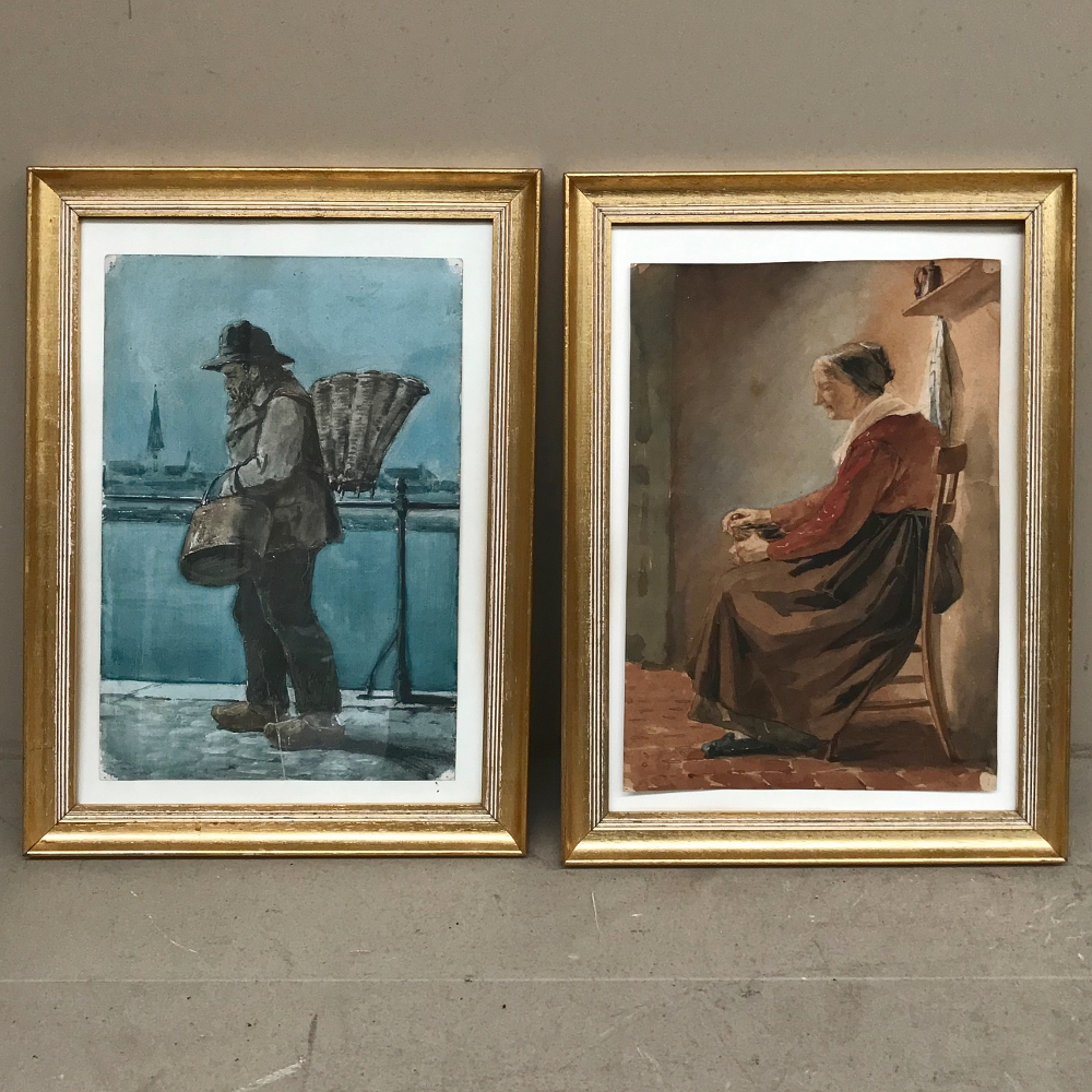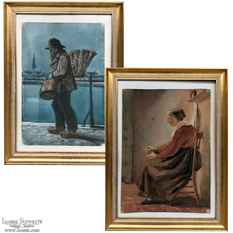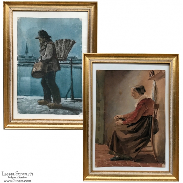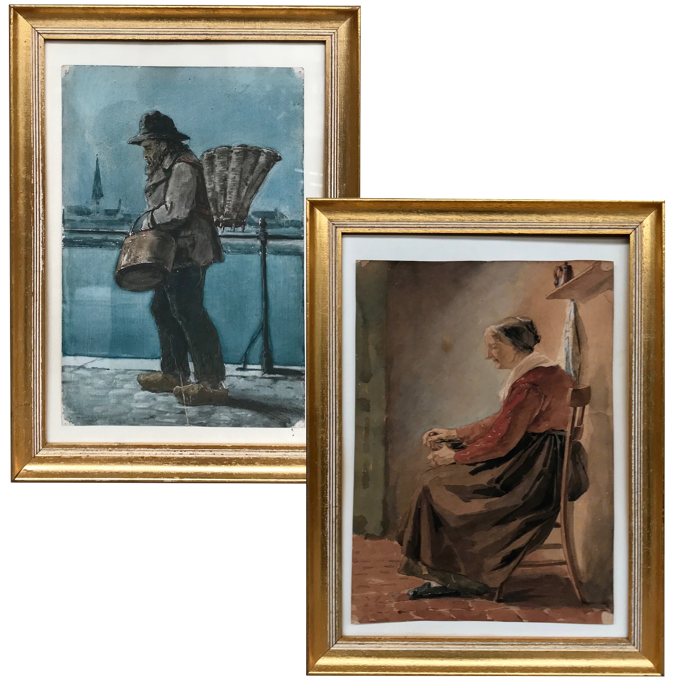 Pair Mid-Century Framed Gouache Paintings on Parchment by Firmen Boes depict a seasoned fisherman on the wharf with an arresting blue theme, and a matronly woman at home preparing her sewing. Both survive in their original frames, and sold only as a pair.