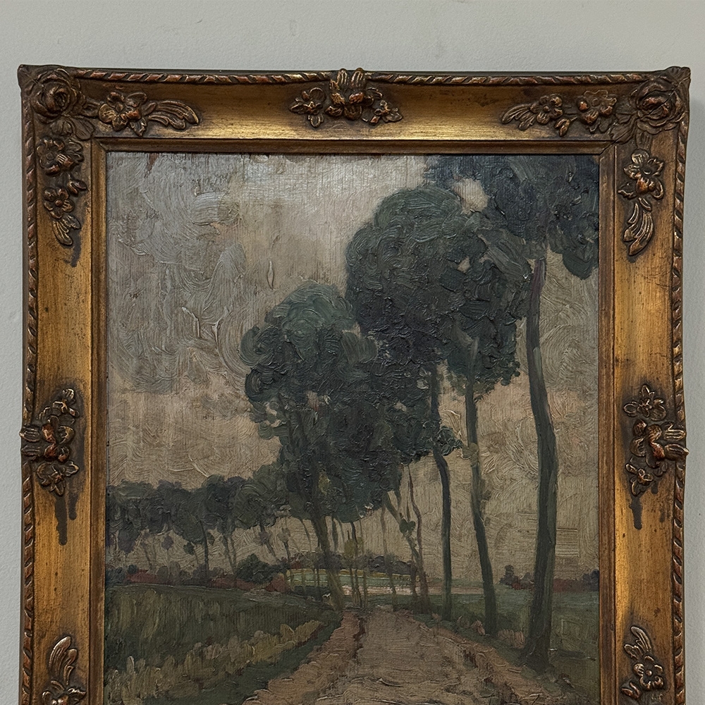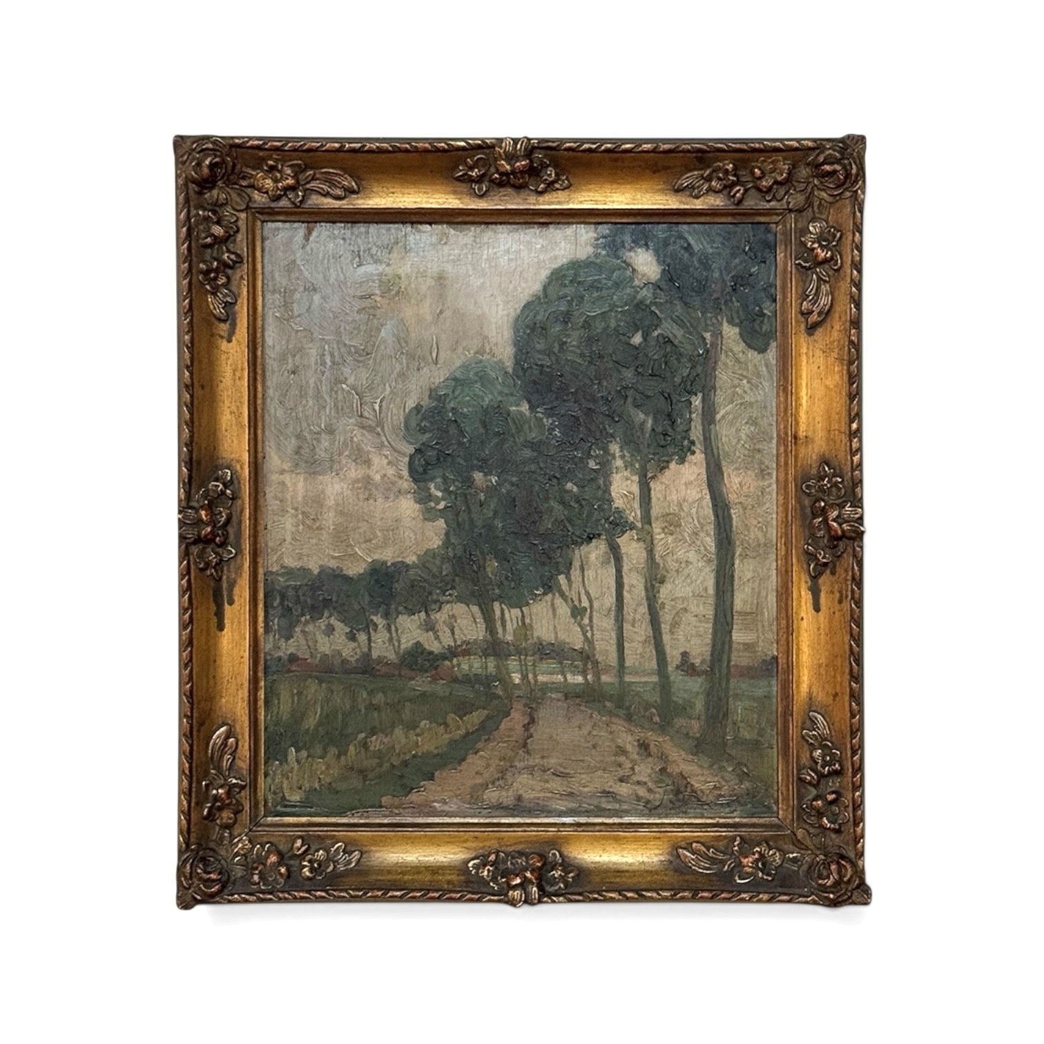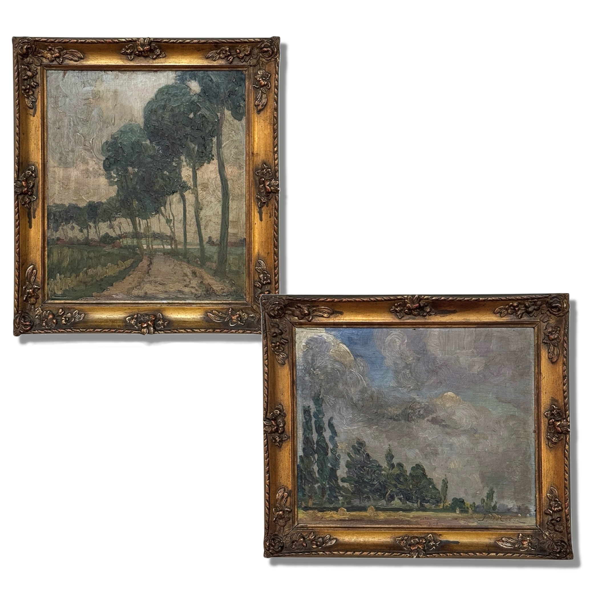 Set of 2 Framed Oil Paintings on Panel by Joseph F. DeCoene (1875-1950) is a complementary set of two landscape paintings on panel by the Belgian artist, each composition capturing a distinct moment in the quiet rhythm of the countryside. One presents a tree-lined path receding into the distance, with tall, wind-shaped trees guiding the eye through the landscape, while the other opens to a broader horizon beneath a softly shifting sky, where light and atmosphere take center stage.