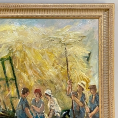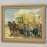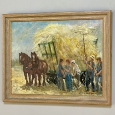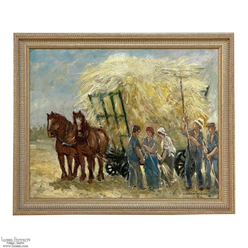 Vintage Framed Oil Painting on Panel by Dieudonne Damoiseaux (1918-2000) is a charming work depicting the hay harvest. Two steadfast steeds stand ready to draw the impressively full cart that thanks to its cargo of hay is not terribly heavy. A group of farmers gather around the cart as the last bit of hay is tossed to the top, ready to take a short break before beginning the task anew on the next empty cart. Such works glorify the rigors versus the pleasures of rural life, and the simple pleasures that such an existence can bring.