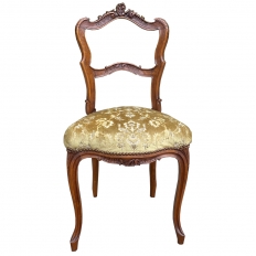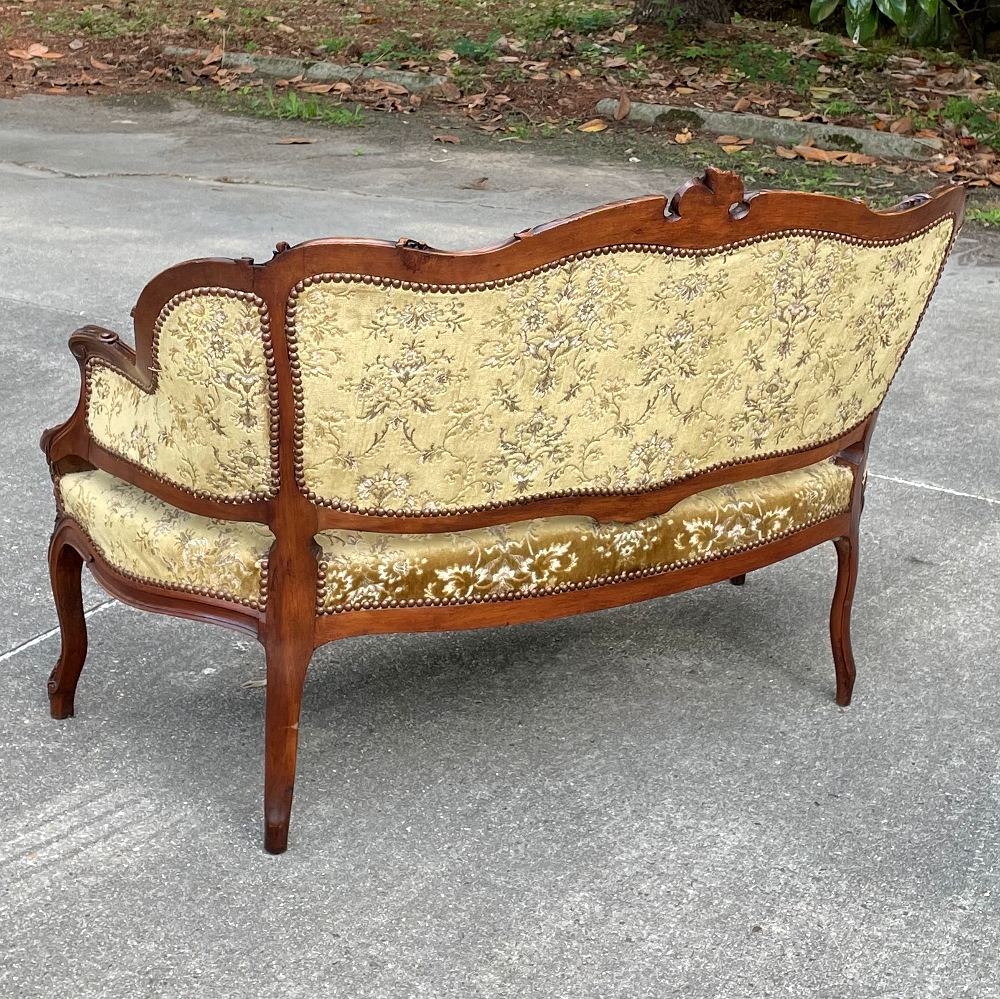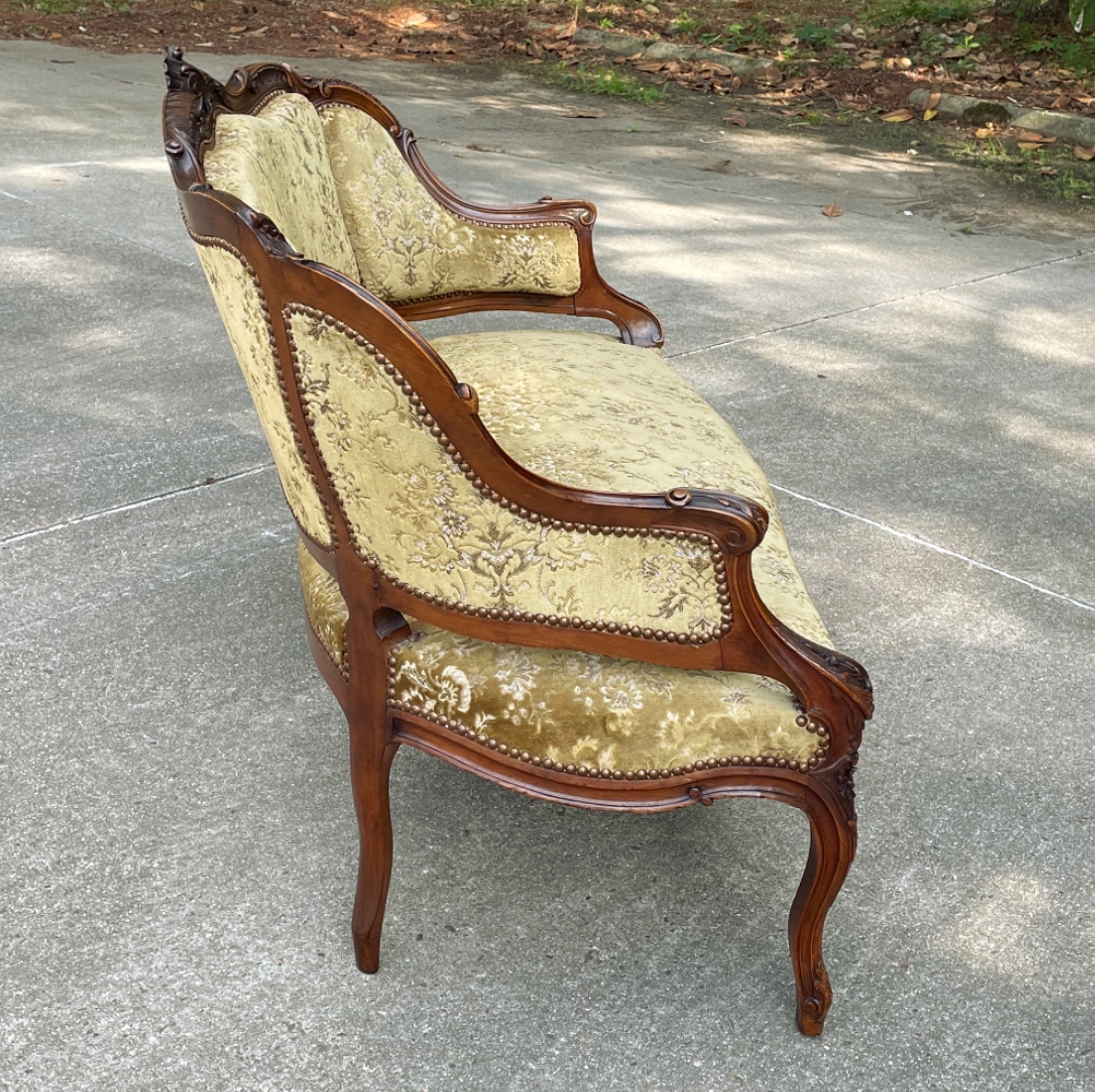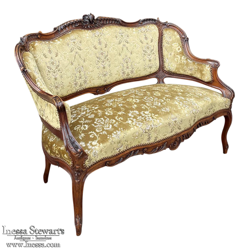 19th Century French Louis XV Walnut Canape represents the epitome of the style! Rendered from select, sumptuous French walnut, it features naturalistic, contoured lines from the triple arched seatback crown to the finely tapered and carved cabriole legs. The armrests scrolled down then join with the seat framework with effortless elegance. The entire visible framework from the front has been lavished with stylized shell, floral and foliate motifs in a delightful expression of the Rococo style, made even more exquisite by the sheer natural beauty of the highly sought-after indigenous wood. Upholstered in a damascene velvet which is in very good condition, it will immediately become a fixture of flair in any room!