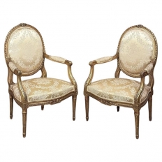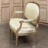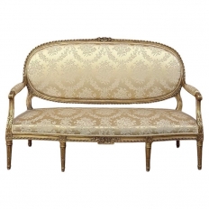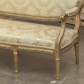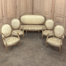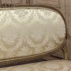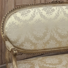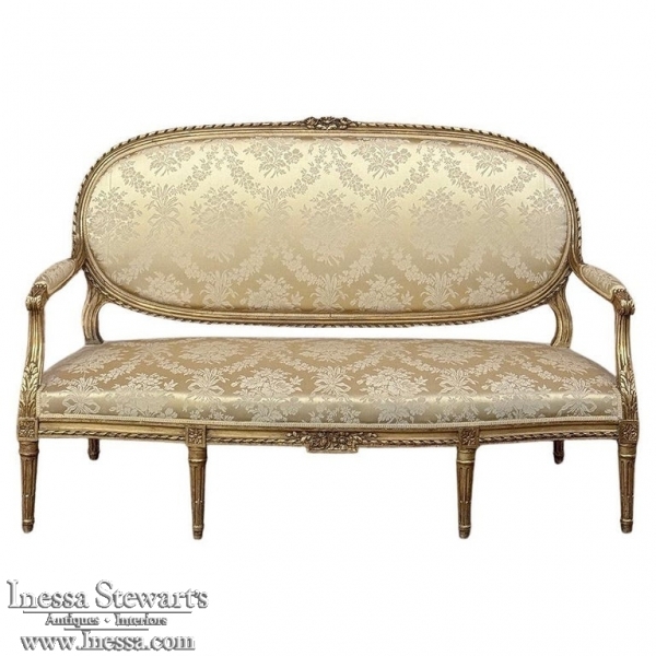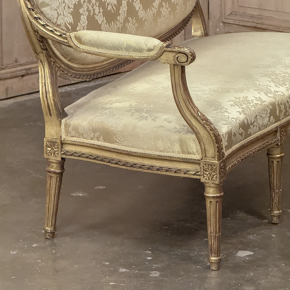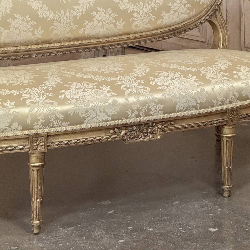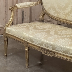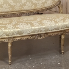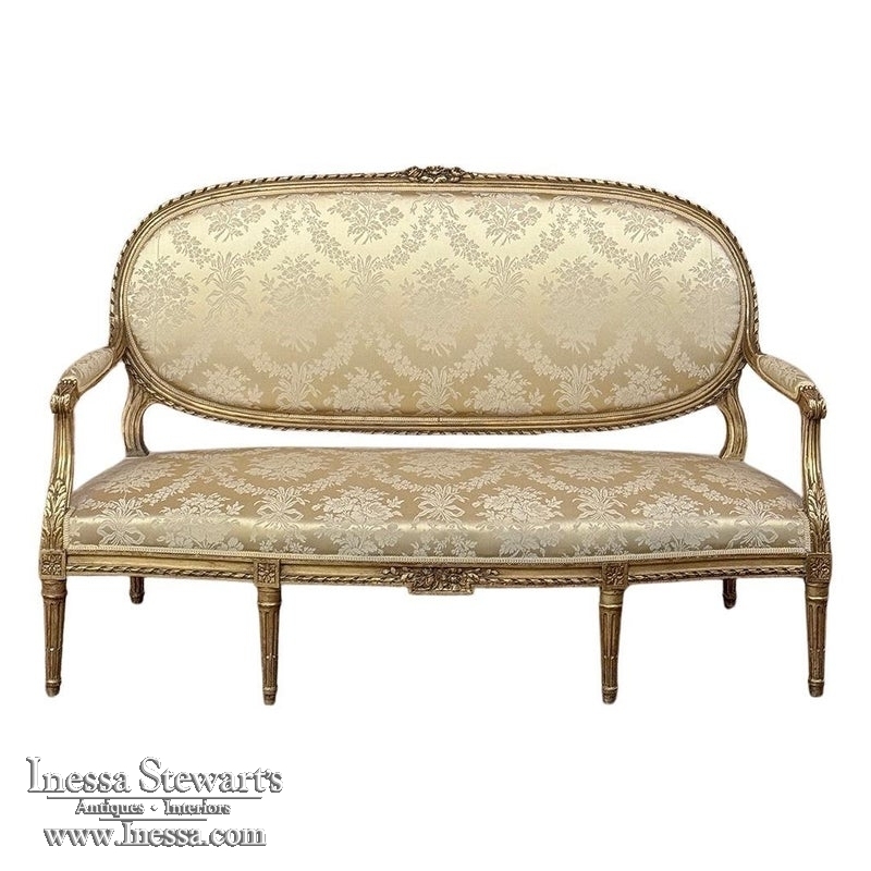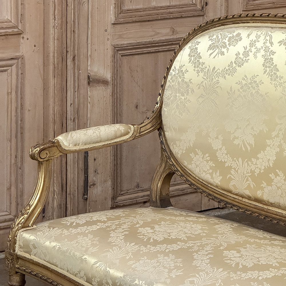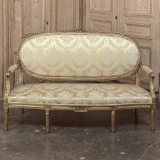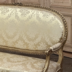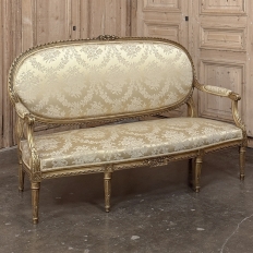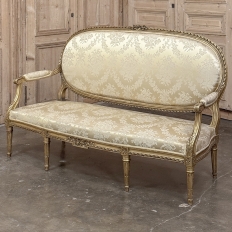 19th Century French Louis XVI Giltwood Sofa ~ Canape will make a splendid addition to any room! Hand-crafted from select hardwood then given a gilt finish, its frame is hand-carved with floral, spiral ribbon and acanthus leaf motifs. The oval seat back adds comfort and visual appeal, while the generous seat is framed by the same trim accented with square rosettes which appear atop each of six tapered, fluted and reeded legs. Silk damask upholstery is in very good shape and only adds to the elegance. If you act fast, a matching pair of armchairs (fauteuils) and a matching pair of chairs are still available as of this writing. See Related Products below left.