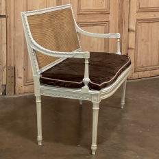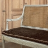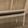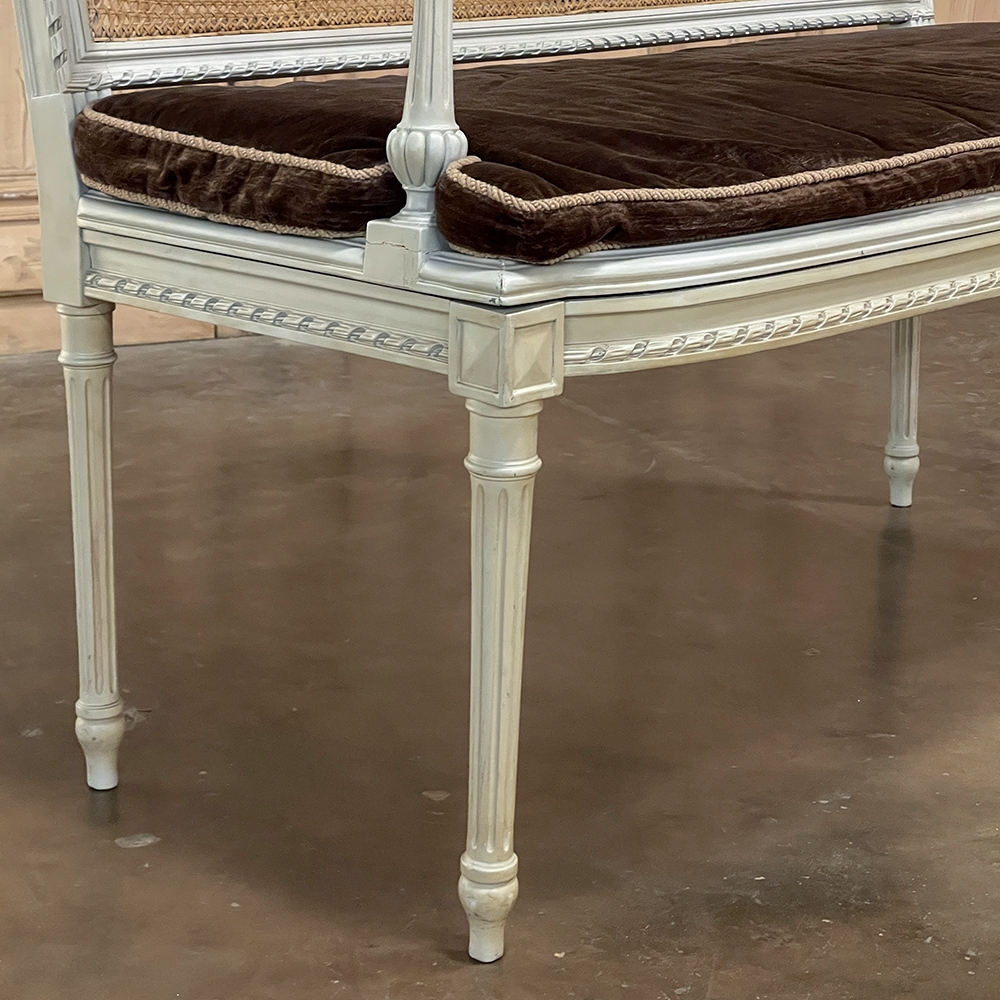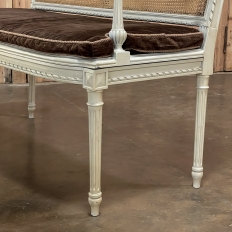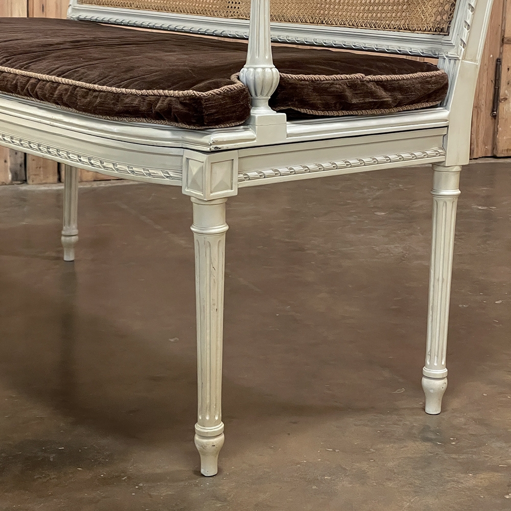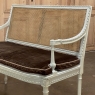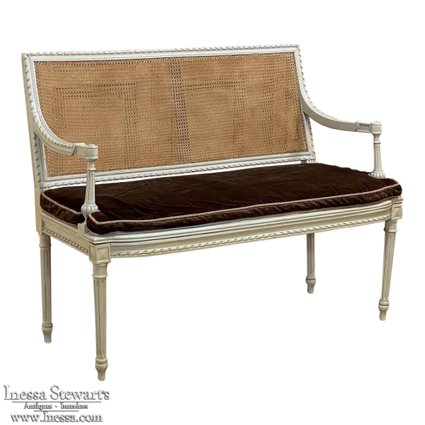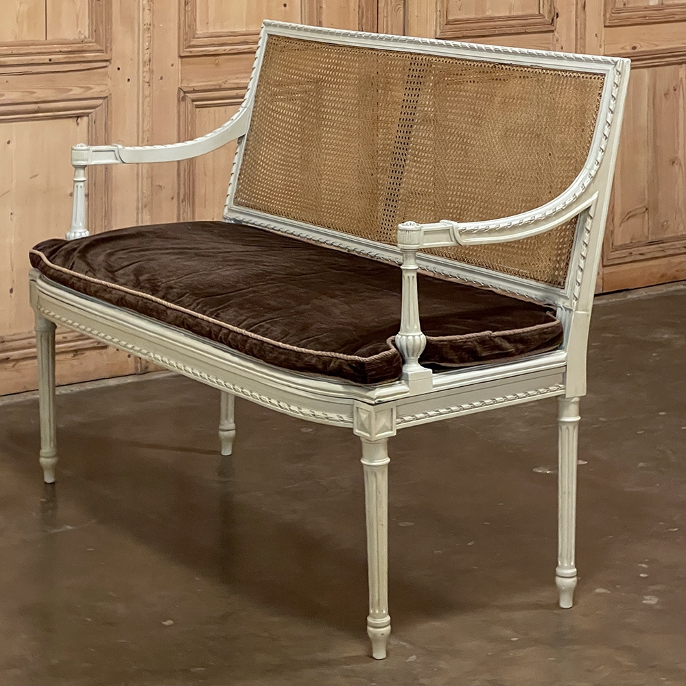 19th Century French Louis XVI Painted Canape with Cane & Cushion is an excellent choice for an intimate seating group! The combination of neoclassical styling, timeless architecture, and caned seat and seat back produce a light weight, attractive piece you'll cherish for decades to come. Spiral ribbon trim abounds encircling the entire seatback, continuing down the armrests to the support which is a tapered and fluted column topped with a rosette. Spiral ribbon also appears along the base of the apron, which is supported by tapered and fluted column legs. The painted finish has achieved a lovely patina over the decades, enhancing the fine carved detail even more. A custom cushion in mohair survives with the piece, and is in serviceable condition, but more importantly protected the seat for years, making this an instant family heirloom for some lucky customer!