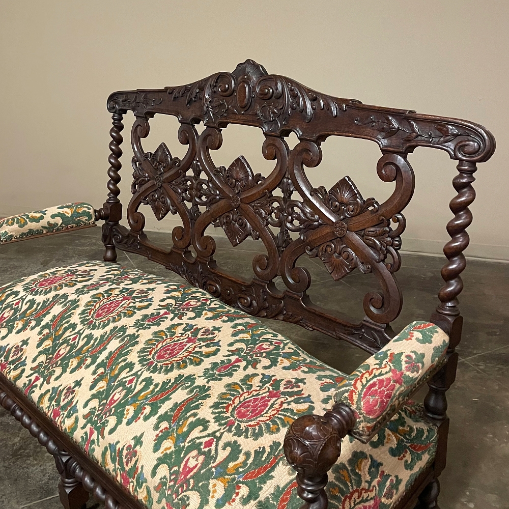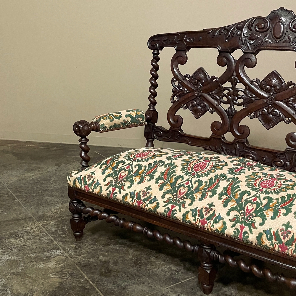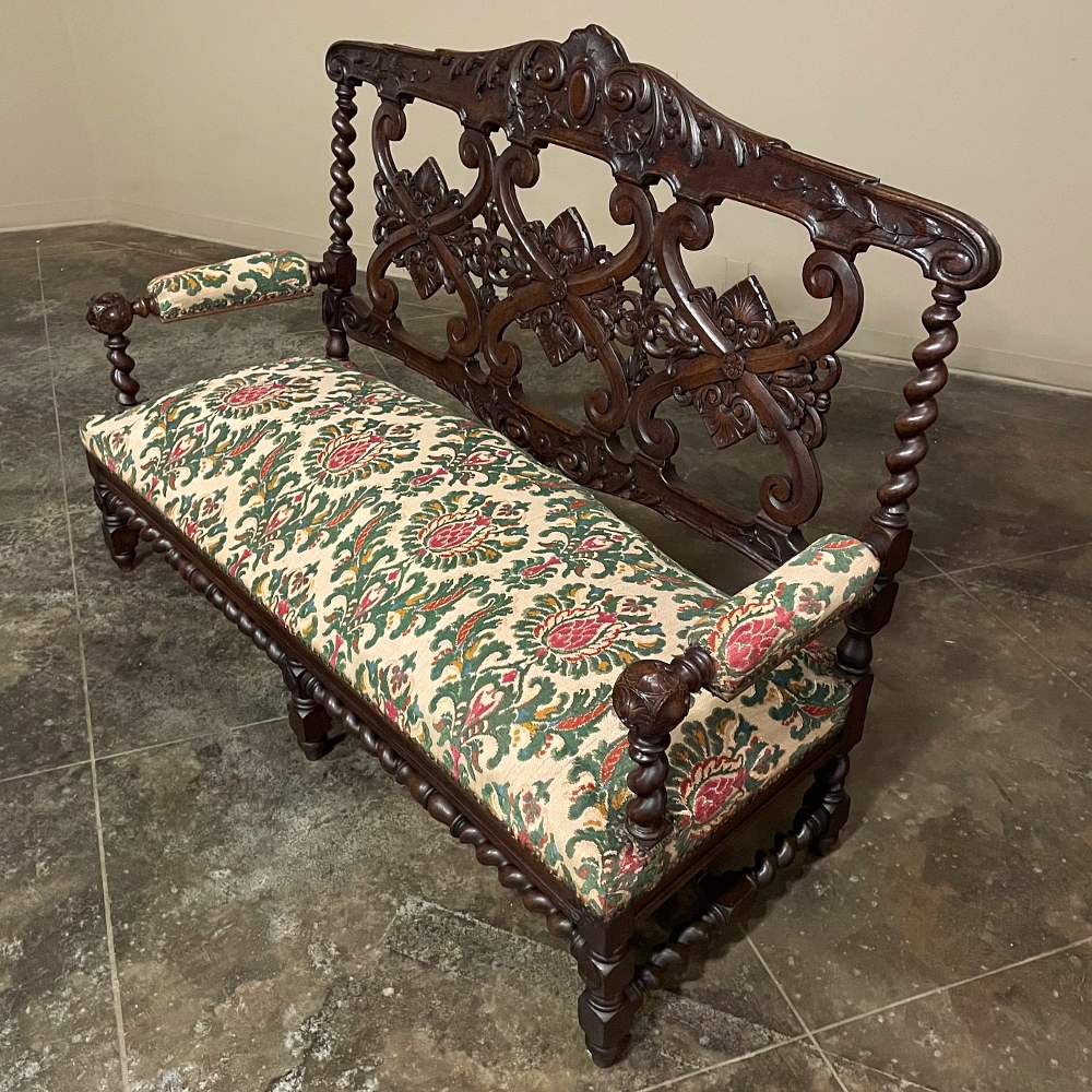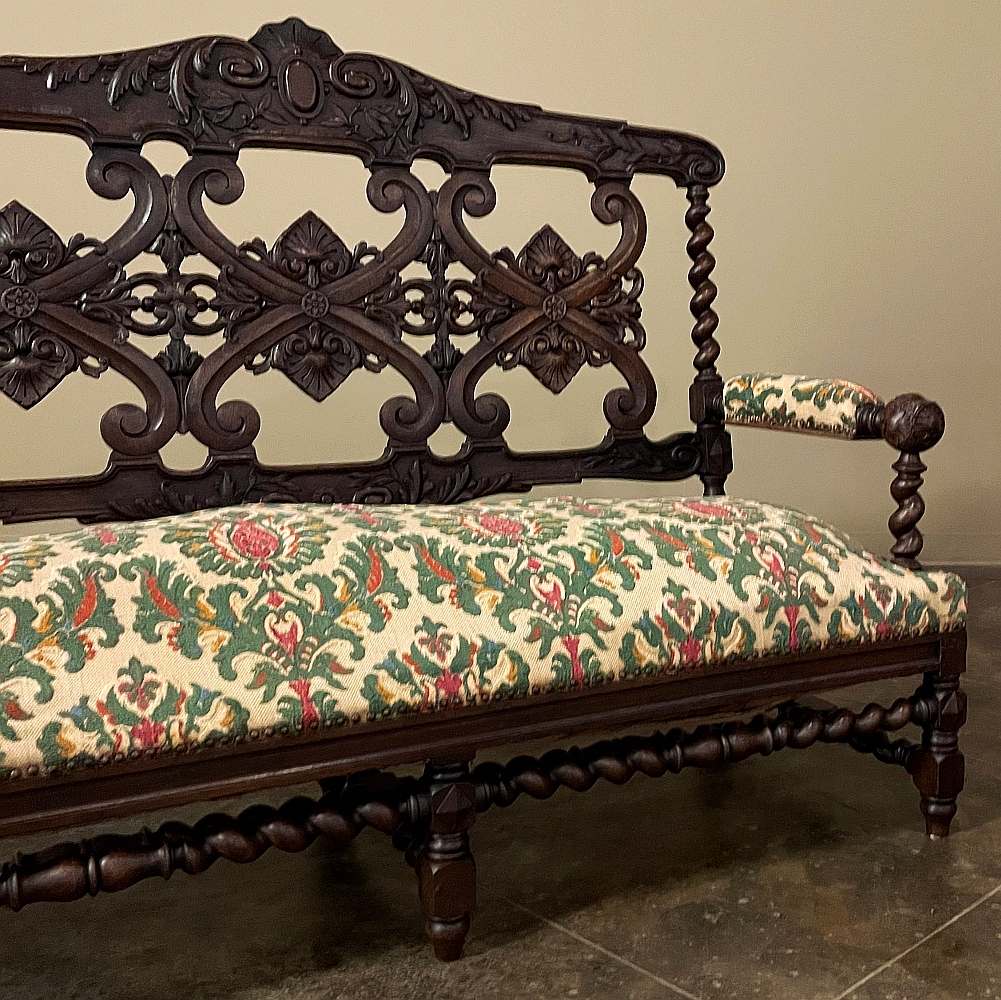 19th century Renaissance Revival sofa crafted in solid oak and executed in the enduring Louis XIII style. The architectural frame is defined by bold barley twist supports, turned stretchers, and a richly carved crest rail adorned with scrolling foliate ornament. The openwork back features symmetrical Renaissance motifs that lend refinement while preserving the strength and dignity characteristic of the period.