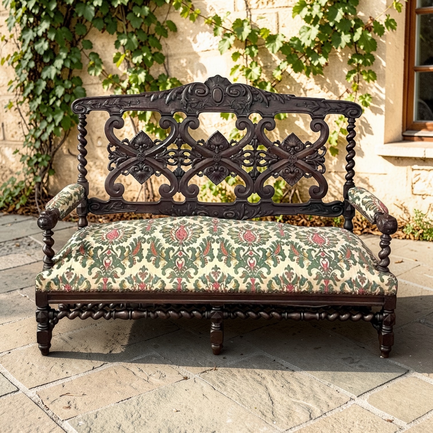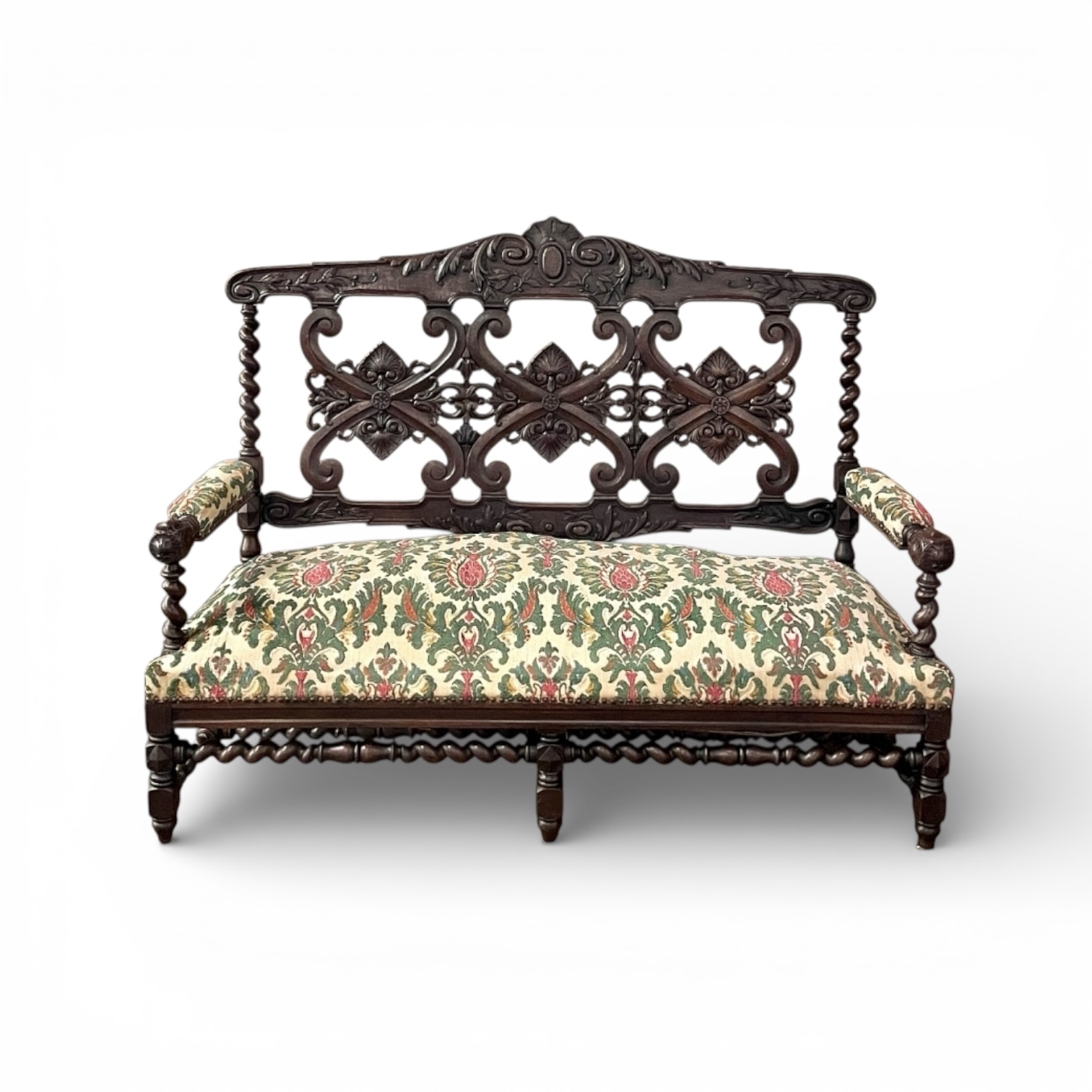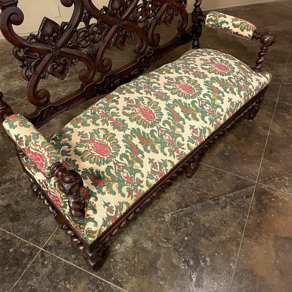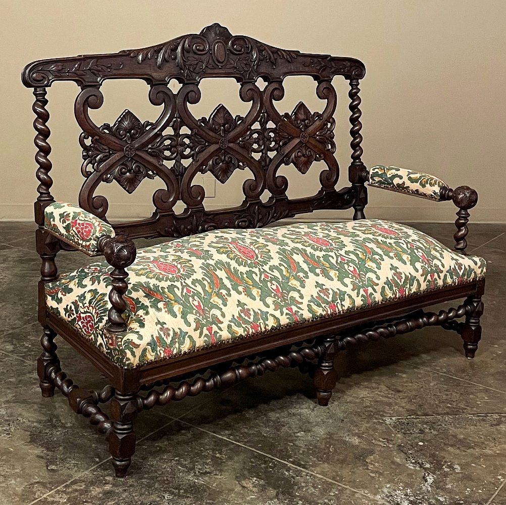 19th century Renaissance Revival sofa crafted in solid oak and executed in the enduring Louis XIII style. The architectural frame is defined by bold barley twist supports, turned stretchers, and a richly carved crest rail adorned with scrolling foliate ornament. The openwork back features symmetrical Renaissance motifs that lend refinement while preserving the strength and dignity characteristic of the period.