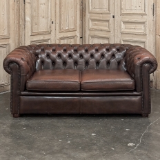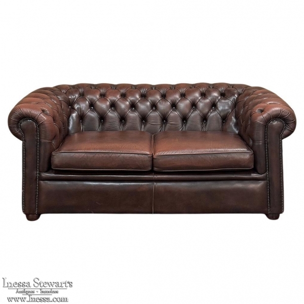 Vintage Tufted Leather Chesterfield Sofa is a design that has defined the essence of comfort for over 75 years and remains popular even today thanks to its classic lines! Tufted leather helps the back to "breathe" with heavily padded rolled armrests adding more upper body comfort. The pair of thick cushions let you nestle in to enjoy your favorite movie, football game or family event. Completely upholstered all around it can "float" in the middle of the room if so desired.
