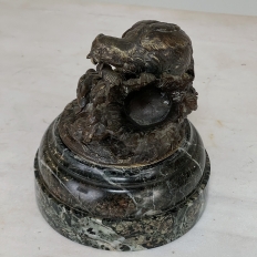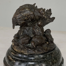 Sale19th Century French Bronze Sculpture of Nesting Quail on Marble Base will make the perfect decoration for desktop, bookcase, mantel, counter or buffet. It will also make a stunning paperweight for the executive in your family! Depicting a quail hen feeding her young, it is a classic representation of the celebration of nature during the Belle Epoque period, while simultaneously glorifying the family unit, a concept that holds forth for almost all life on this planet. Meticulously sculpted in great detail, the family is seen next to an old fallen branch on the forest floor in a wonderfully lifelike scenario. Cast in the round, it has been custom fitted and mounted on a richly veined beveled marble base.